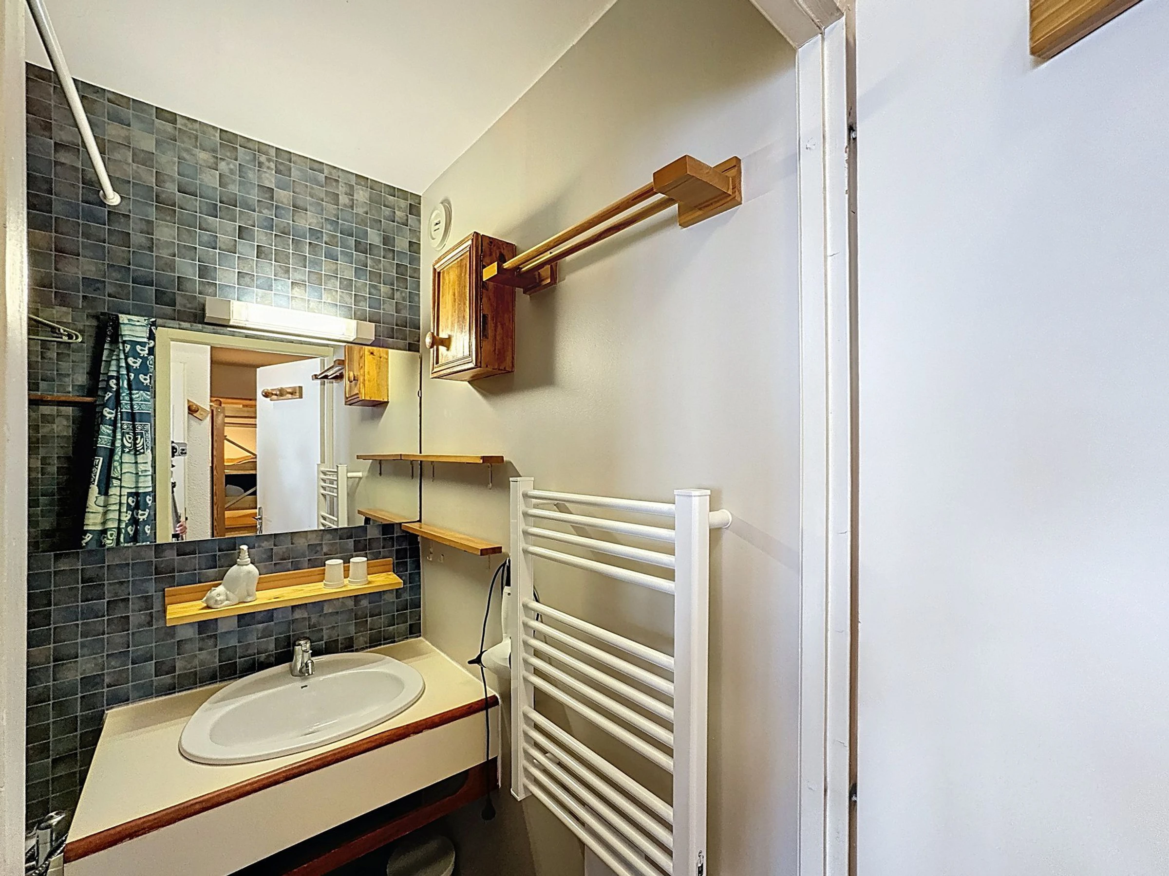 Salle de bains : lavabo, baignoire, rideau de douche, sèche-serviettes, sèche cheveux.
