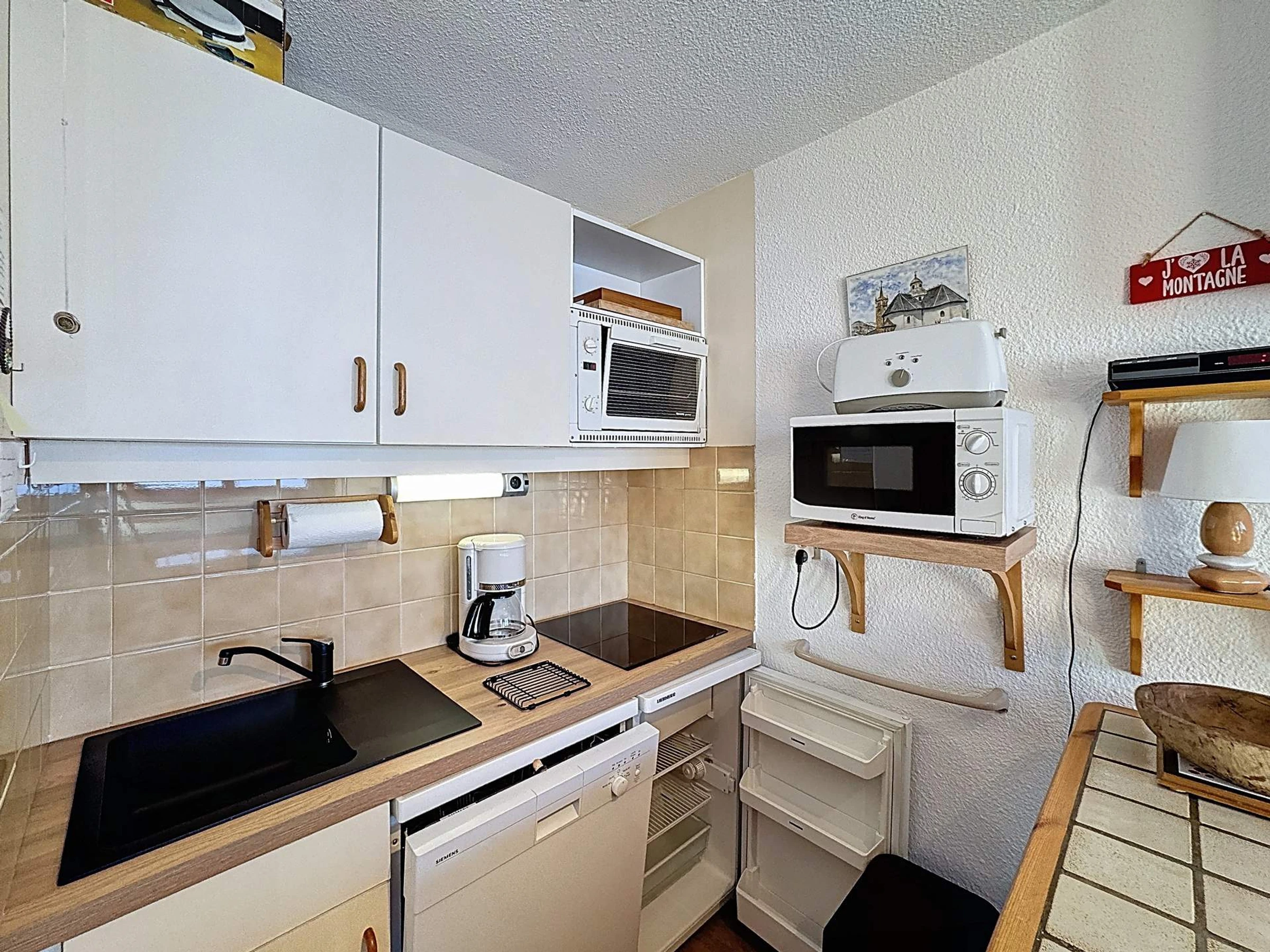 Cuisine : 2 plaques inductions, micro-ondes, mini-four, réfrigérateur, lave-vaisselle, cafetière électrique, appareil à raclette.
