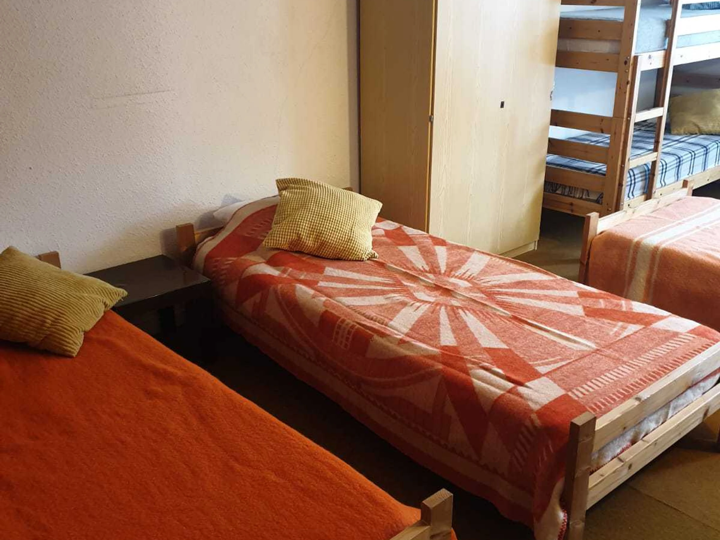 Chambre 2 à l'étage avec 3 lits simples et 2 lits superposés.