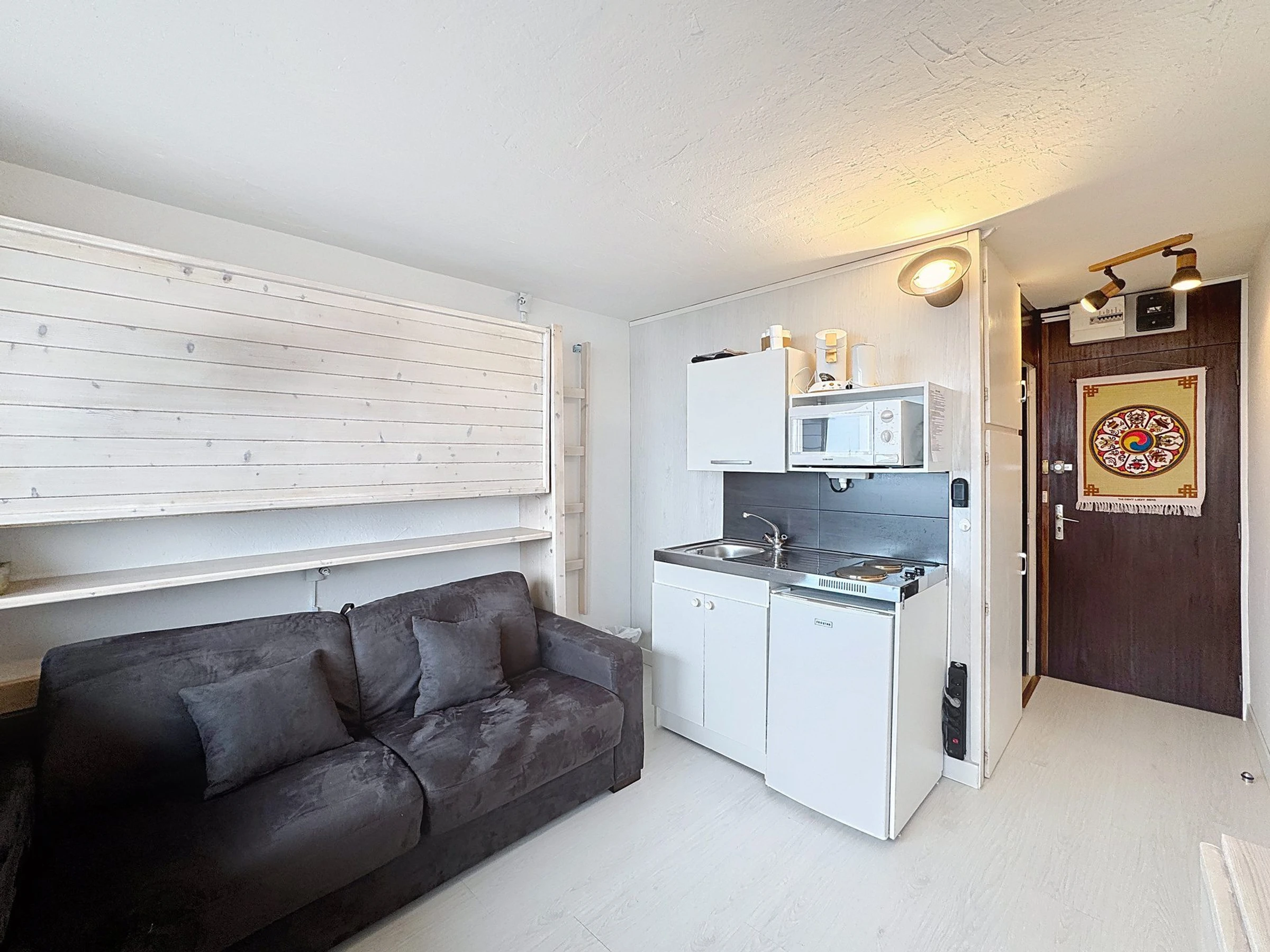 kitchenette : 2 plaques électriques, micro-ondes, réfrigérateur; cafetière Senseo, Séjour : Canapé convertible (140x190cm) Télévision