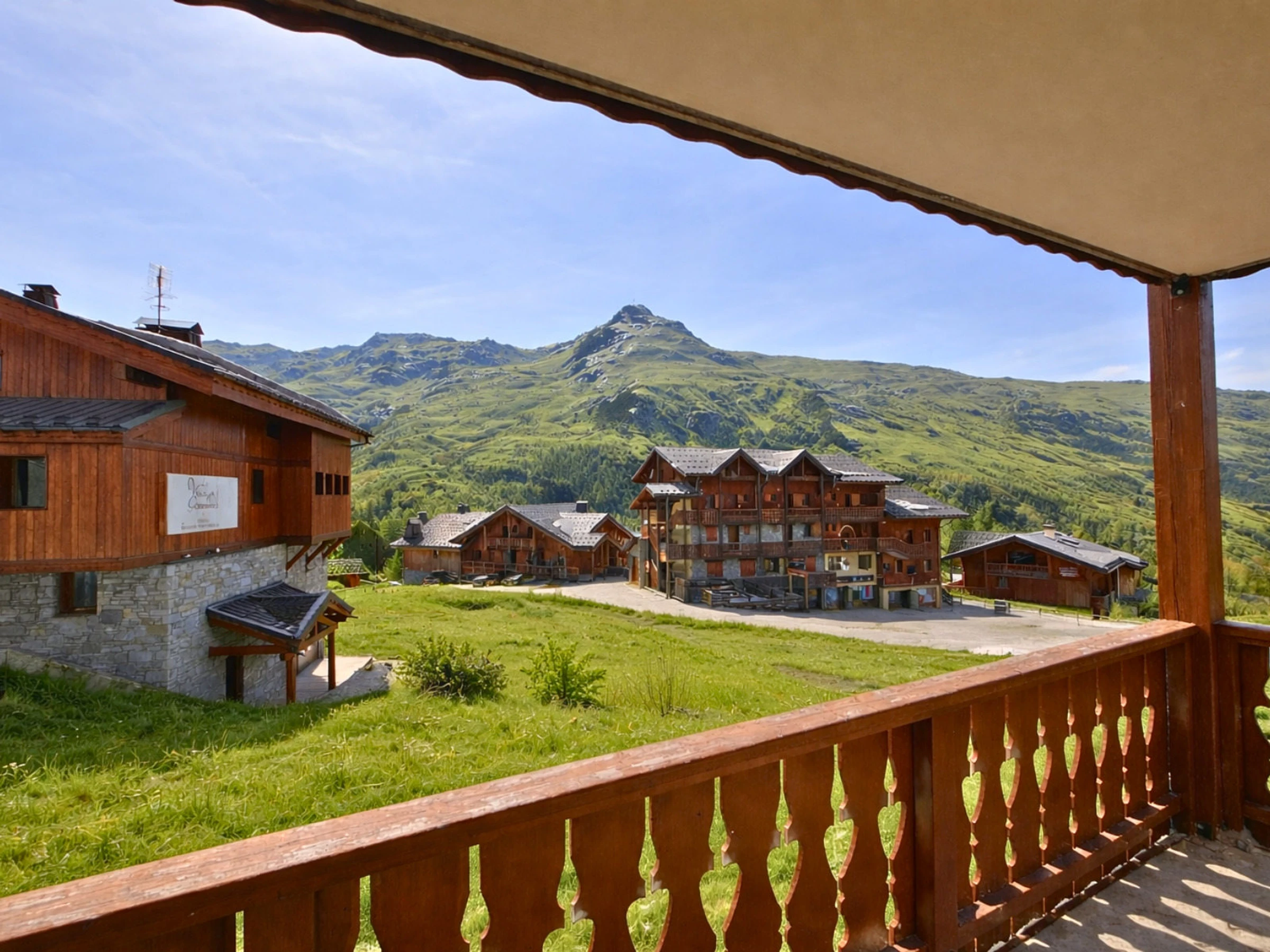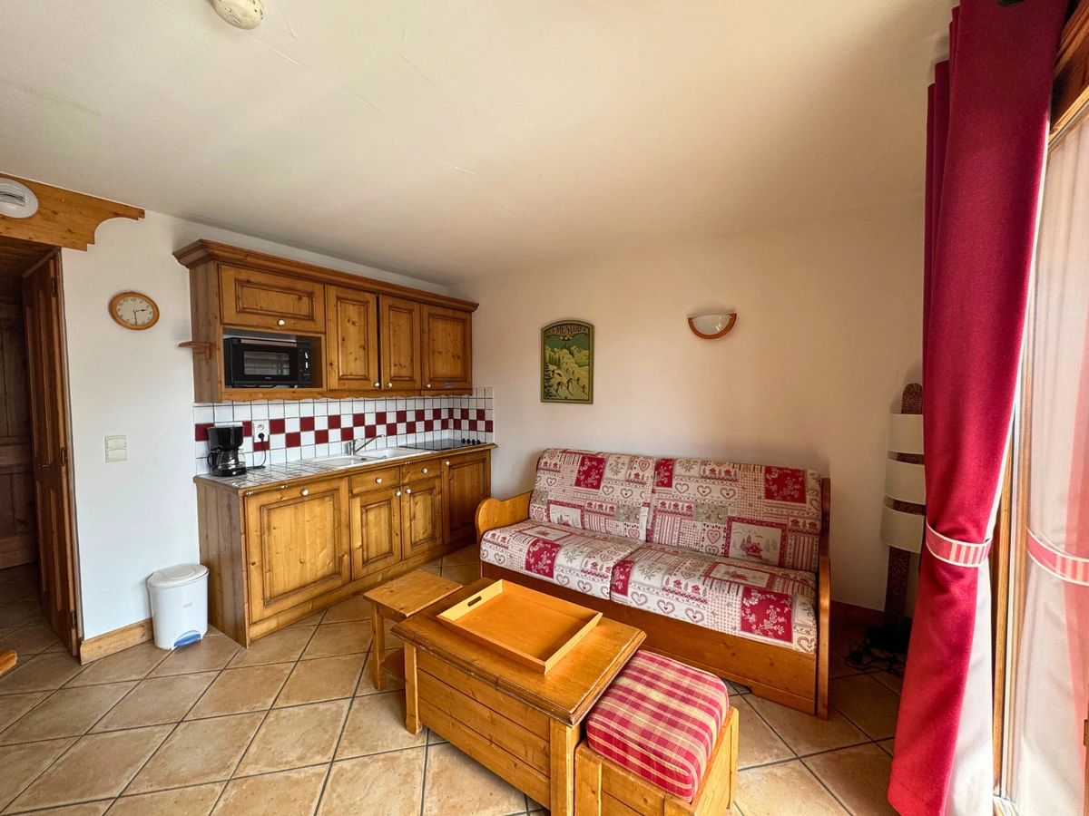 Résidence le Hameau des Airelles bâtiment Ancolie (N°11), 2 pièces cabine pour 4 personnes 35m², au Rez-de-chaussée, balcon exposé Ouest, vue dégagée sur La Masse et la Vallée des Belleville.