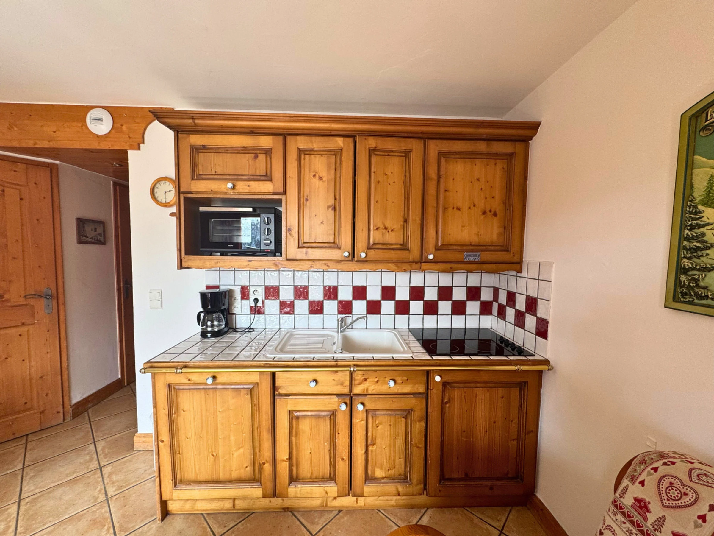 Cuisine ouverte sur le séjour : plaques vitrocéramiques (x4), four, réfrigérateur, lave-vaisselle, cafetière, bouilloire, grille-pain