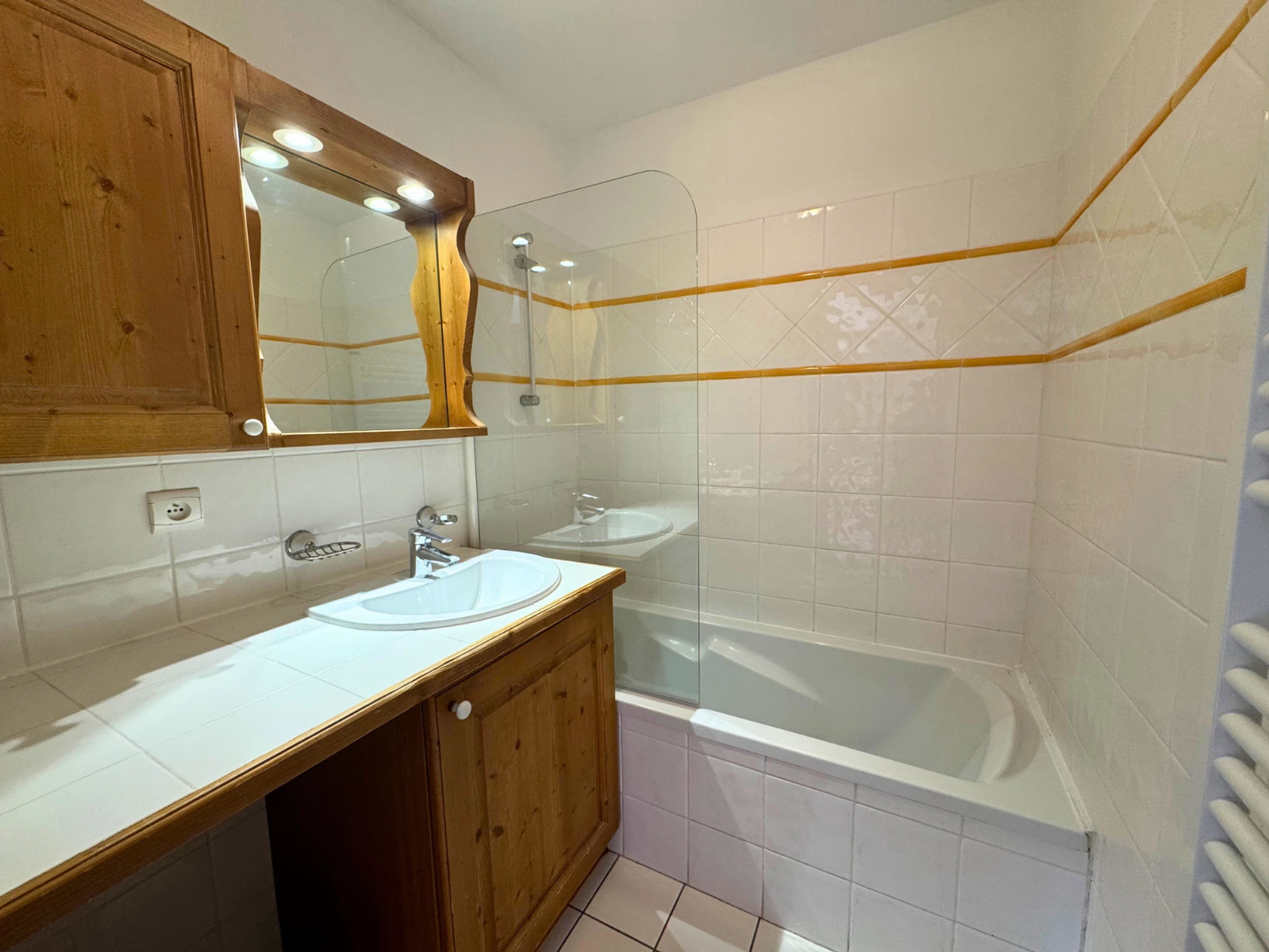 Salle de bains : lavabo, baignoire, sèche serviette.