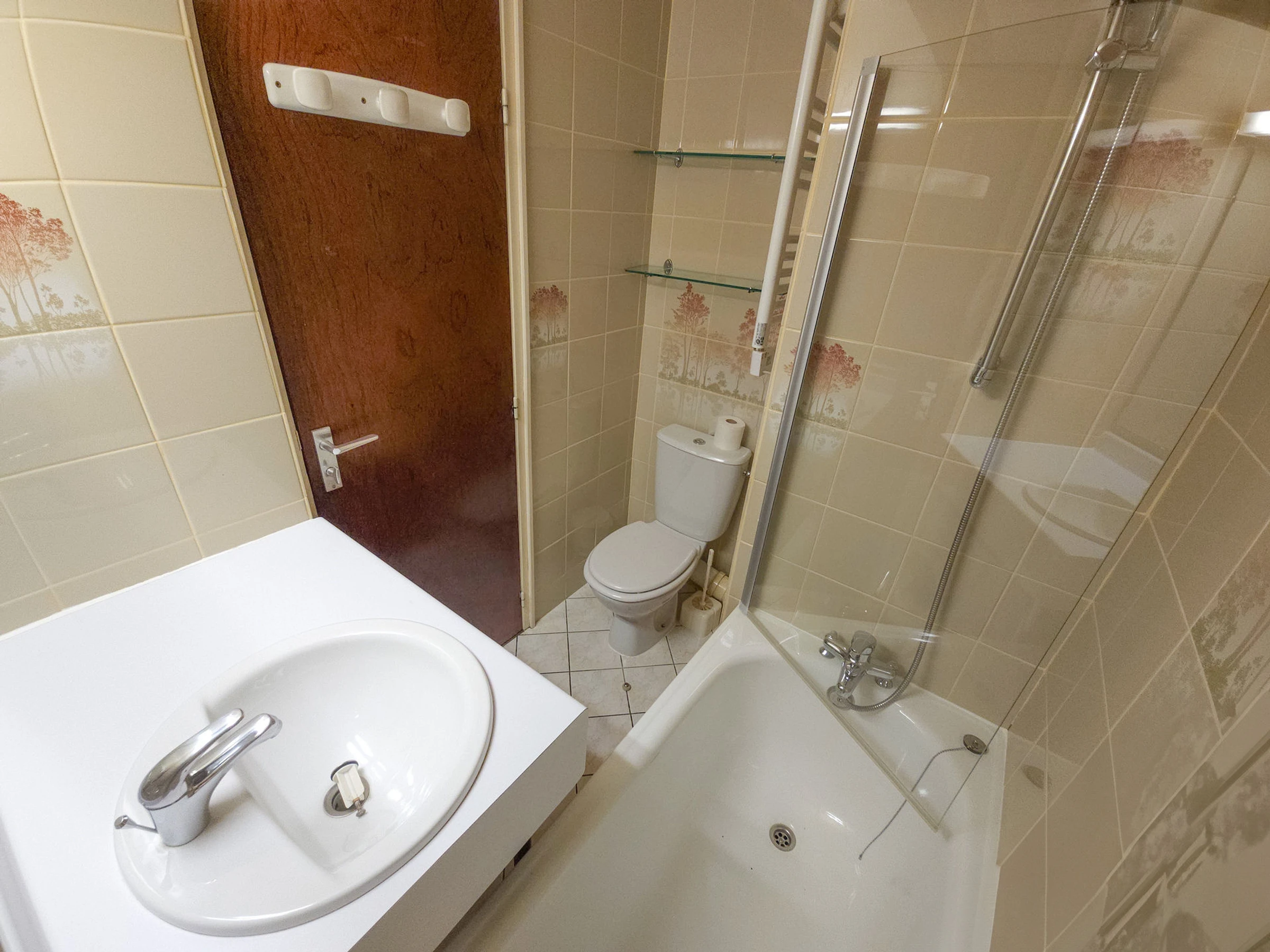 Salle de bains : lavabo, baignoire, sèche serviettes, sèche-cheveux, toilettes, lave-linge 3kg