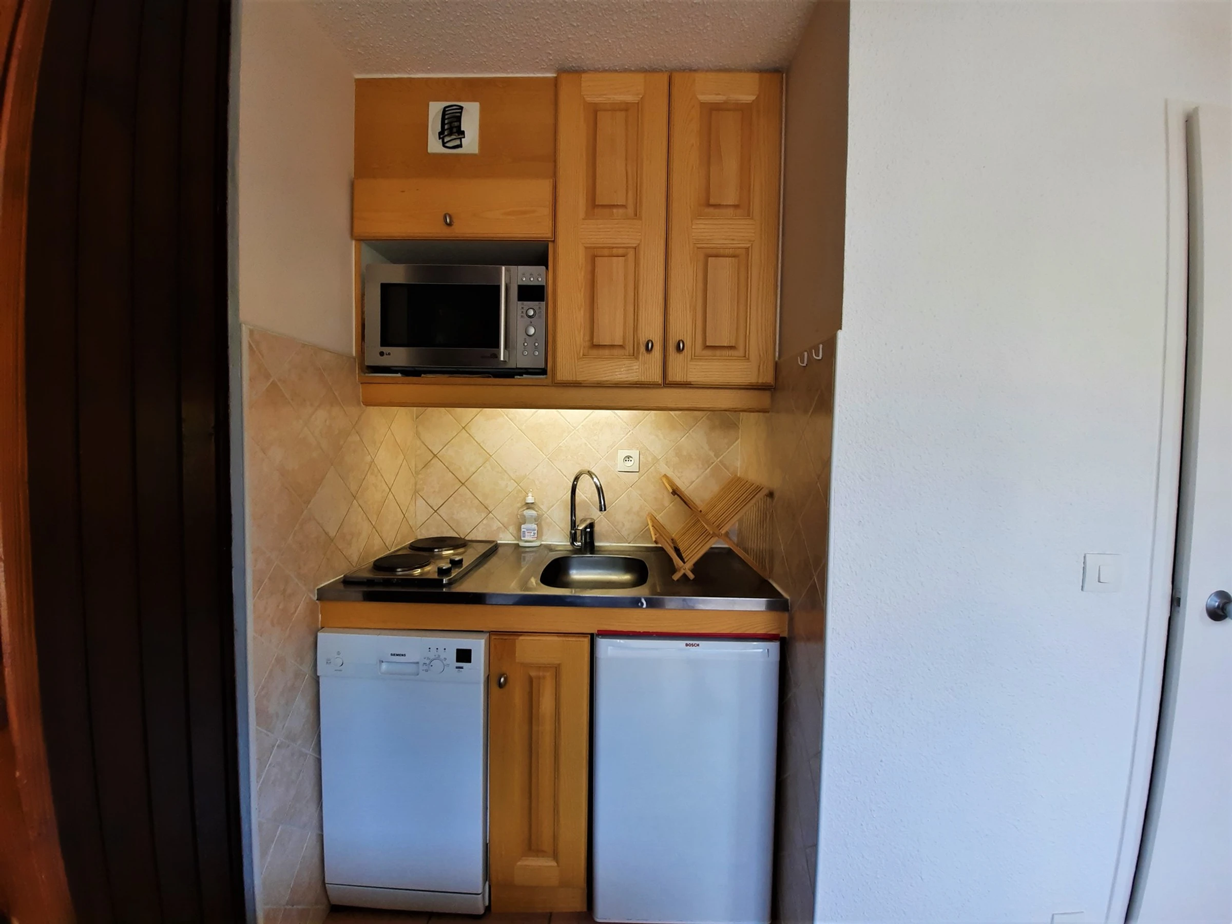 Cuisine : plaques électriques (x2), four combi grill micro-ondes, réfrigérateur, lave-vaisselle, cafetière