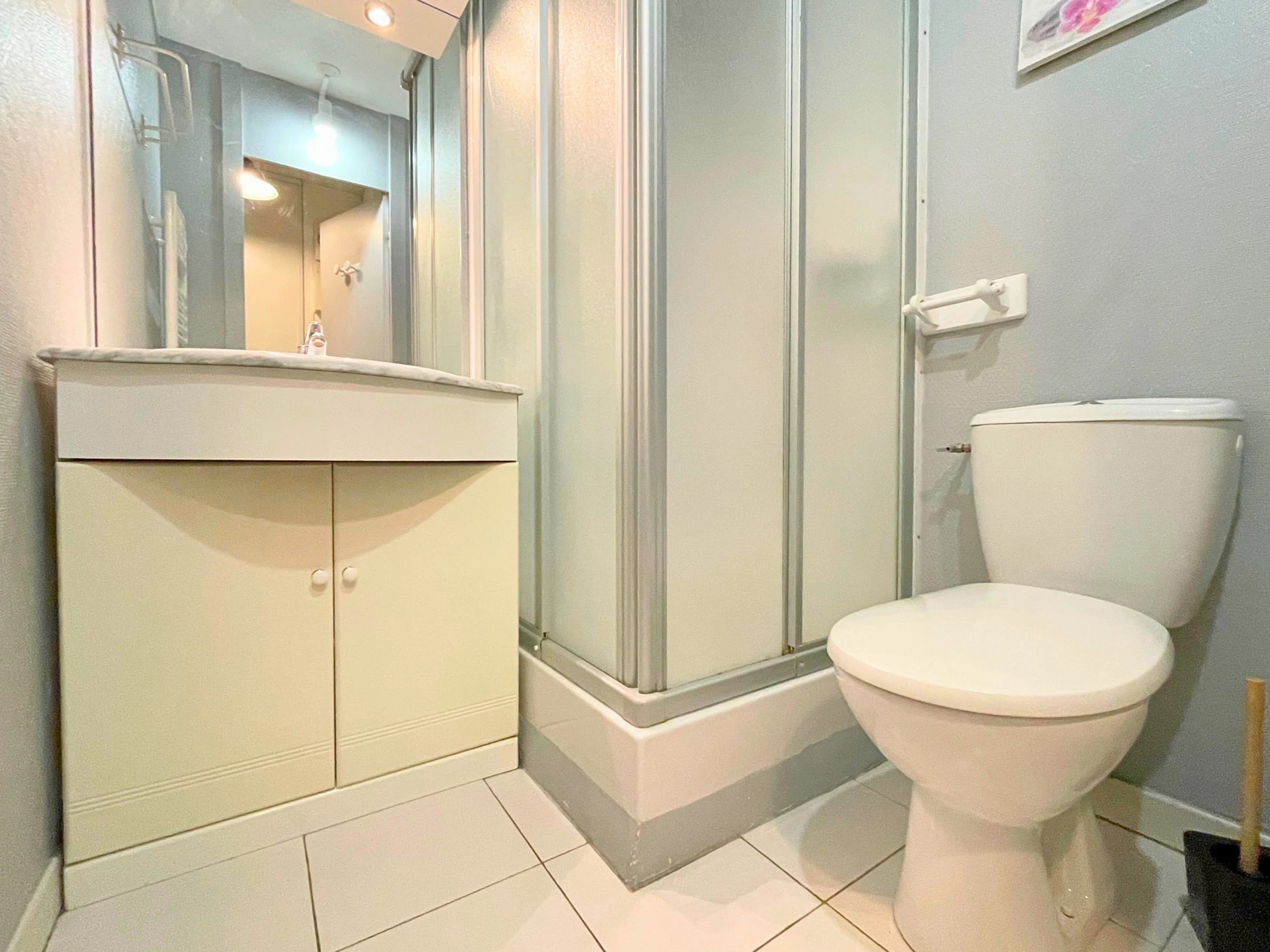 Salle de bains : lavabo, douche, sèche-serviettes, toilettes