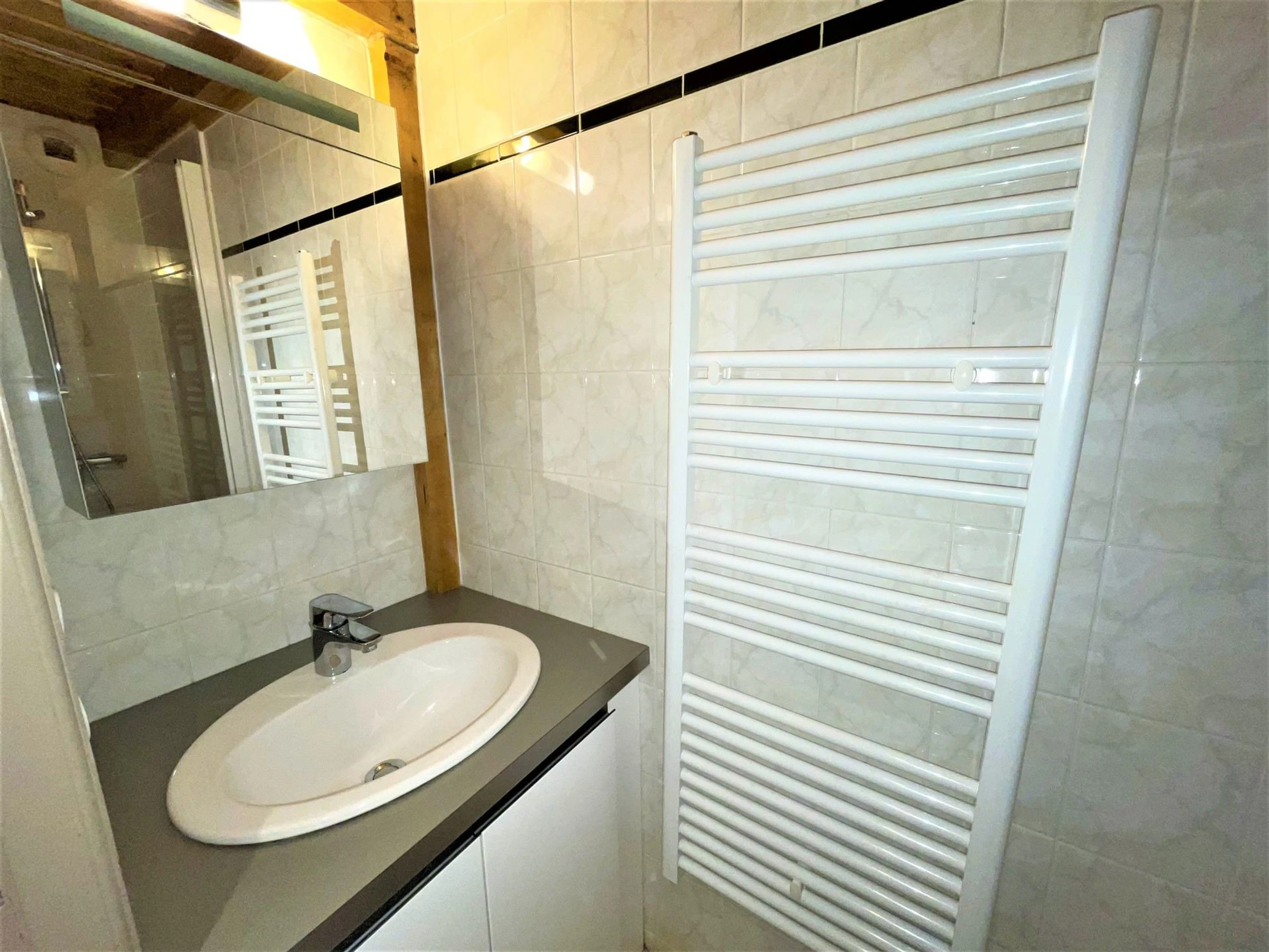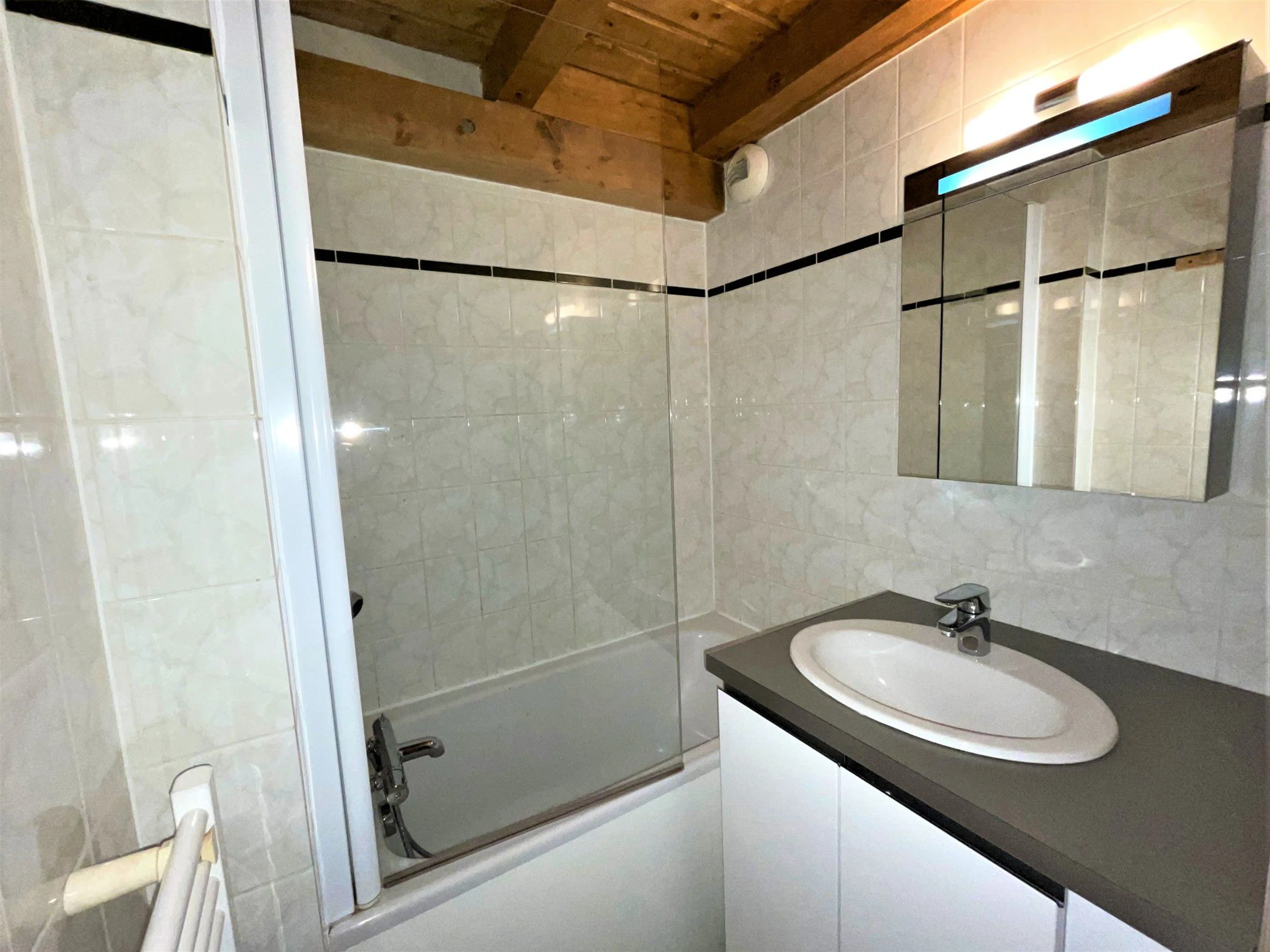 Salle de bains 1 : lavabo, baignoire, sèche-serviettes
