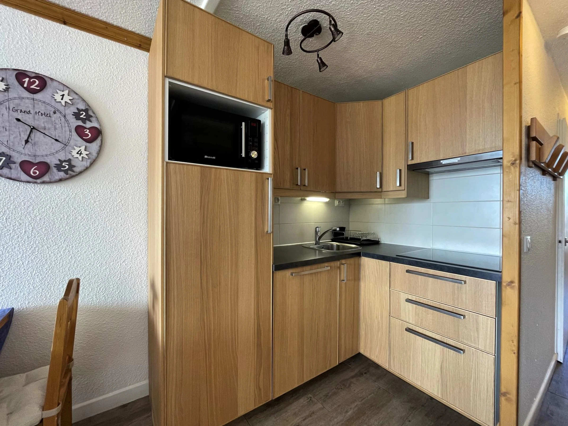 Cuisine : plaques de cuisson induction (x4), four combiné micro onde et chaleur tournante, grand réfrigérateur avec congélateur (17L), lave-vaisselle, cafetière, bouilloire, grille pain, appareil à raclette