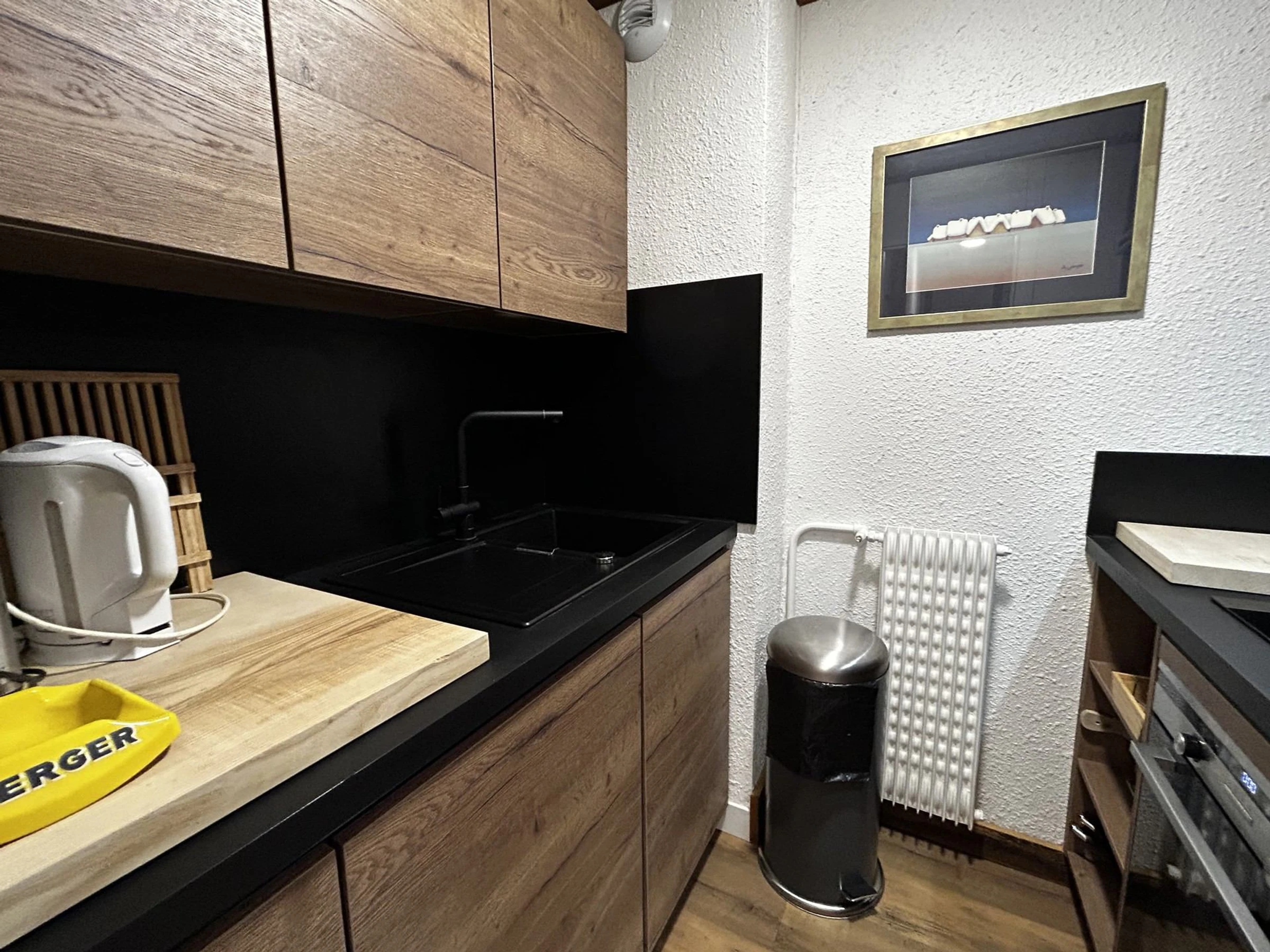 Cuisine : plaques de cuisson vitrocéramique, hotte, micro-ondes, four, réfrigérateur, lave-vaisselle, bouilloire, grille-pain, cafetière