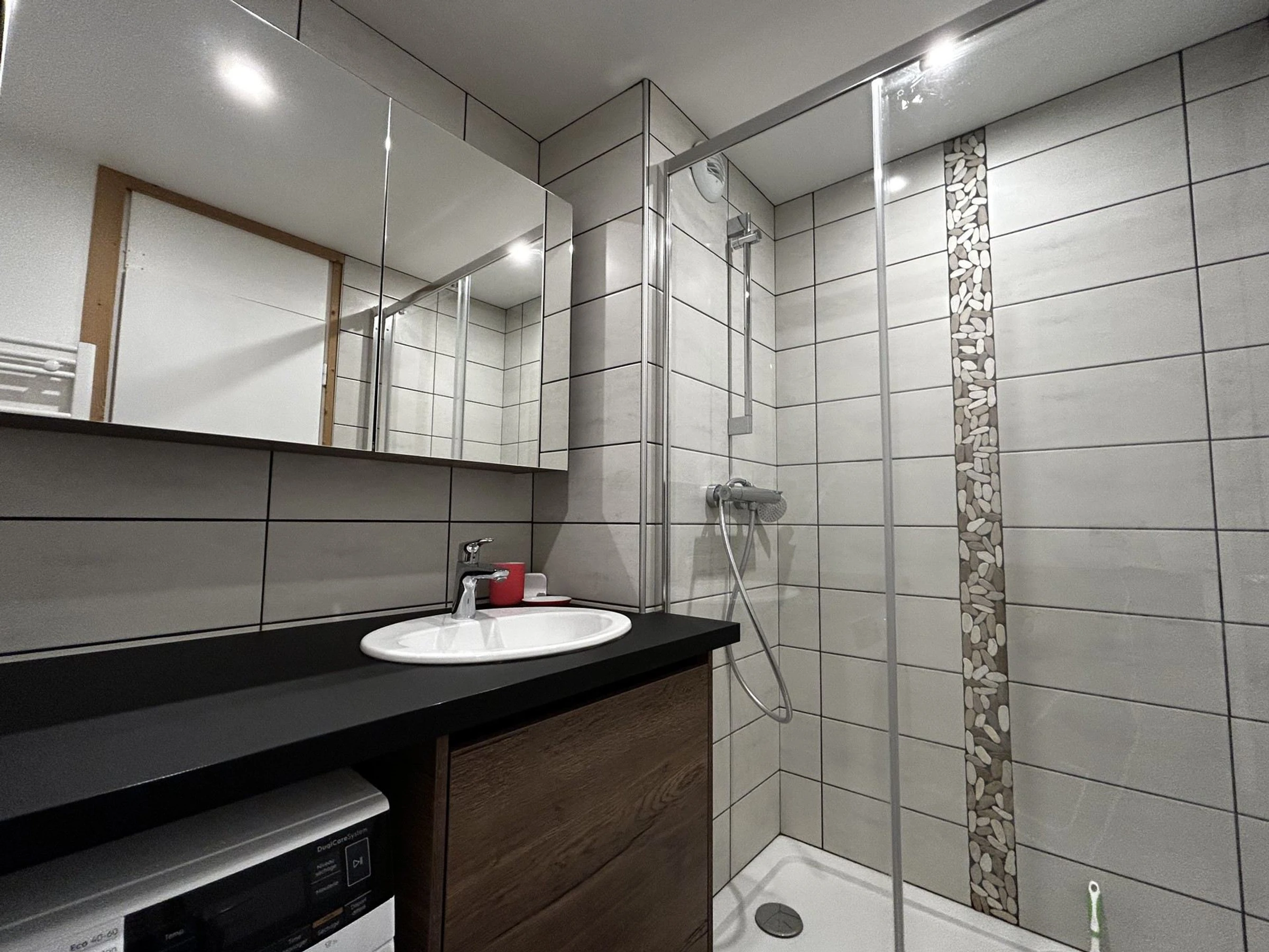 Salle de bains : lavabo, douche, lave linge, sèche serviettes