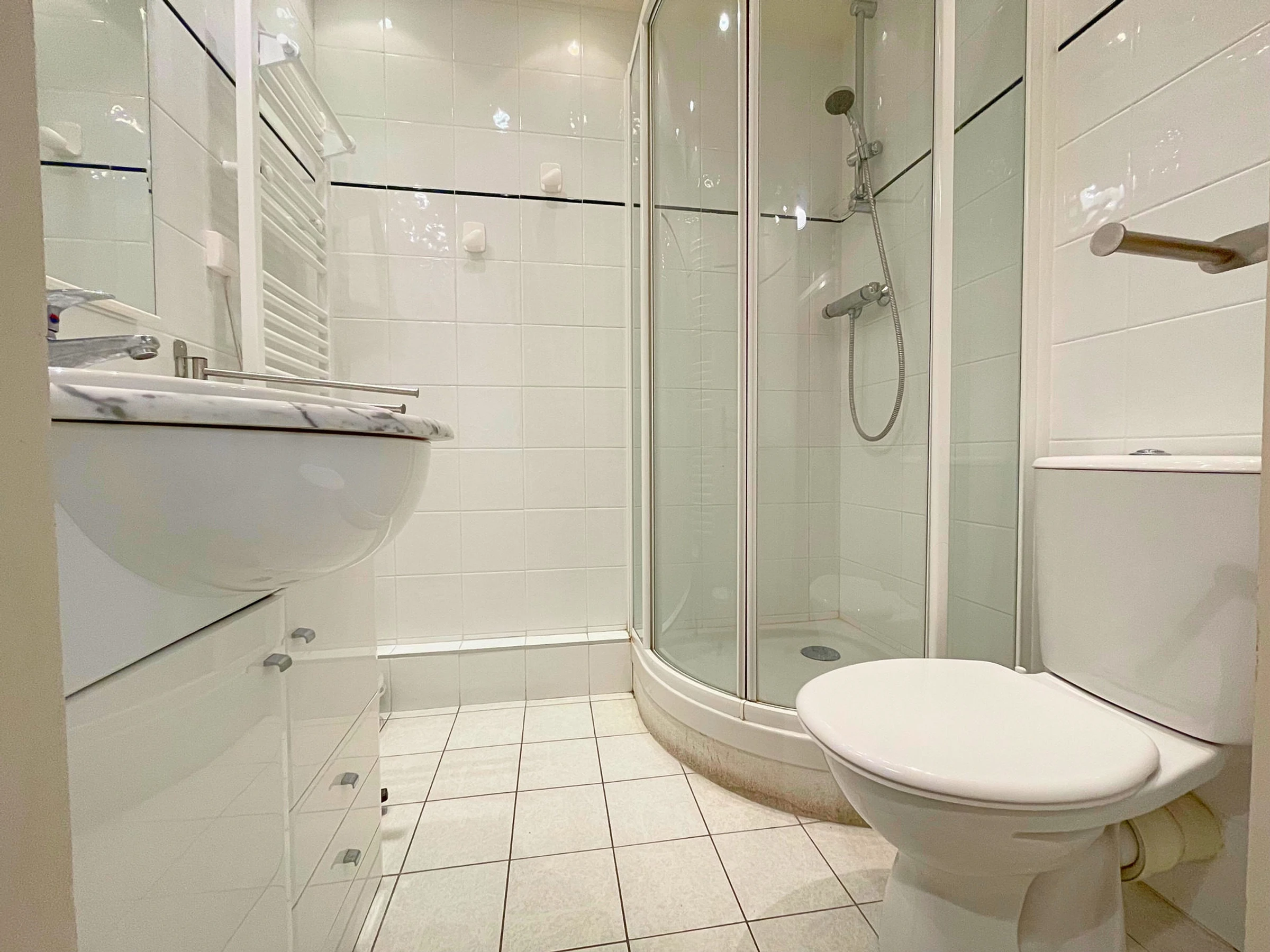 Salle de bain : lavabo, douche, sèche cheveux, toilettes