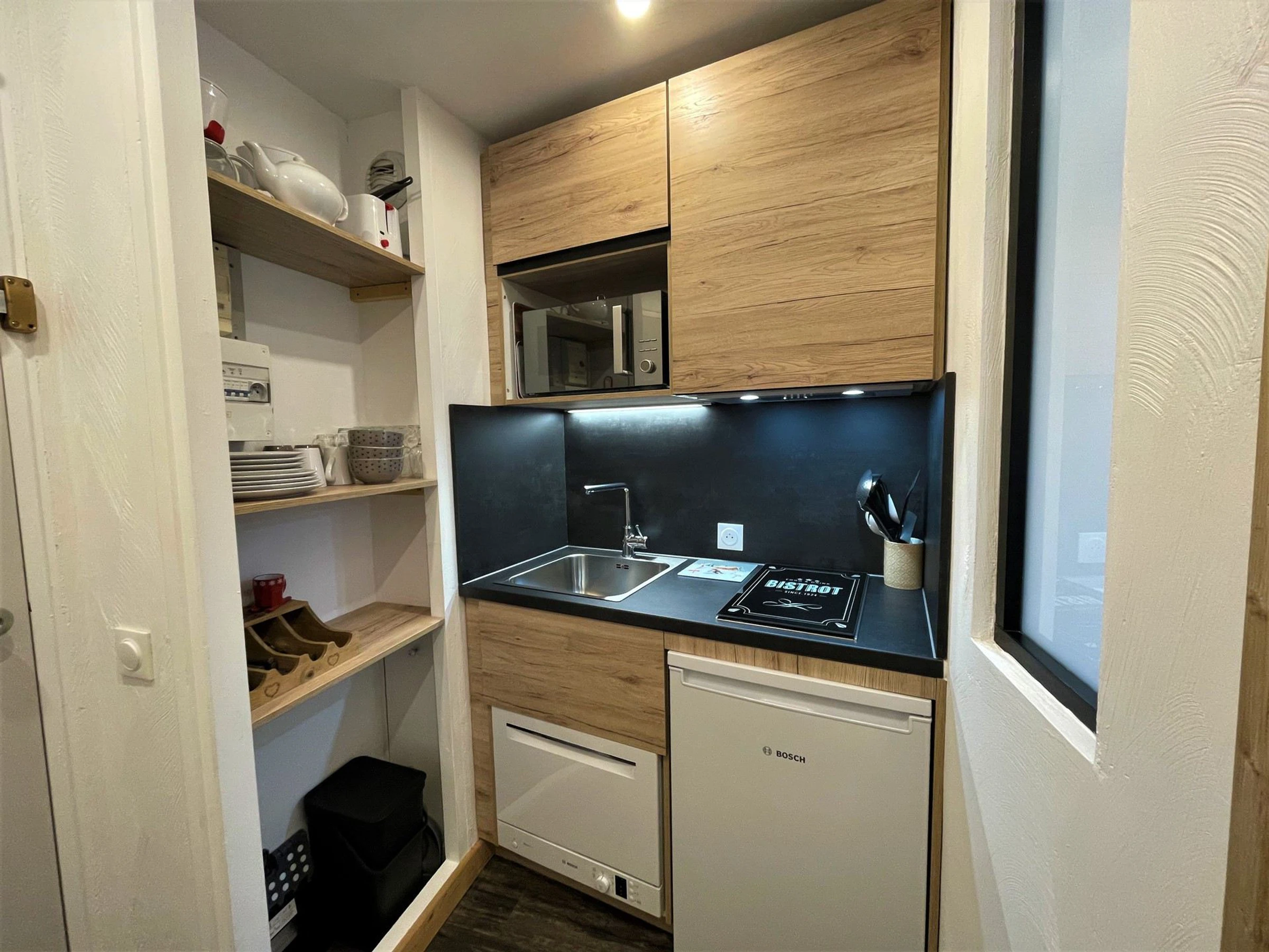 Cuisine : plaque de cuisson vitrocéramique (x2), réfrigérateur avec bac à glaçons de 3L, four multifonction, cafetière classique, bouilloire, grille pain, petit lave-vaisselle