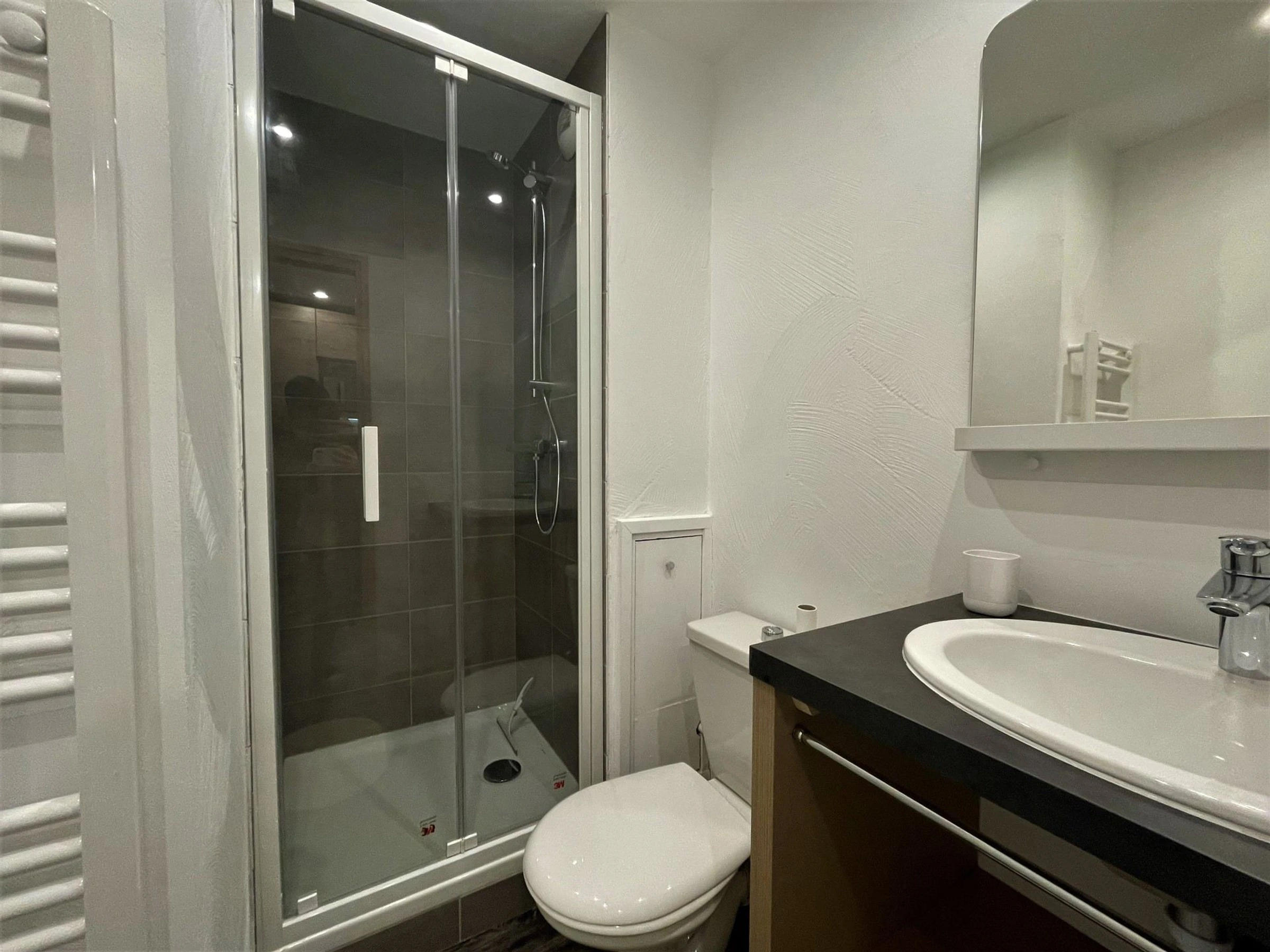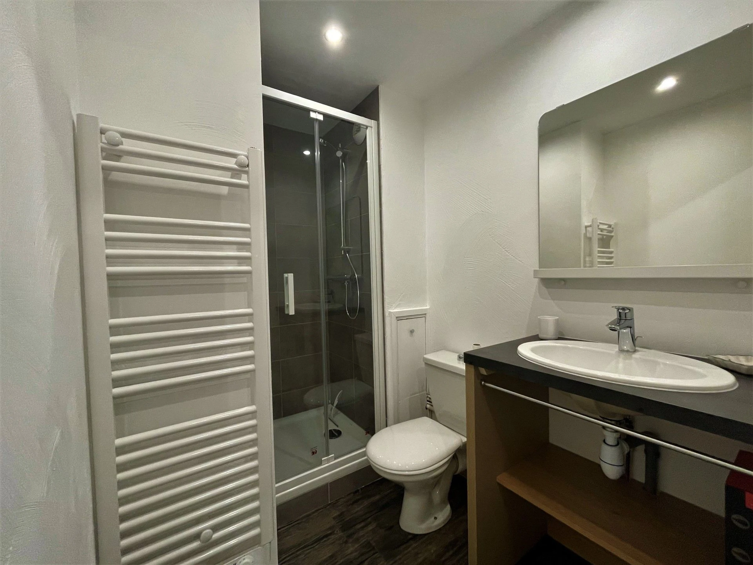 Salle de bain : lavabo, douche, toilettes, sèche-cheveux