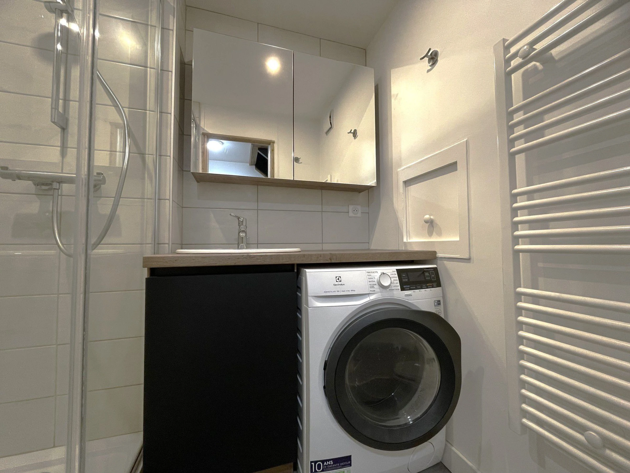 Salle de bains : lavabo, douche, sèche serviettes, lave linge