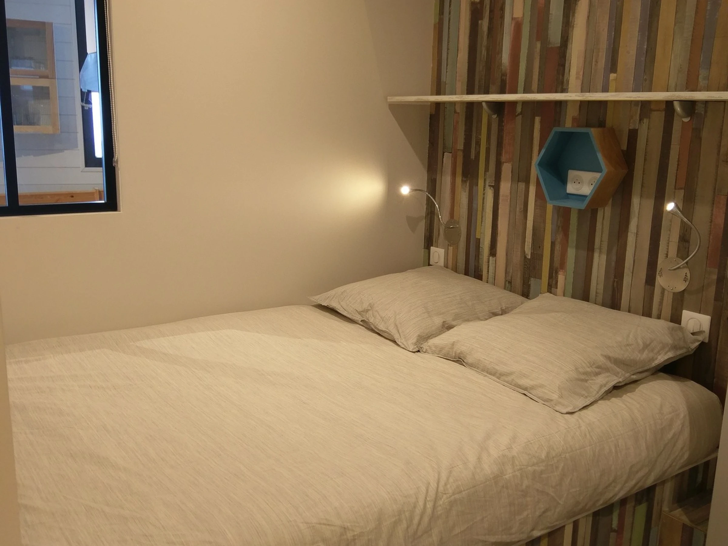 Chambre avec 1 lit double (140x200cm) et rangements.