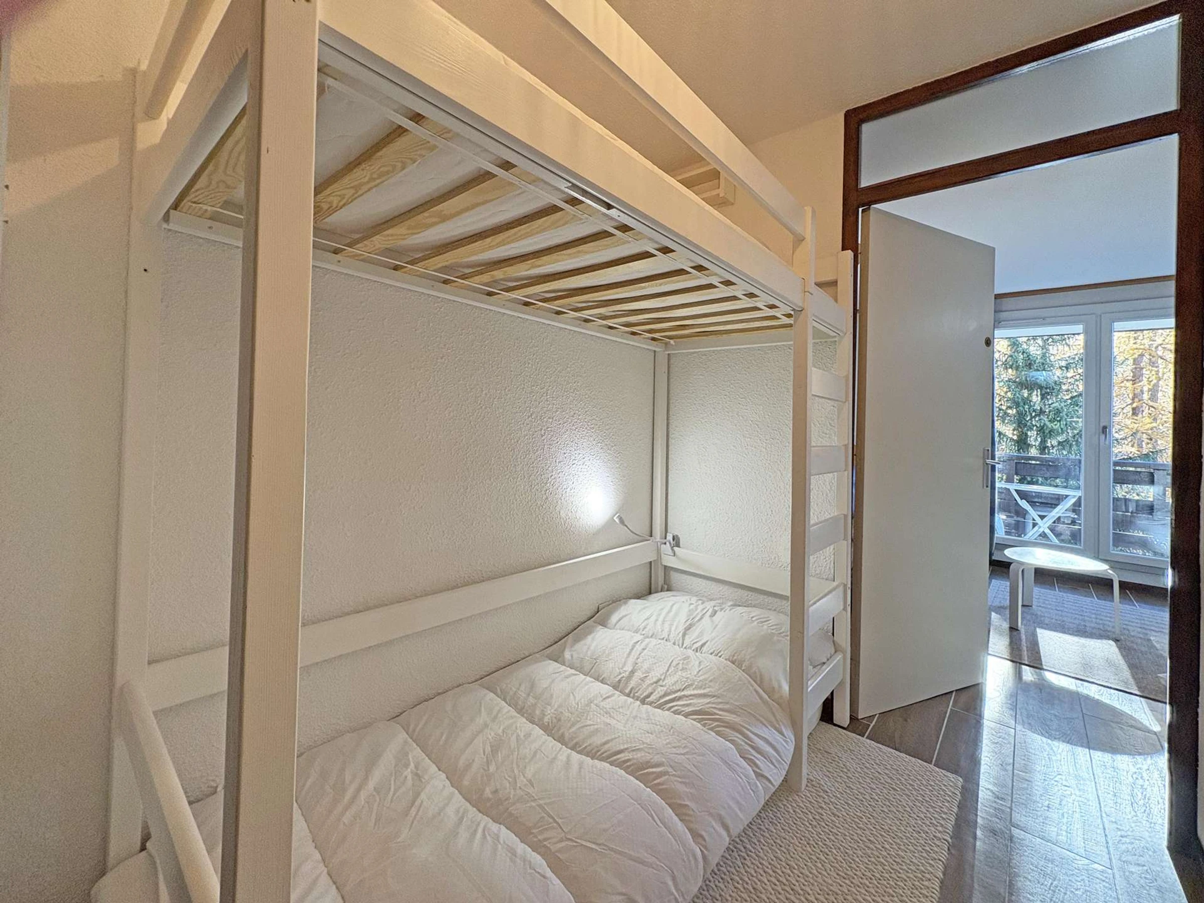 Il est composé de deux lits superposés 70*180cm dans l'entrée, une banquette convertible BZ deux places dans le séjour, une salle d'eau et wc indépendants, un balcon offrant une belle vue sur la vallée.
