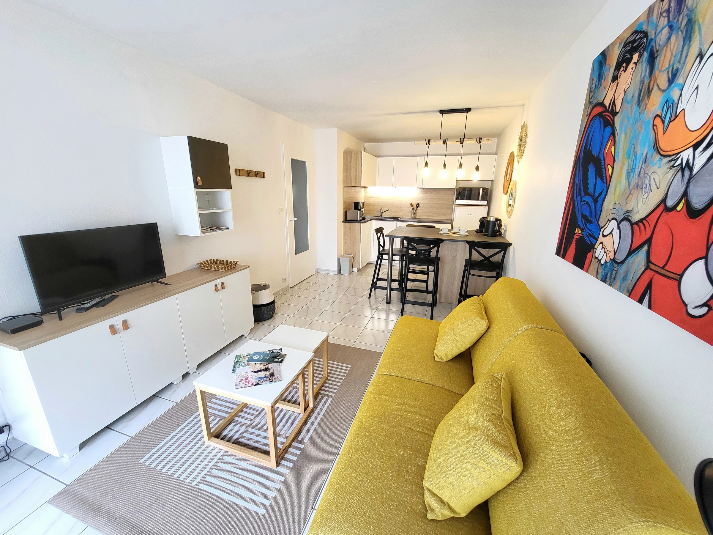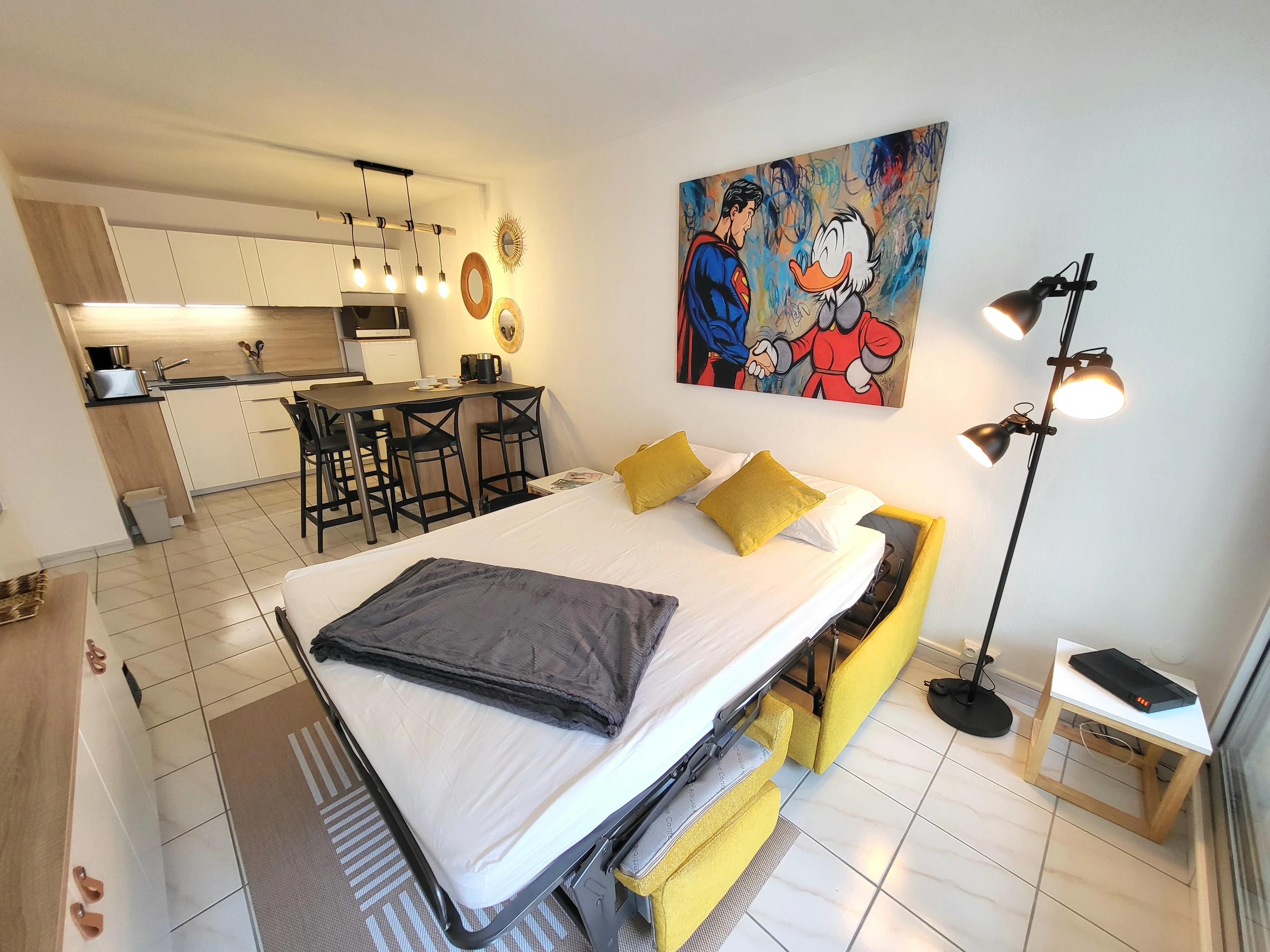 Au deuxième étage avec ascenseur, l’appartement se compose d’une entrée avec placard, d’un agréable séjour baigné de lumière avec cuisine ouverte entièrement équipée, d’une chambre confortable avec un lit de 160*190, d’une salle d’eau moderne et de WC séparés. Une loggia aménagée, accessible depuis la chambre et le séjour, complète cet espace de vie convivial et apaisant, parfait pour vos moments de détente. Le séjour est également doté d’un canapé convertible de 140*190. Navettes et parkings gratuit à 10 minutes.