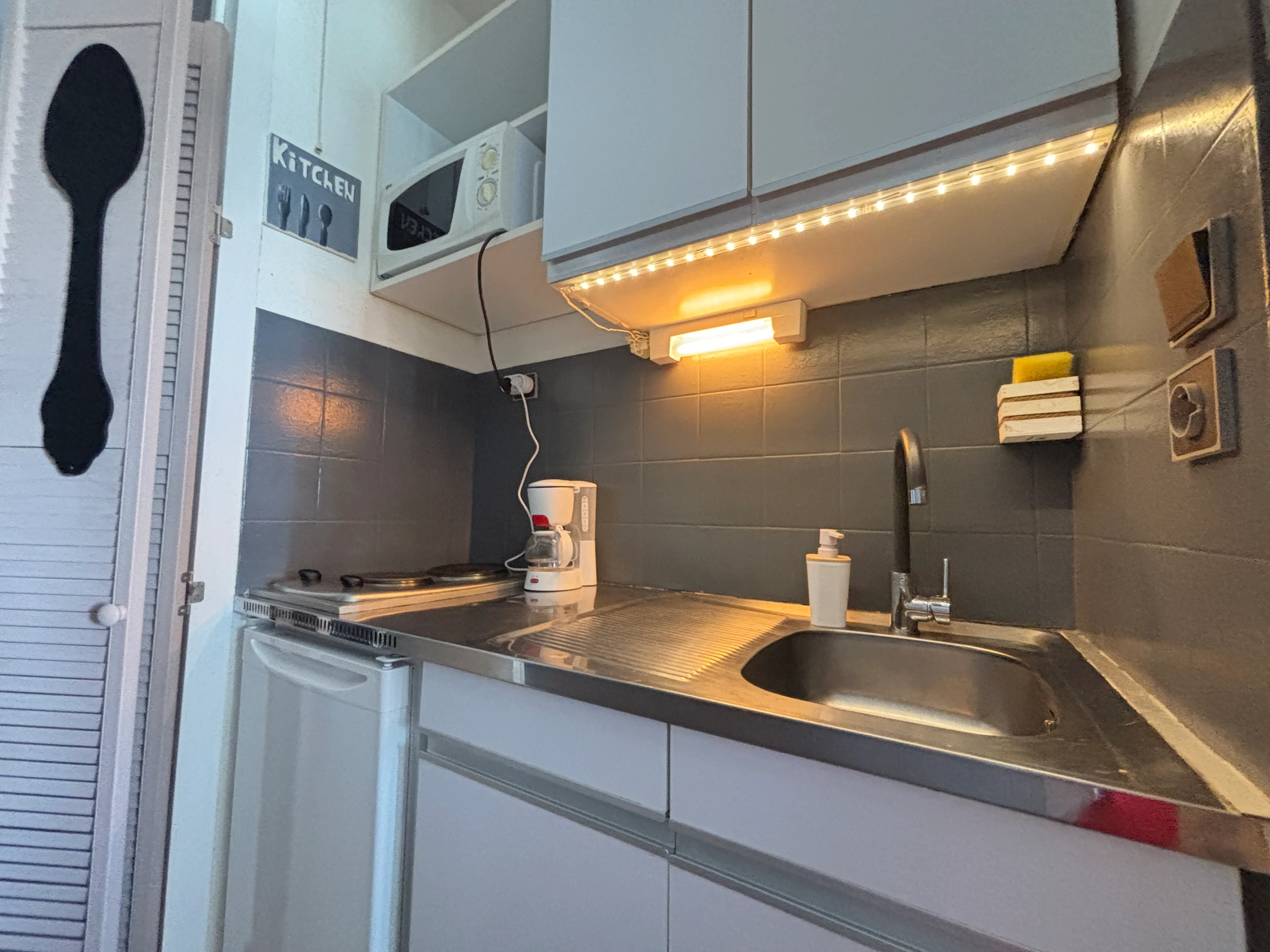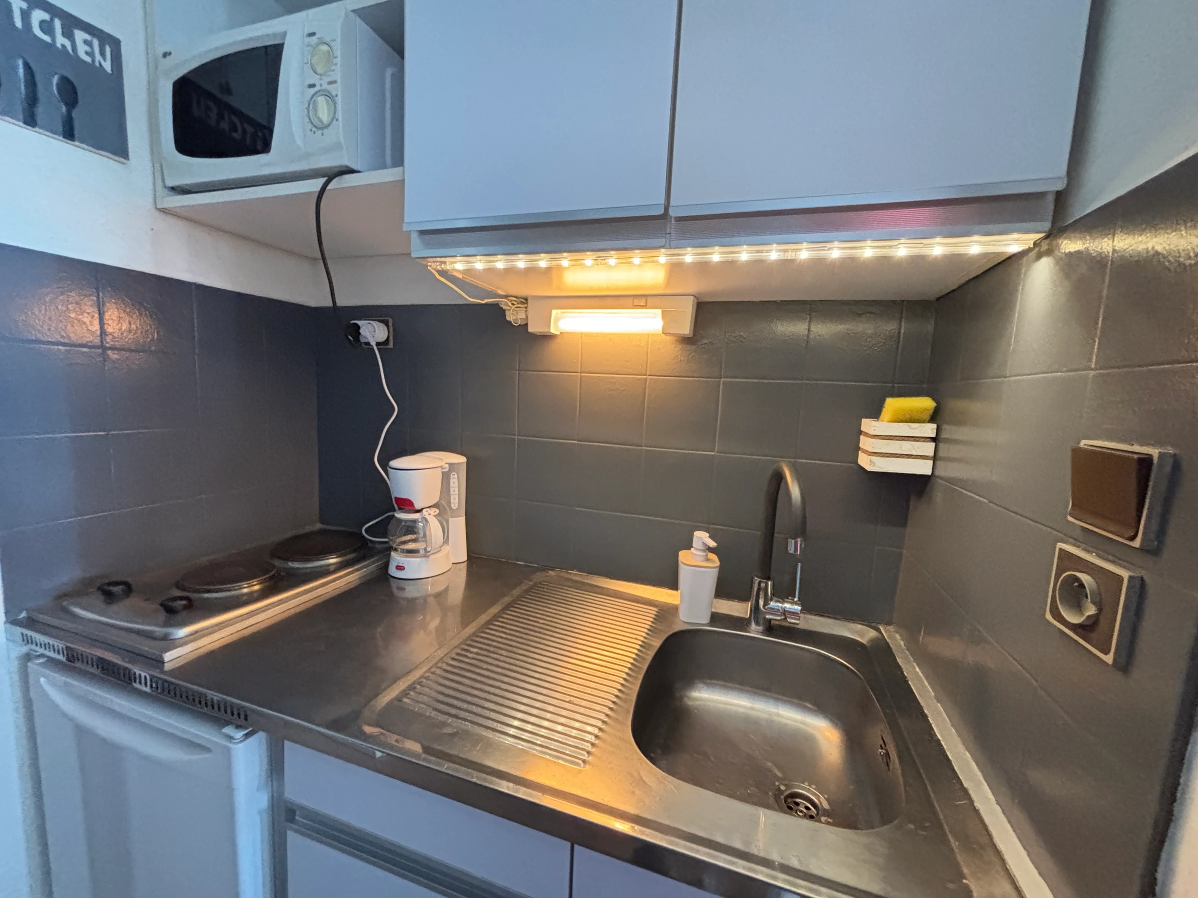 idealement situé place du palais de justice avec vue mer , studio au 3 ème étage avec ascenseur comprenant une entrée , une salle de bain avec baignoire et wc, un coin cuisine comprenant plaque électrique , micro-ondes, réfrigérateur, un séjour avec table , canapé lit 2 personnes , télévision et balcon face mer avec son mobilier . Linge non fourni réf STUD 304