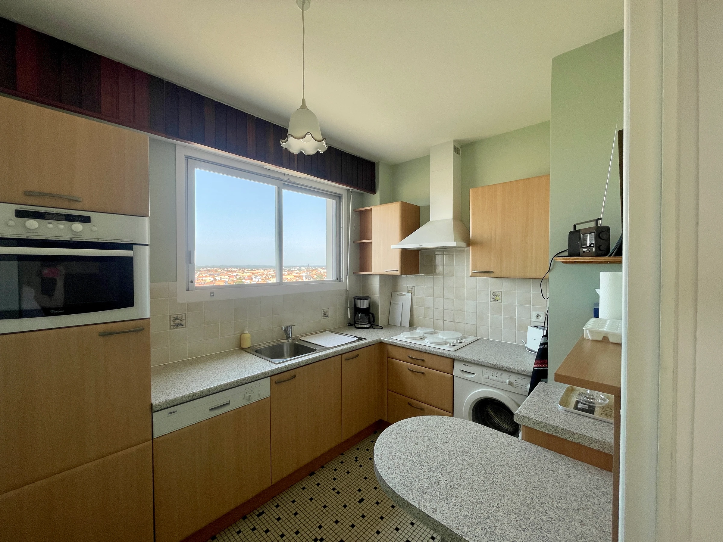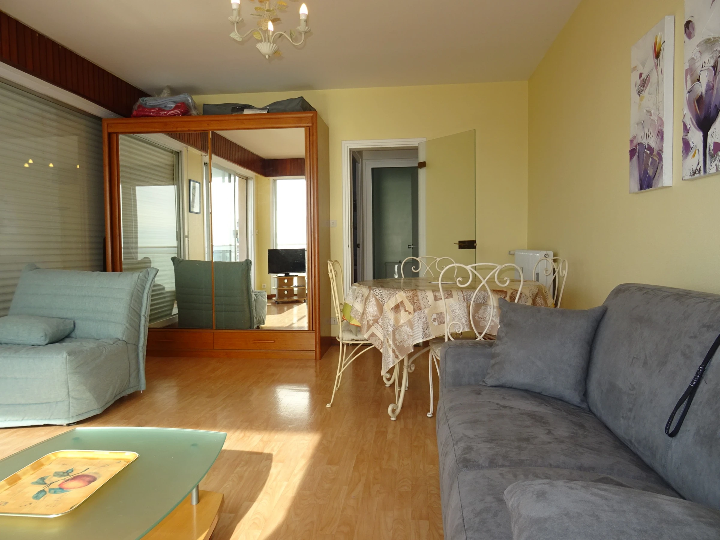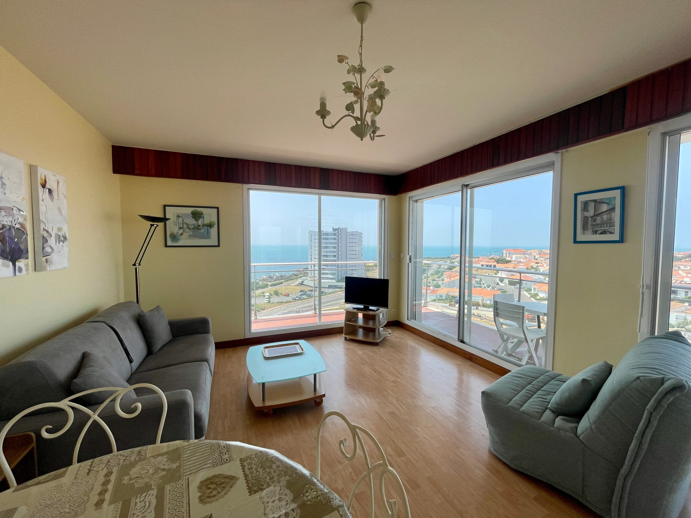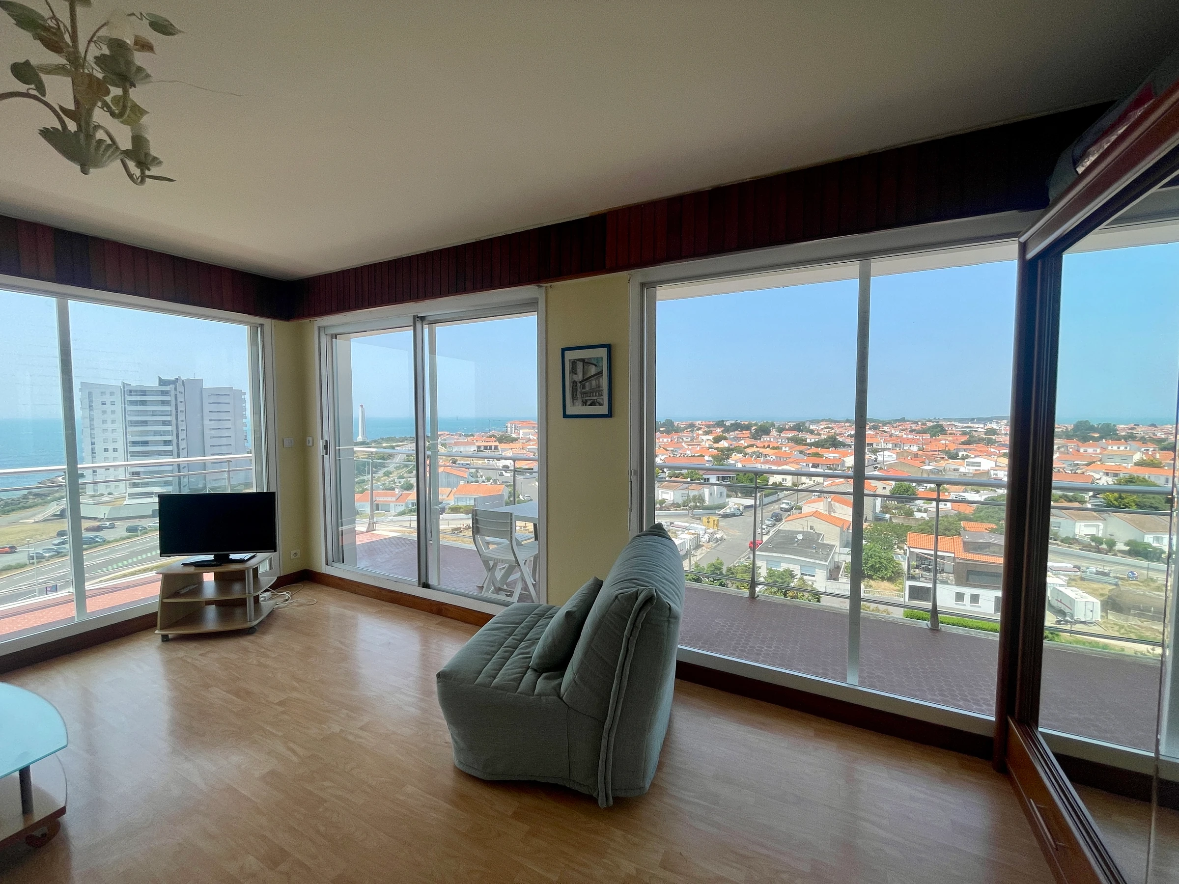 Studio dans une résidence située face mer. La grande plage des Sables d'Olonne est accessible par le passeur à 400m en été et une petite plage aménagée se trouve à 200m de la résidence, tout comme un sentier côtier, départ de belles ballades en bord de mer. Tous commerces à 700 mètres et centre ville des Sables d'Olonne à 1900 mètres. Au 9ème étage avec ascenseur : entrée avec placard, cuisine, séjour avec balcon d'angle offrant une vue dégagée sur la mer : 1 rapido de 140 et 1 chauffeuse BZ de 80 - Salle d'eau et WC Séparés. Garage privatif.
