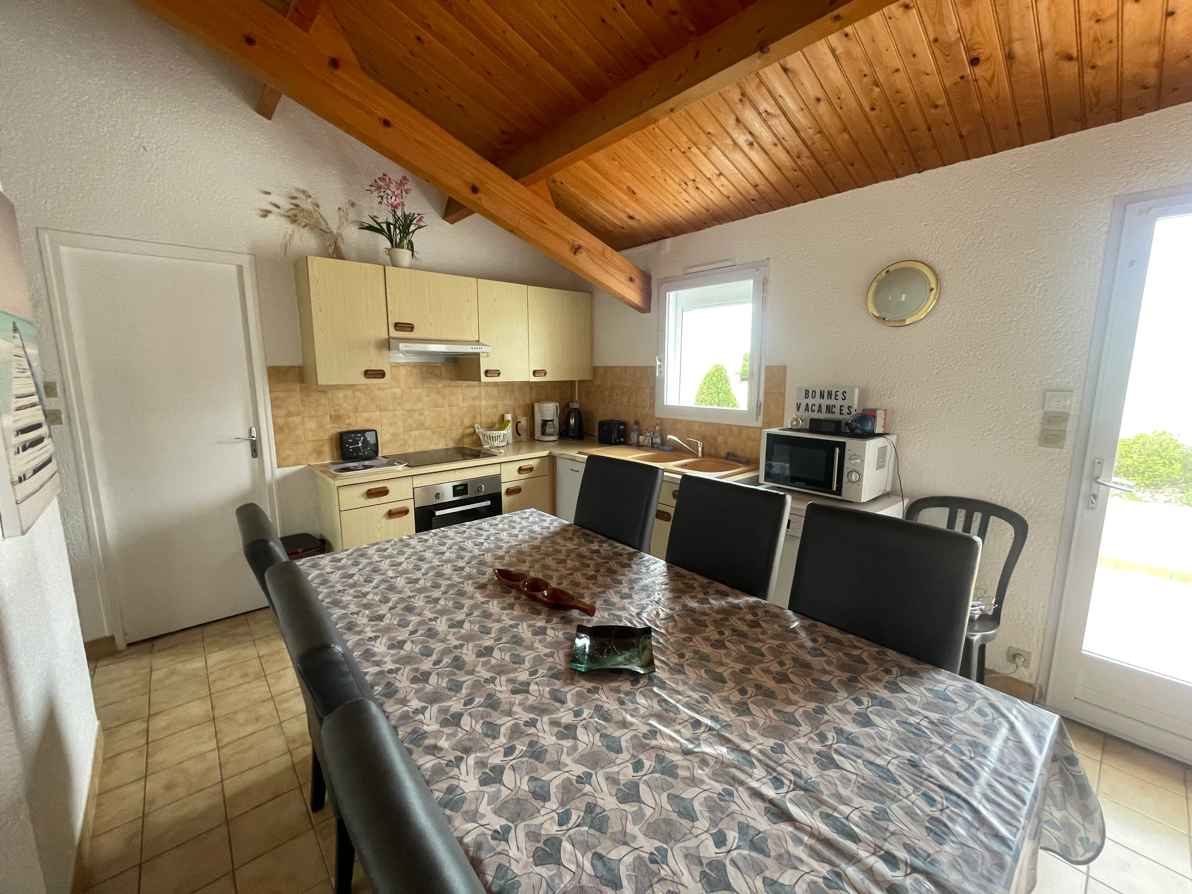 L'intérieur de la maison se compose d'une cuisine conviviale avec un coin repas ouvert sur le séjour. Le canapé convertible de 140 dans le séjour offre un espace de détente supplémentaire. Deux chambres confortables vous accueillent, l'une avec un lit double de 140 et l'autre donnant sur le jardin avec deux lits de 90. Une salle d'eau avec douche et des toilettes séparées complètent l'aménagement pour votre confort.
