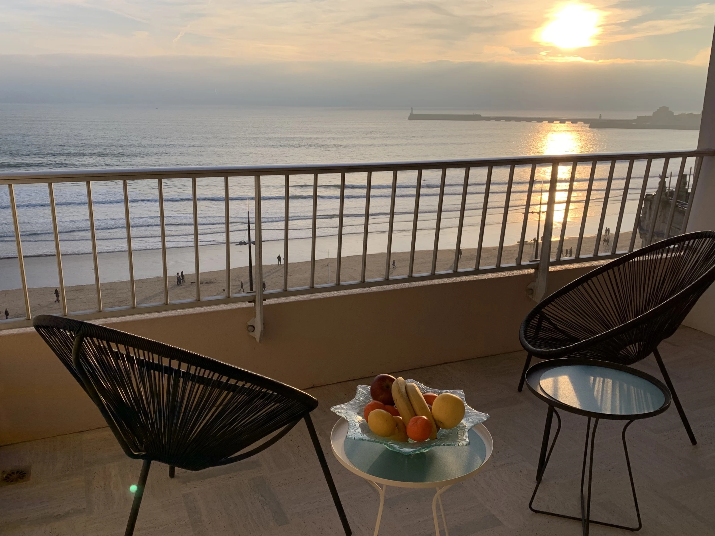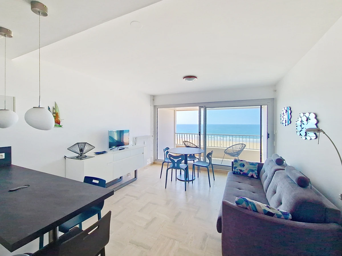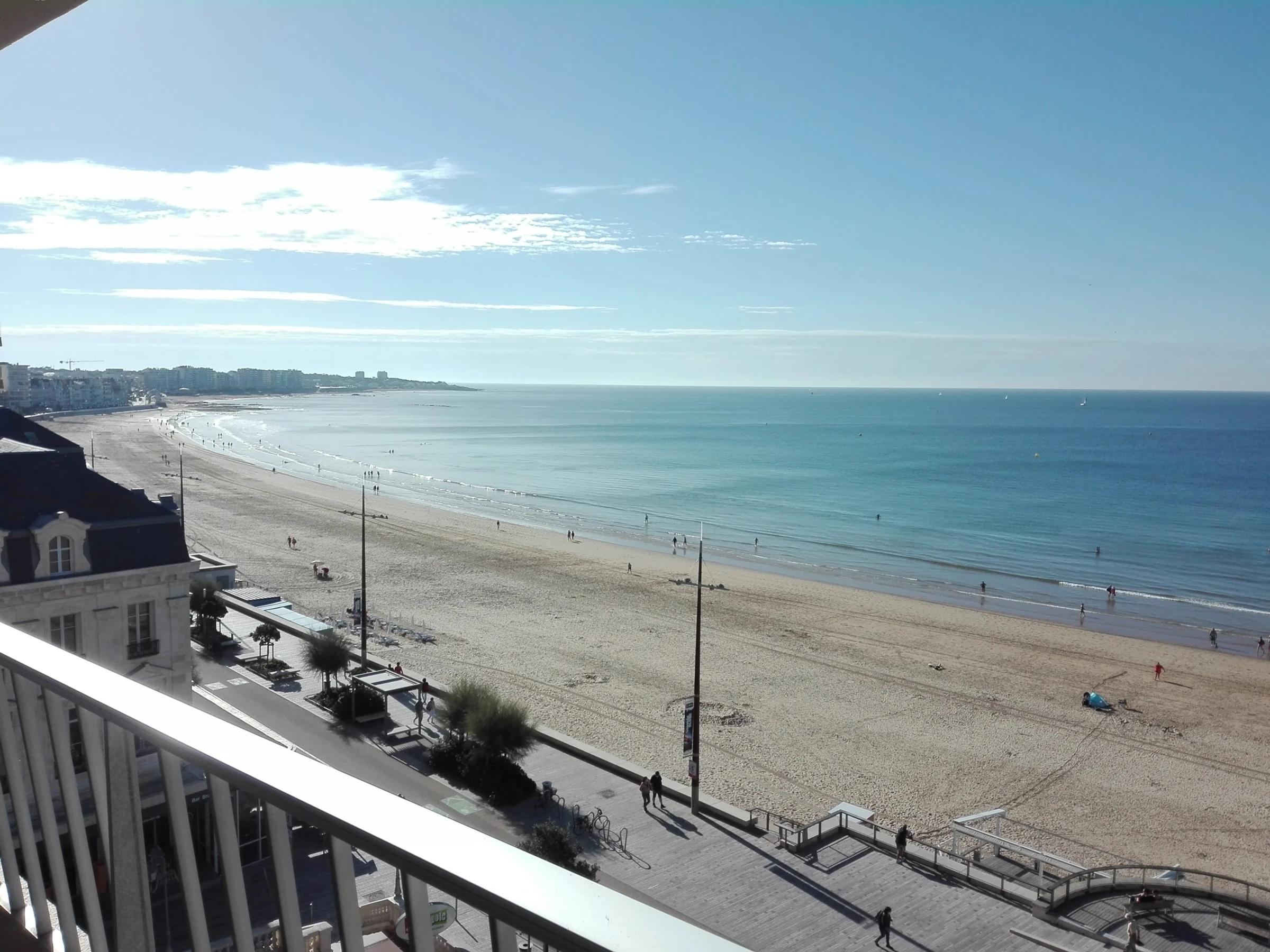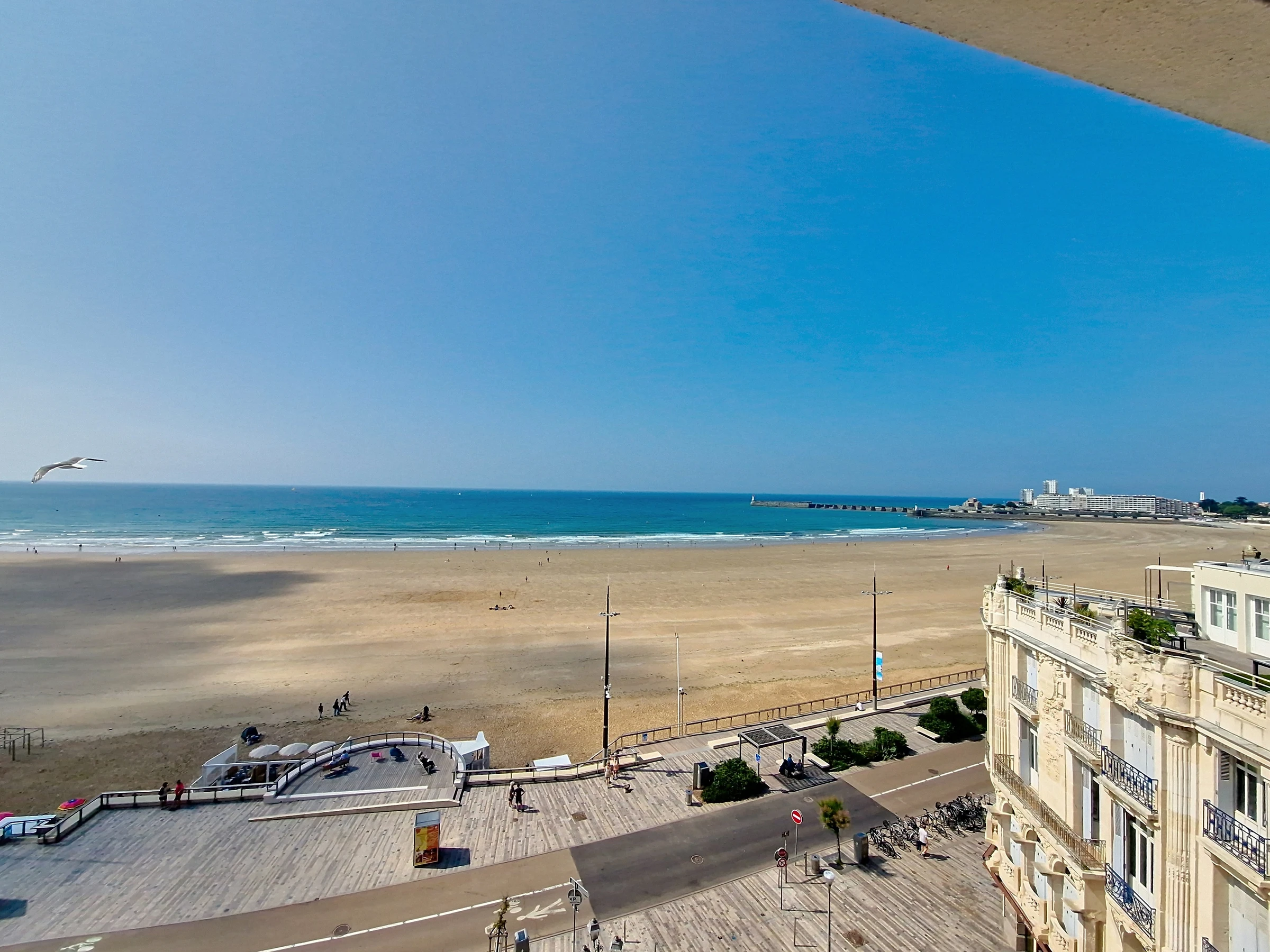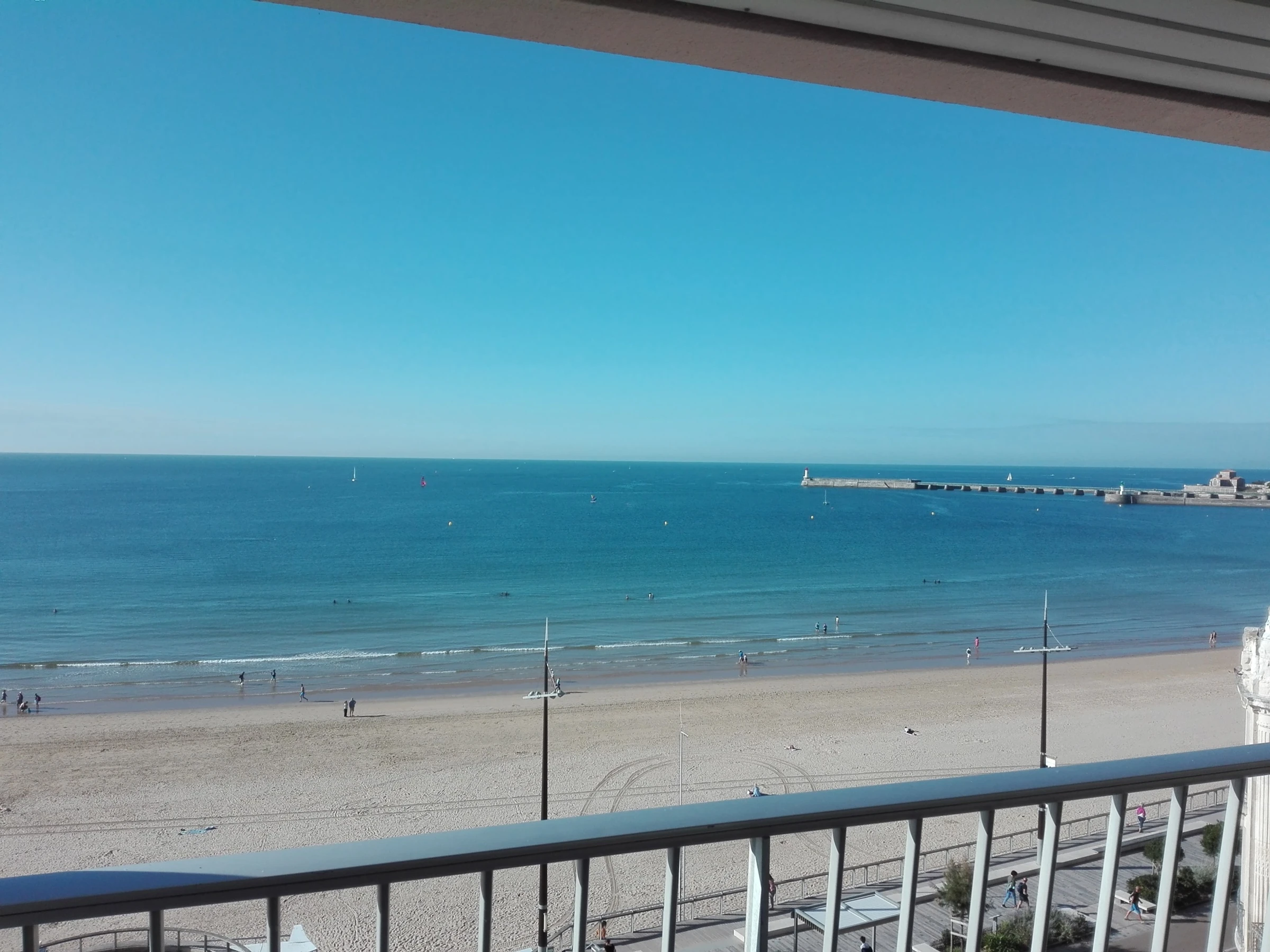 Face Mer, centre plage, très confortable studio rénové 30m2 env , 5e ét. avec ascenseur, terrasse 6m2 env, Local Vélos au RDC, Parkings publics et commerces à proximité. Entrée (interphone, placard) - Pièce principale face mer (canapé-lit "Rapido" en 160, écran plat) sur terrasse (salon de