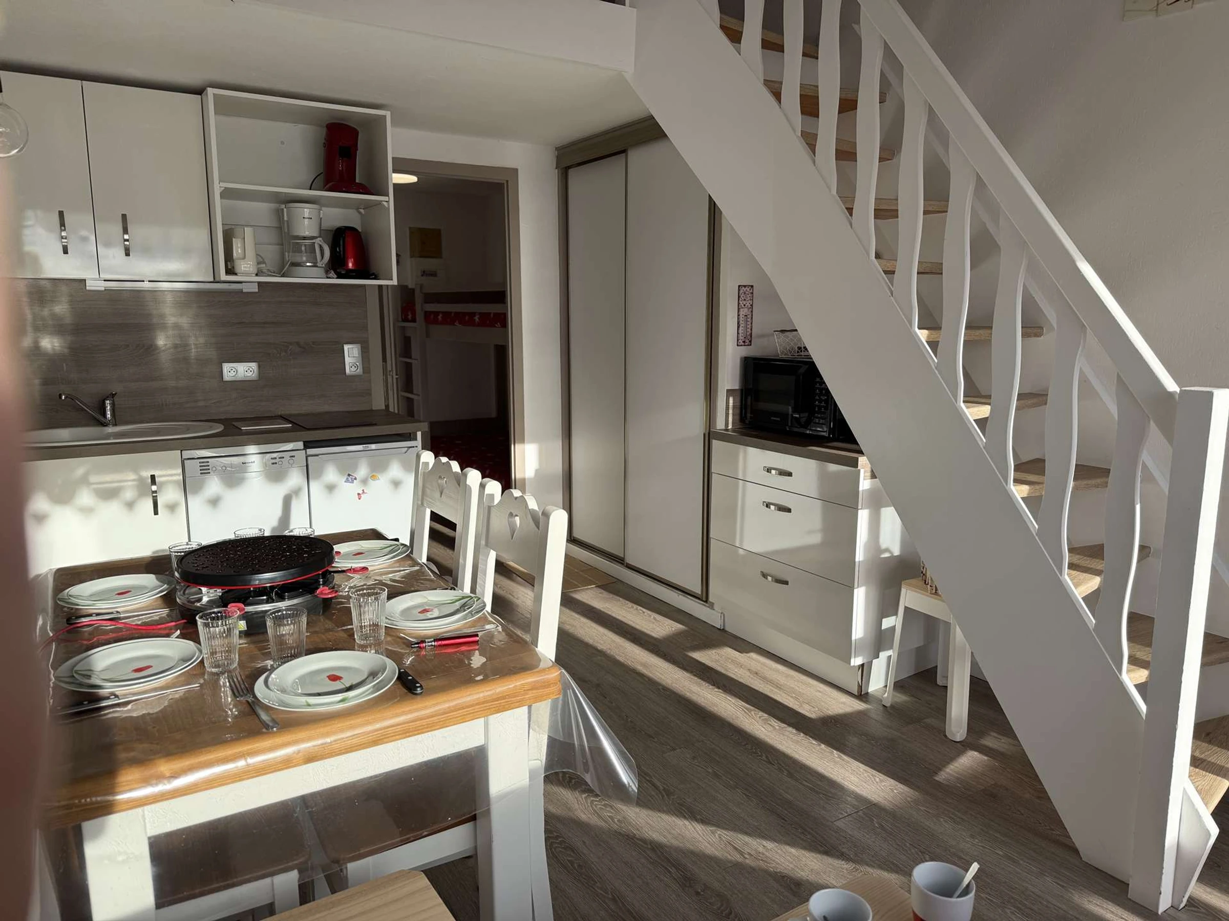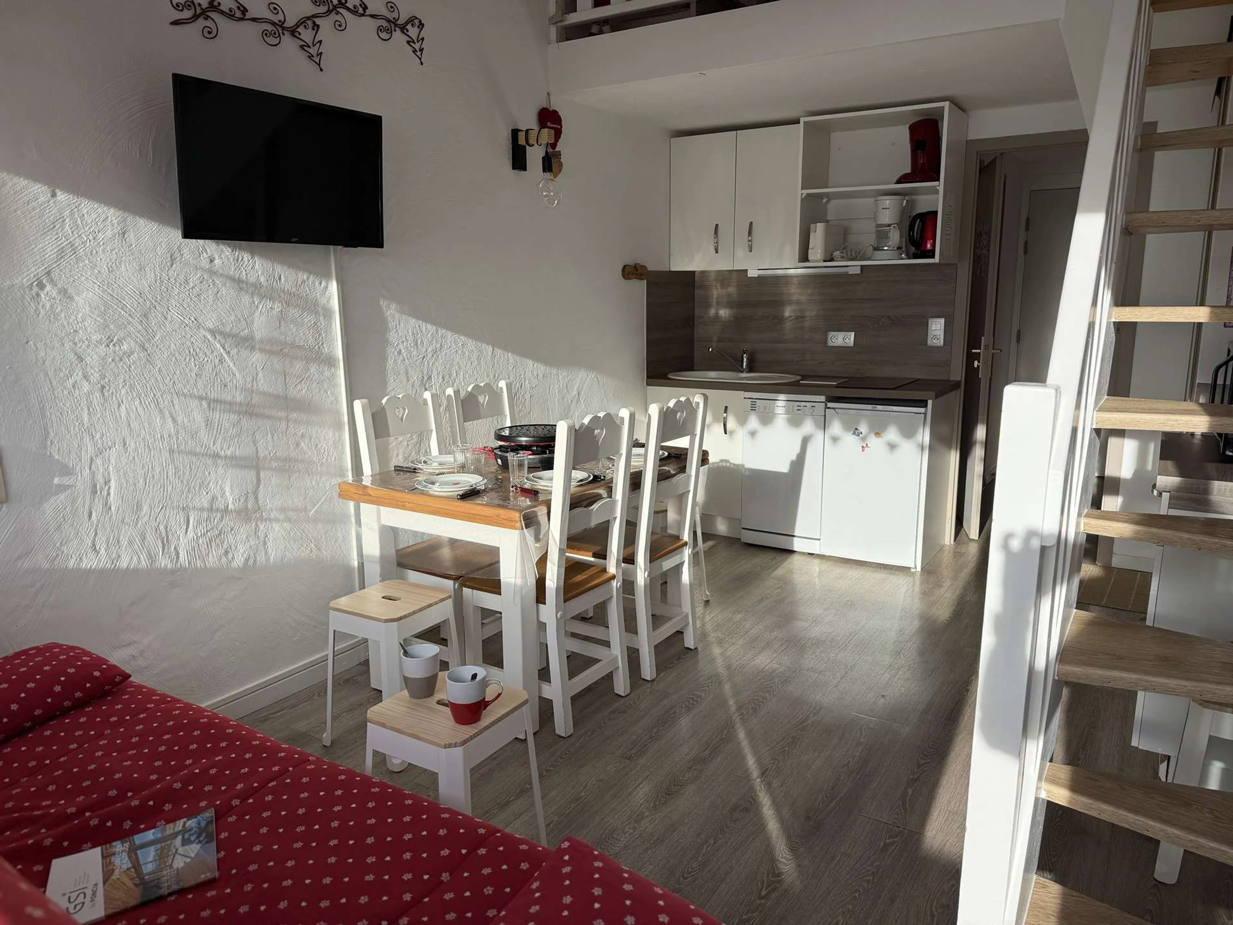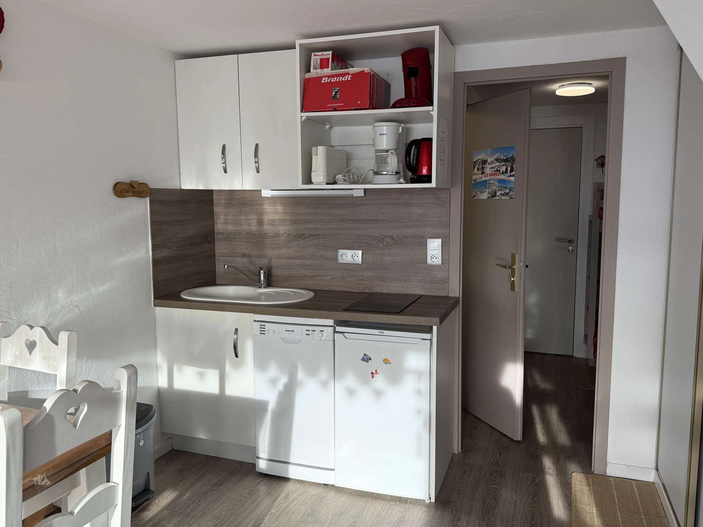 L'appartement se compose d'une kitchenette équipée, d'un séjour avec canapé 140, d'une sous pente avec un lit en 140, d'une alcôve avec des lits superposés 2x80, d'une salle d'eau et d'un WC séparé. (NB: le lit supérieur d'un lit superposé est interdit aux - de 6 ans)