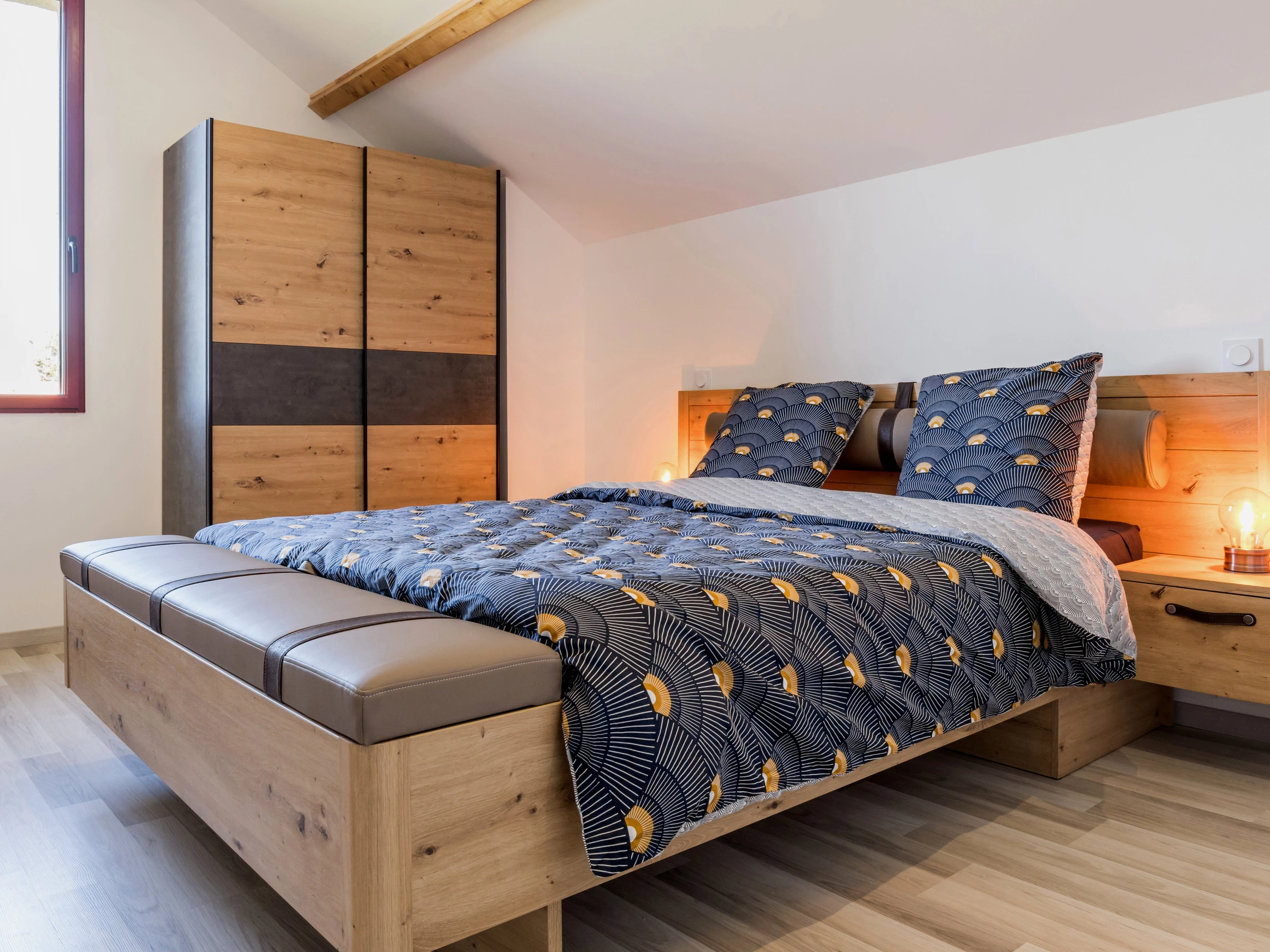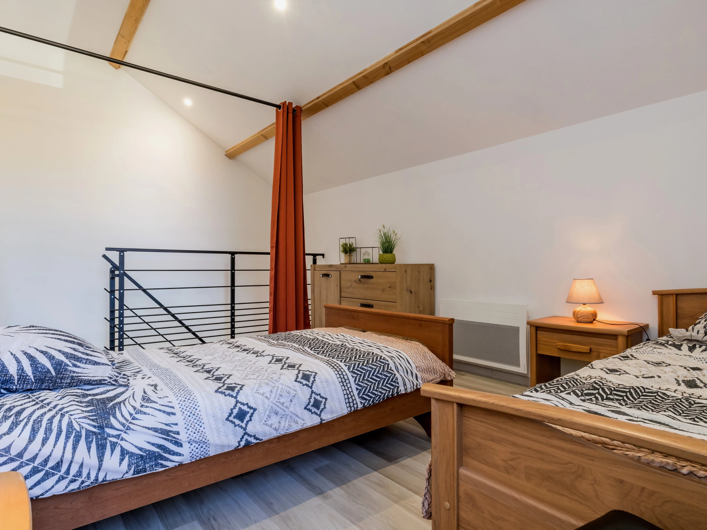 Etage (accessible par escalier un peu raide) : 2 chambres dont 1 ouverte et fermée par rideau (1: lit 160x200, 2: 2 lits 90x190).