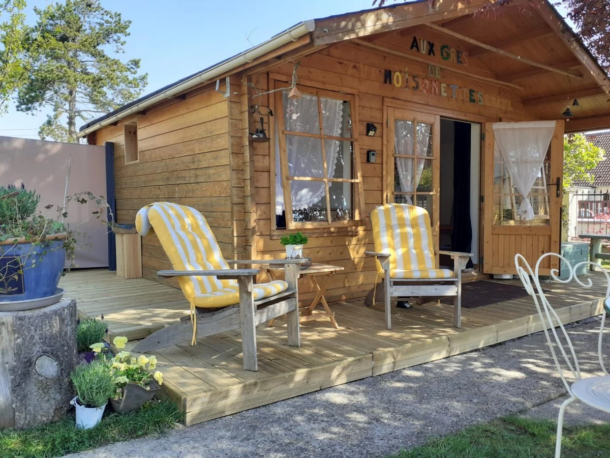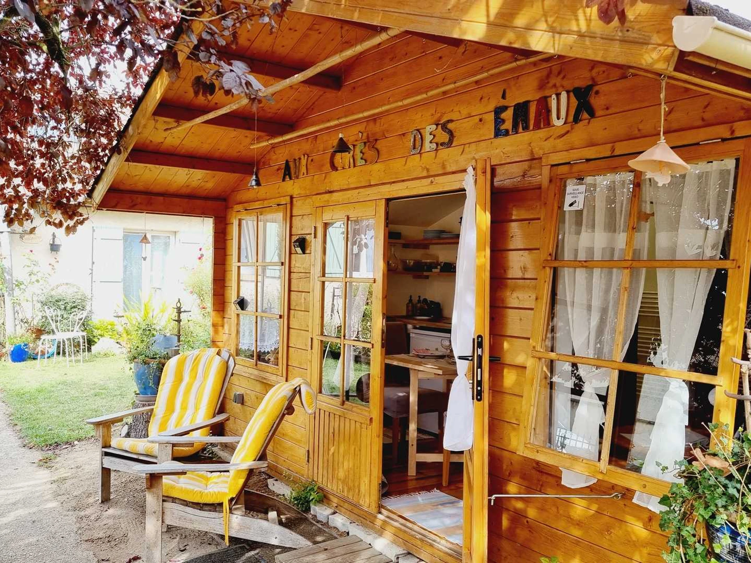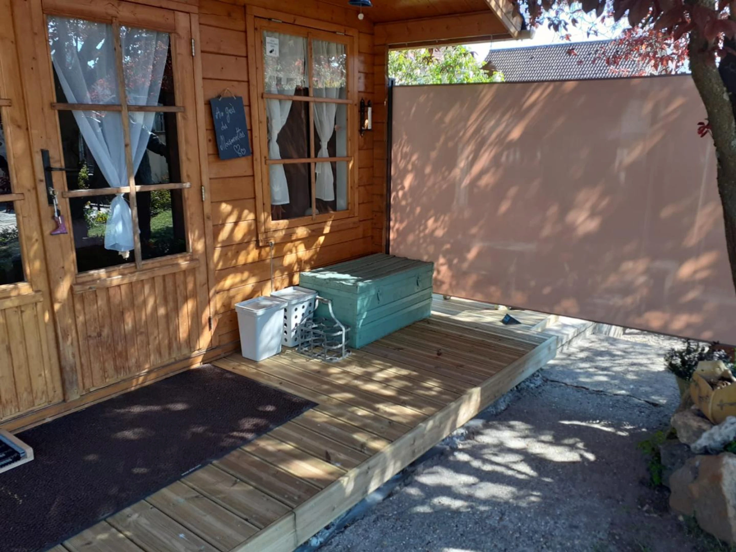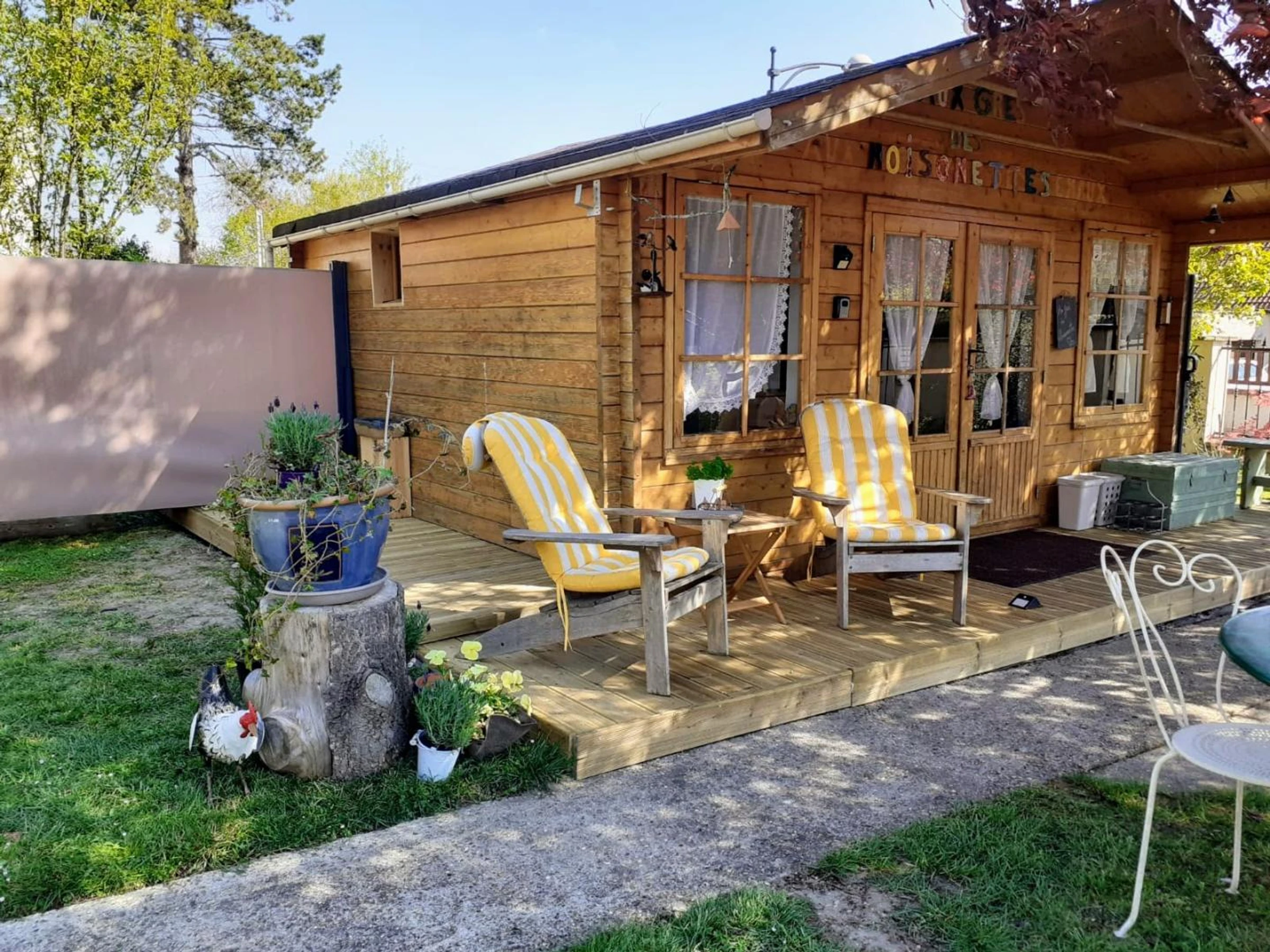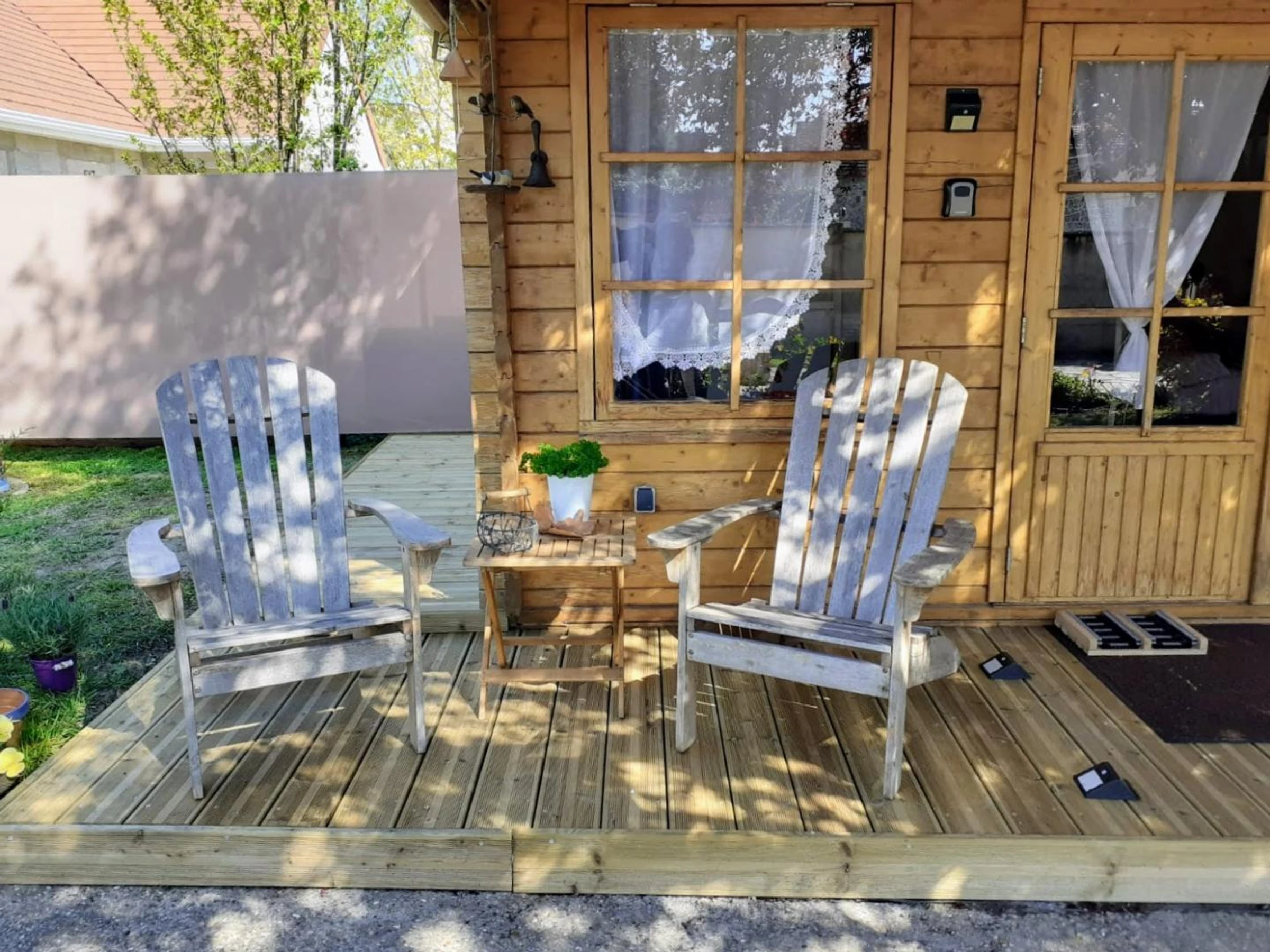 Insolite ! Chalet de 15 m² dans le jardin des propriétaires, côté rue. Extérieurs avec salon de jardin et barbecue électrique, brise-vues extensibles de chaque côté du chalet. Places de parking publiques à 20 mètres du gîte avec surveillance vidéo. Coin cuisine avec plaque 2 feux vitrocéramiques, combiné four micro-ondes, frigo top, cafetière à filtre, cafetière à capsules, grille-pain, bouilloire.