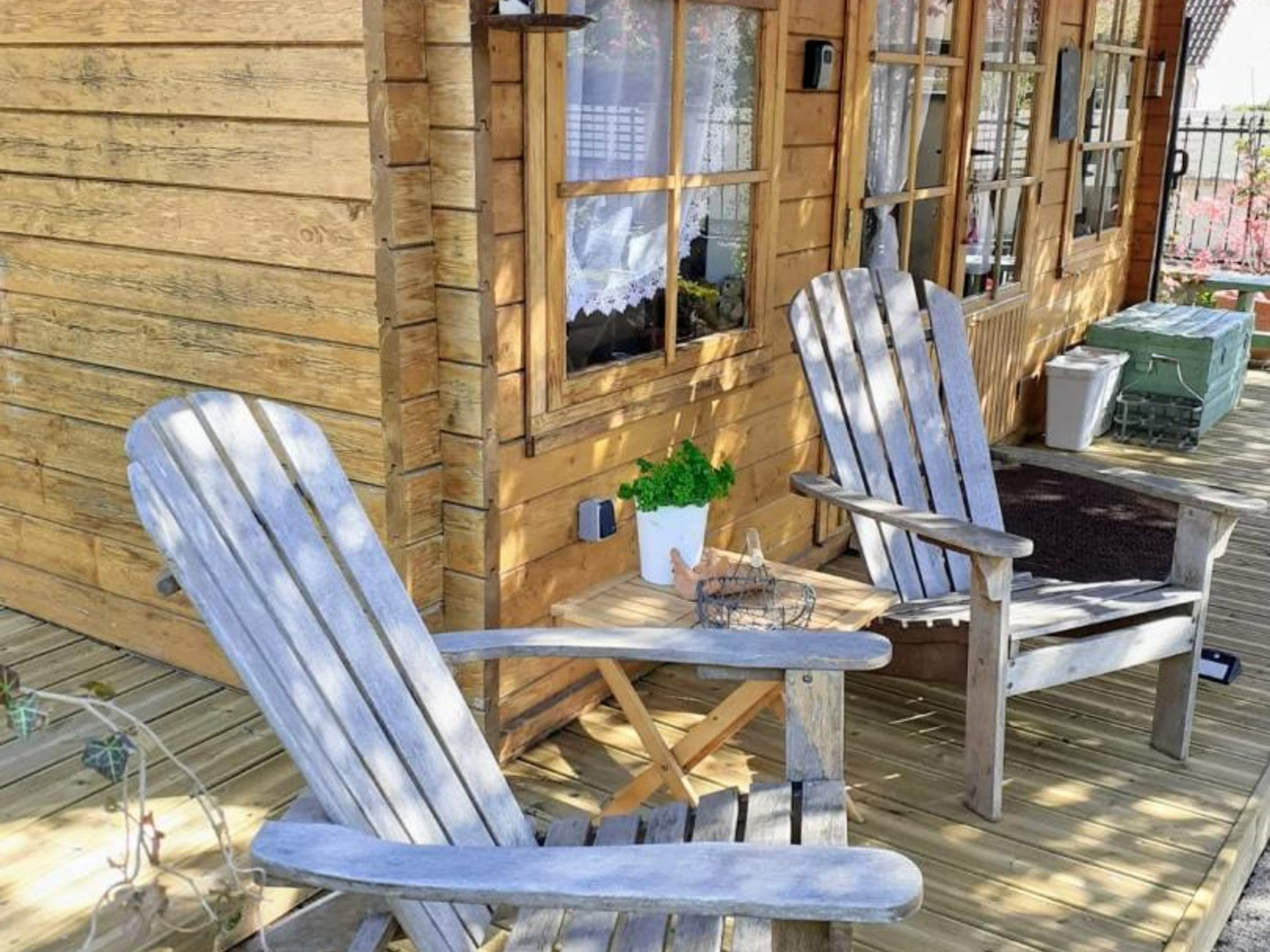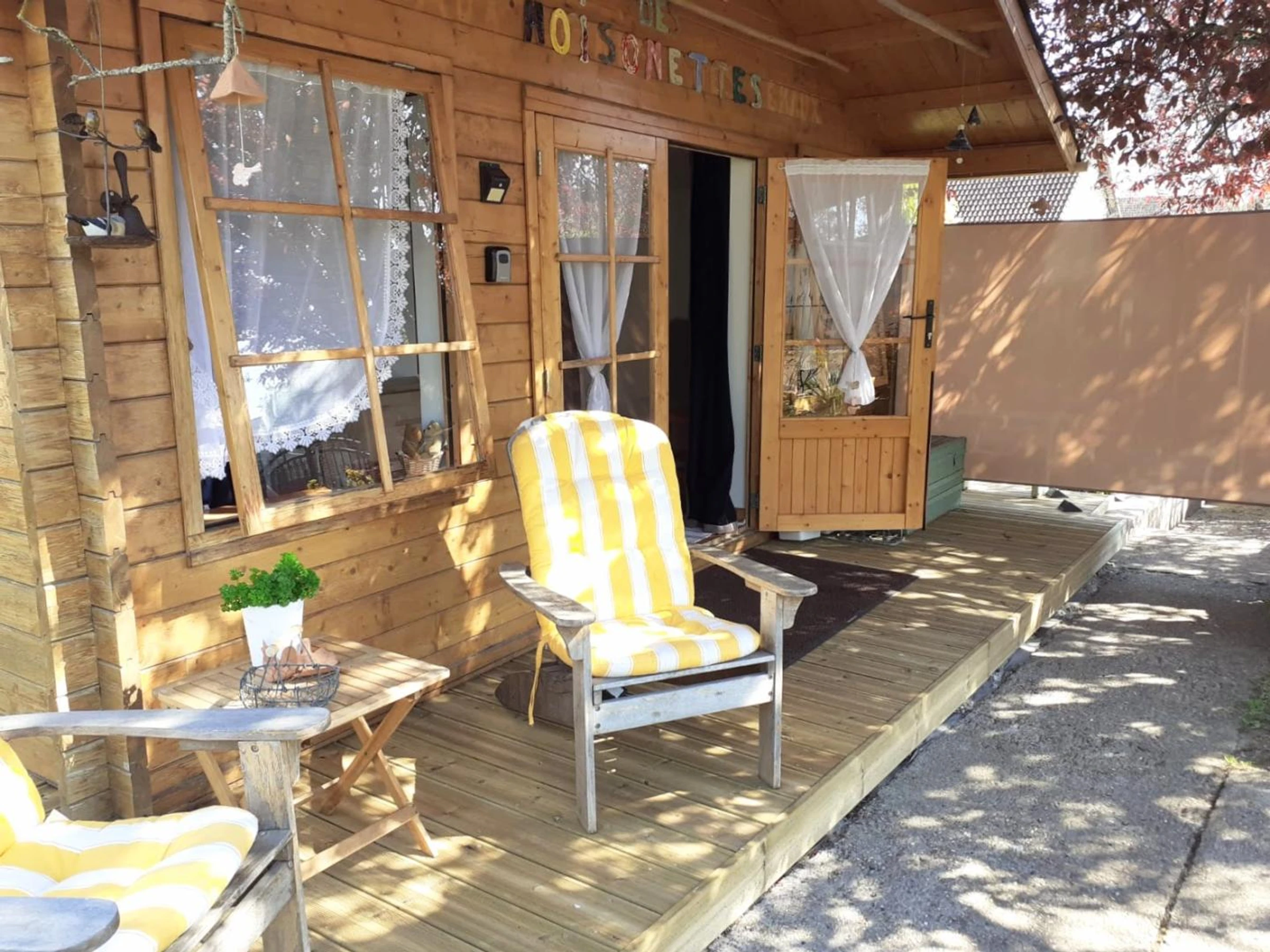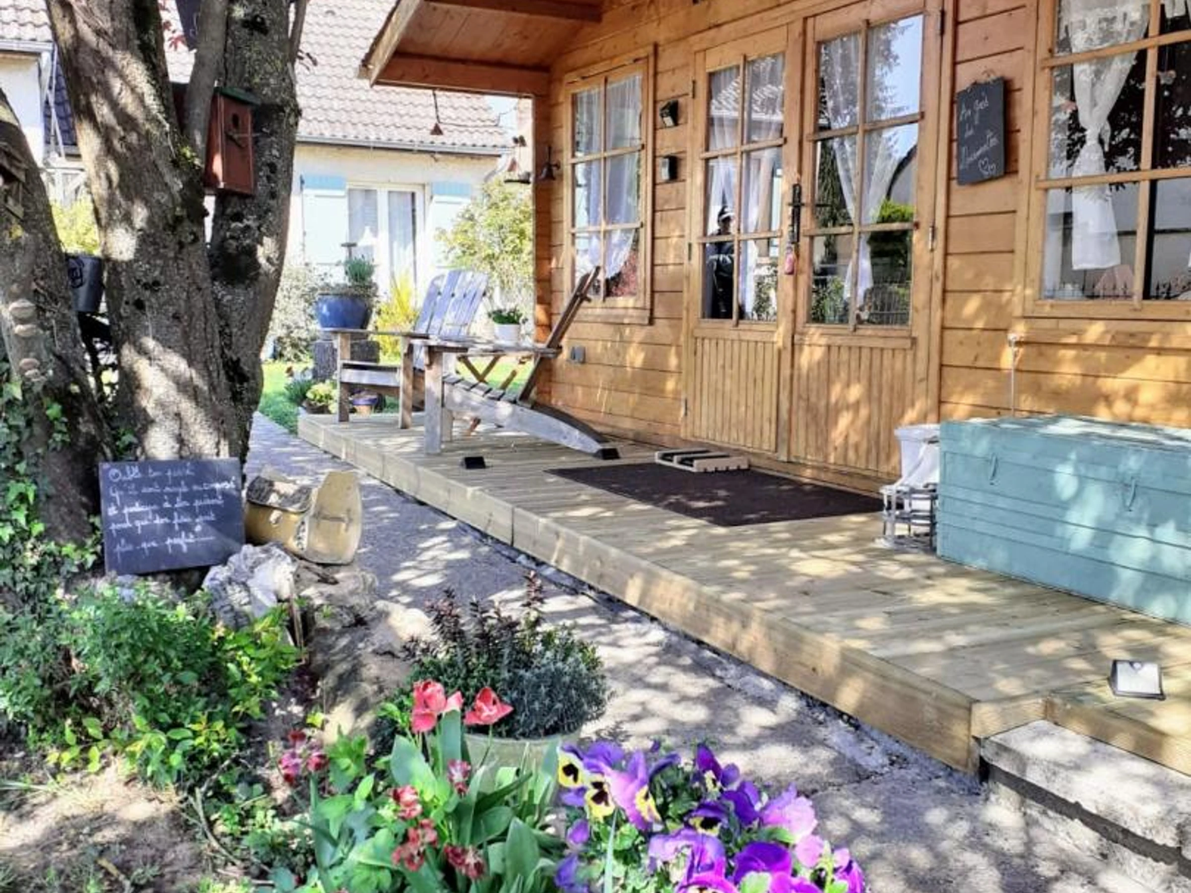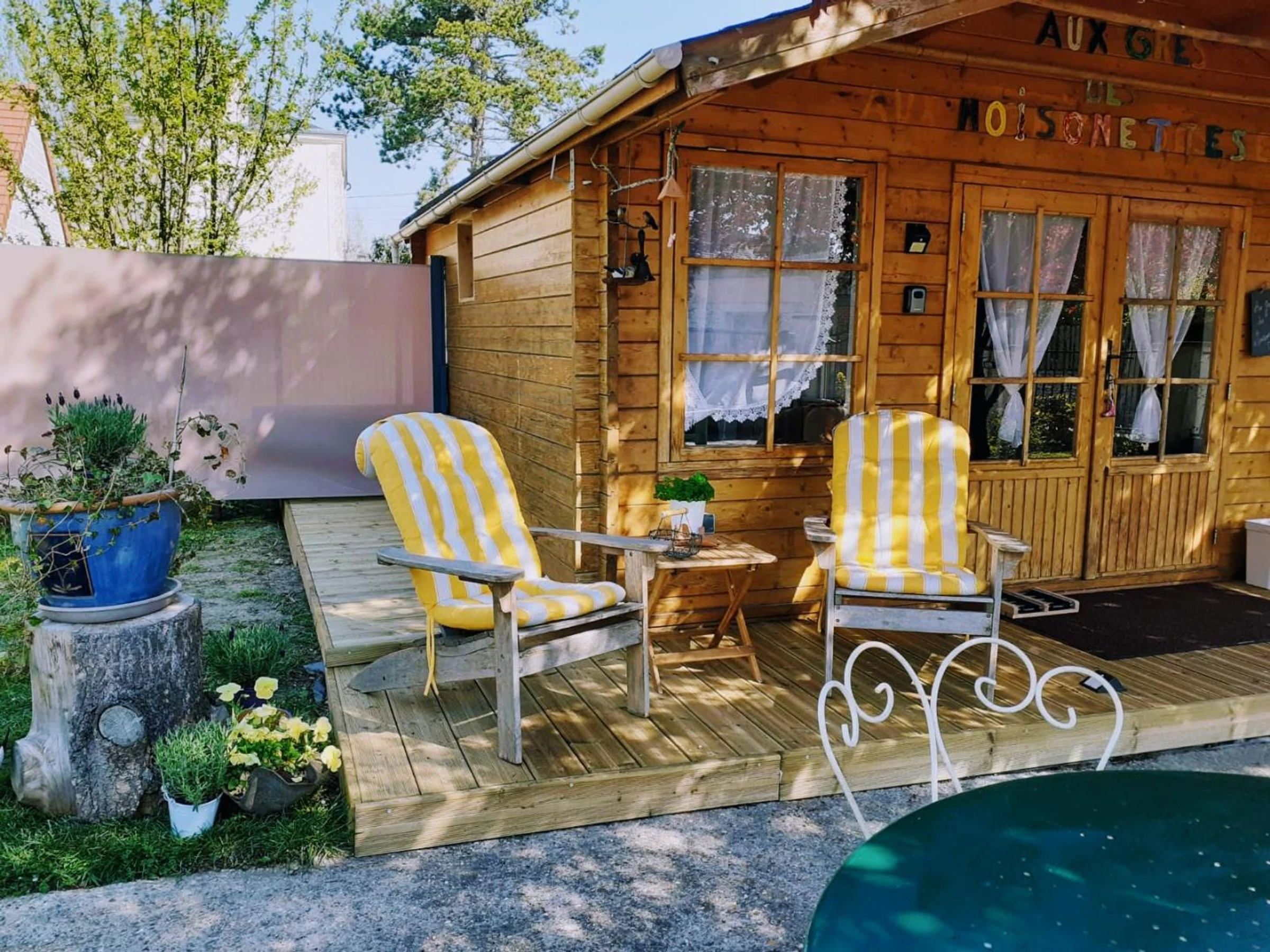 Insolite ! Chalet de 15 m² dans le jardin des propriétaires, côté rue. Extérieurs avec salon de jardin et barbecue électrique, brise-vues extensibles de chaque côté du chalet. Places de parking publiques à 20 mètres du gîte avec surveillance vidéo. Coin cuisine avec plaque 2 feux vitrocéramiques, combiné four micro-ondes, frigo top, cafetière à filtre, cafetière à capsules, grille-pain, bouilloire.