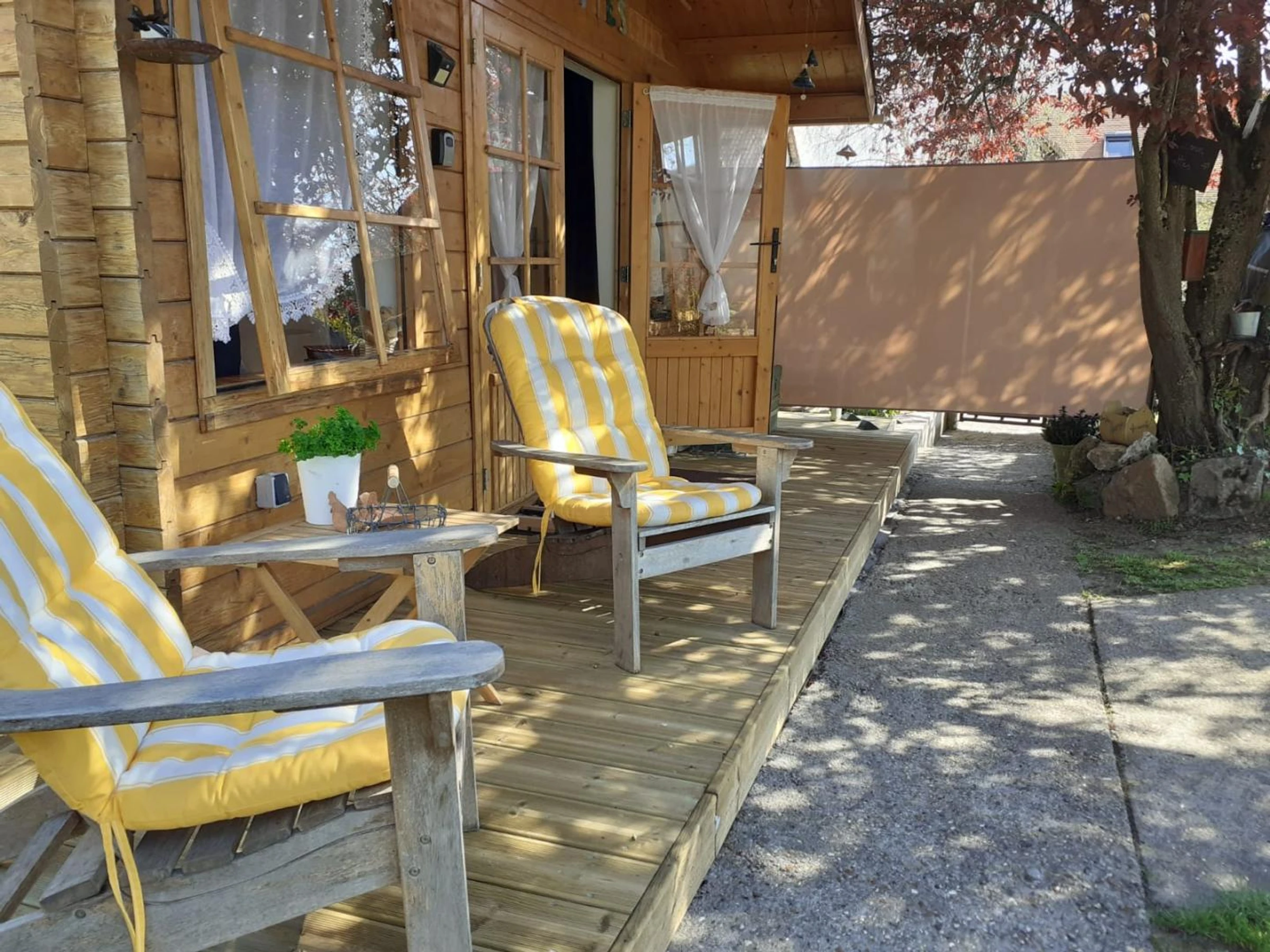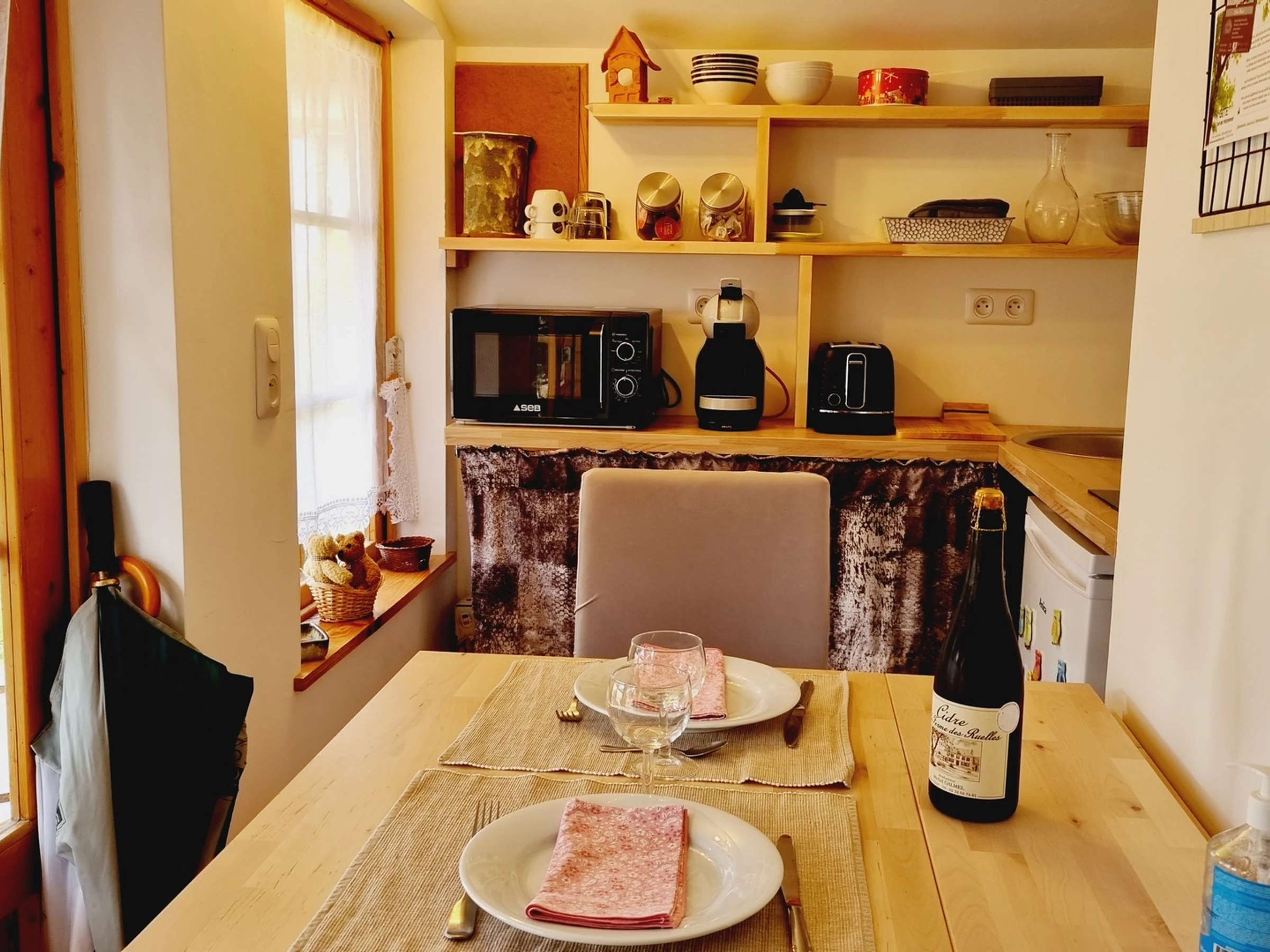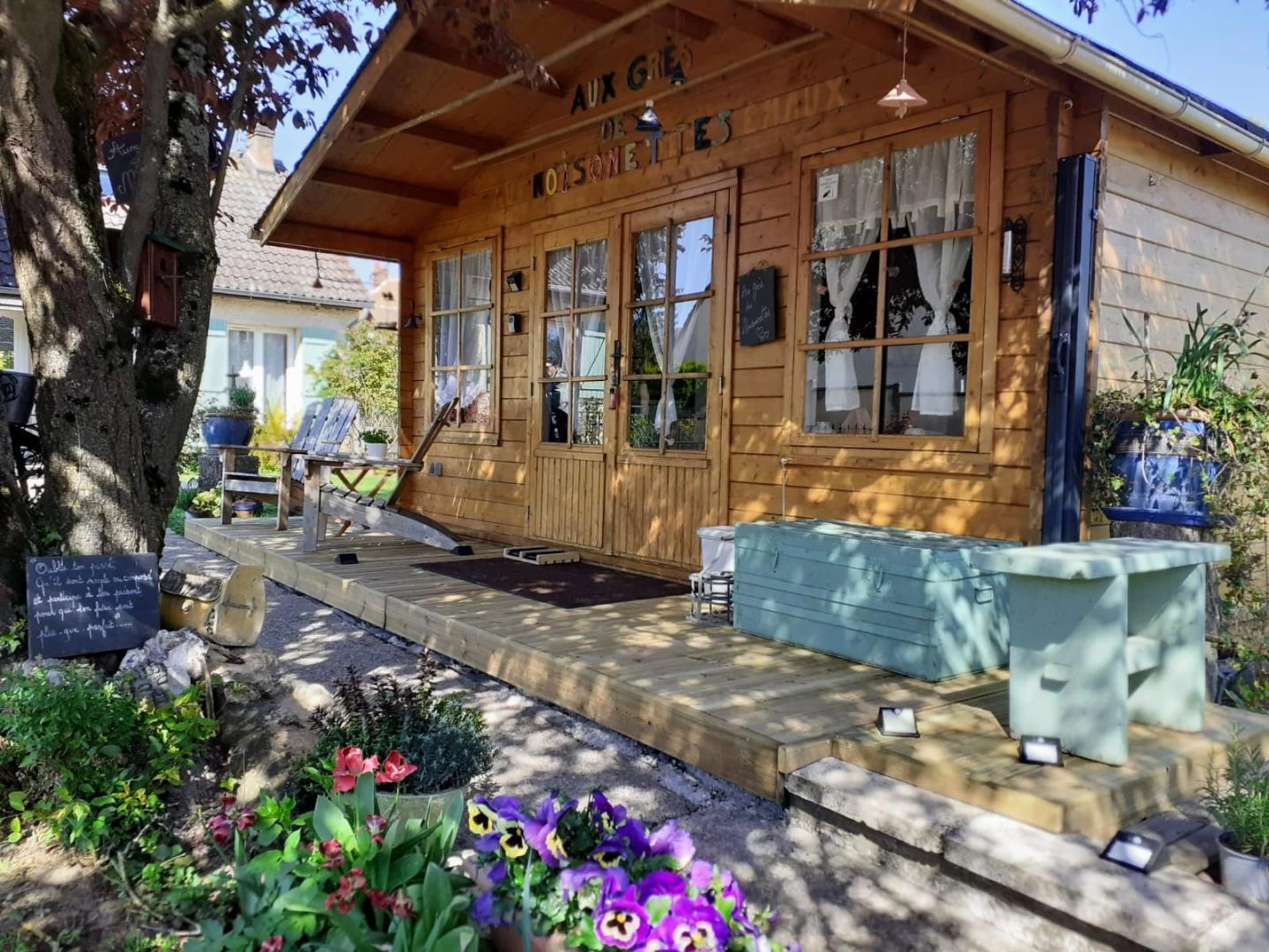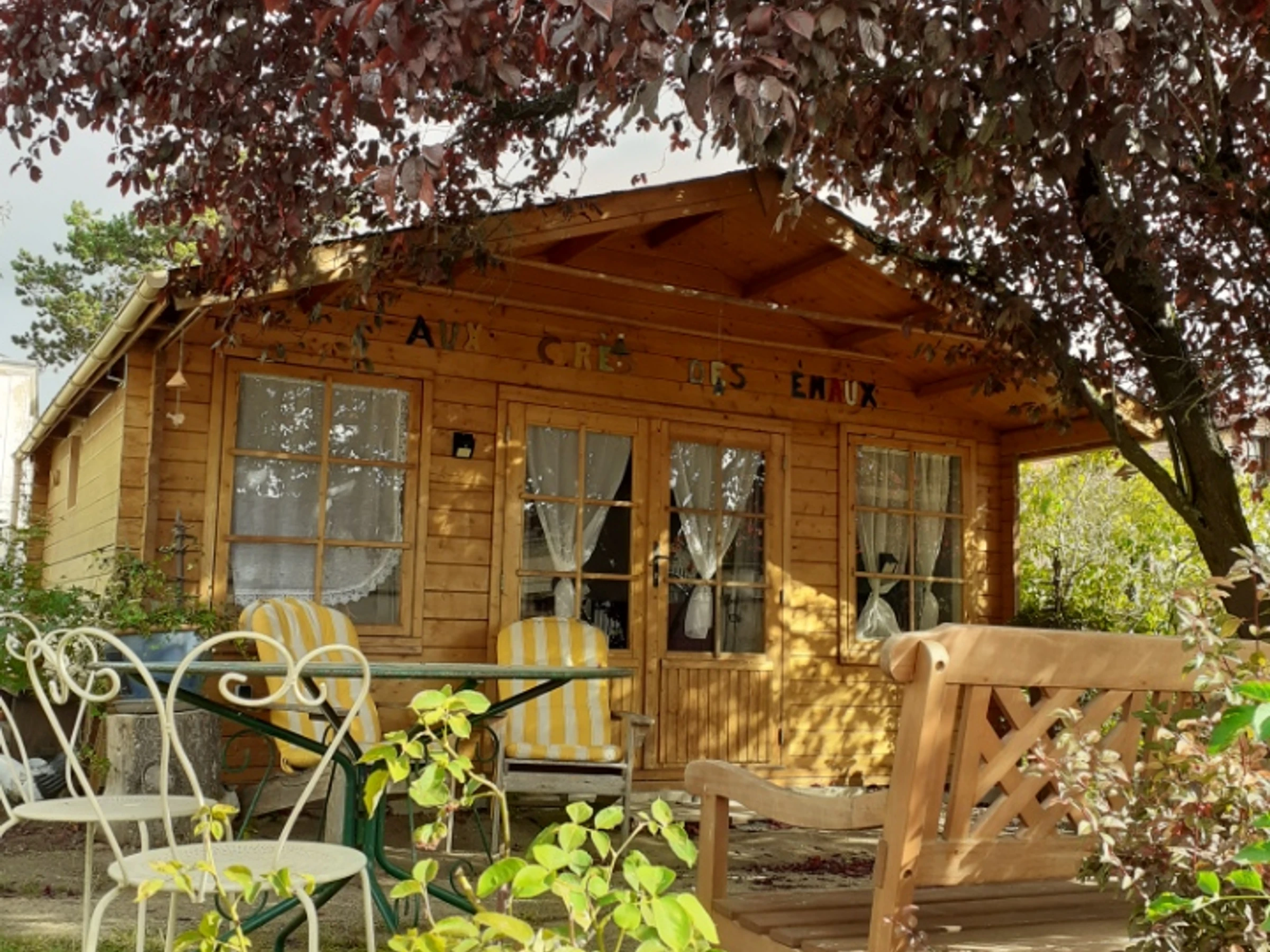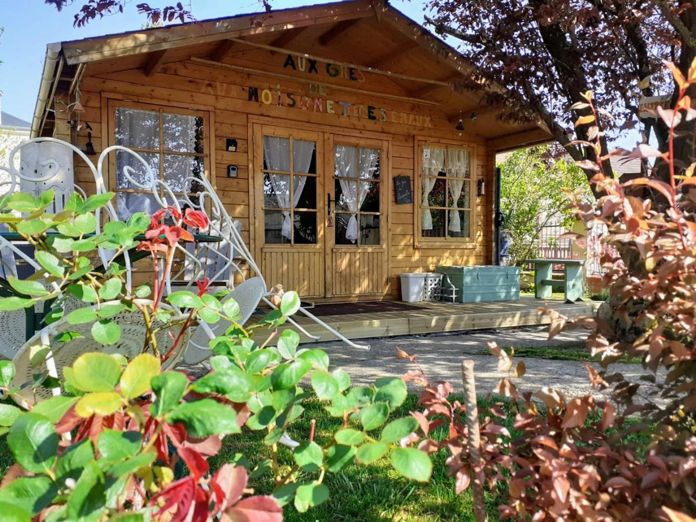 Insolite ! Chalet de 15 m² dans le jardin des propriétaires, côté rue. Extérieurs avec salon de jardin et barbecue électrique, brise-vues extensibles de chaque côté du chalet. Places de parking publiques à 20 mètres du gîte avec surveillance vidéo. Coin cuisine avec plaque 2 feux vitrocéramiques, combiné four micro-ondes, frigo top, cafetière à filtre, cafetière à capsules, grille-pain, bouilloire.
