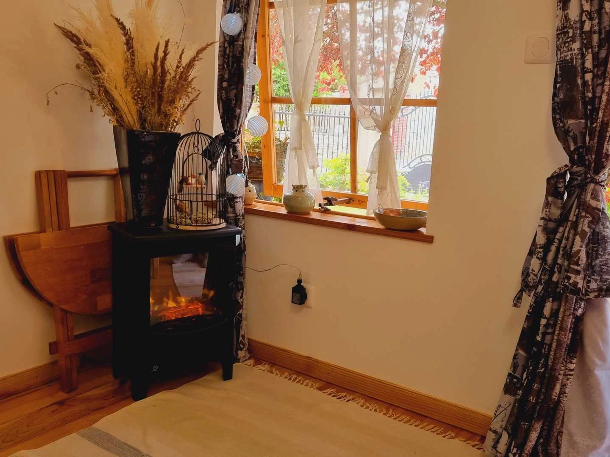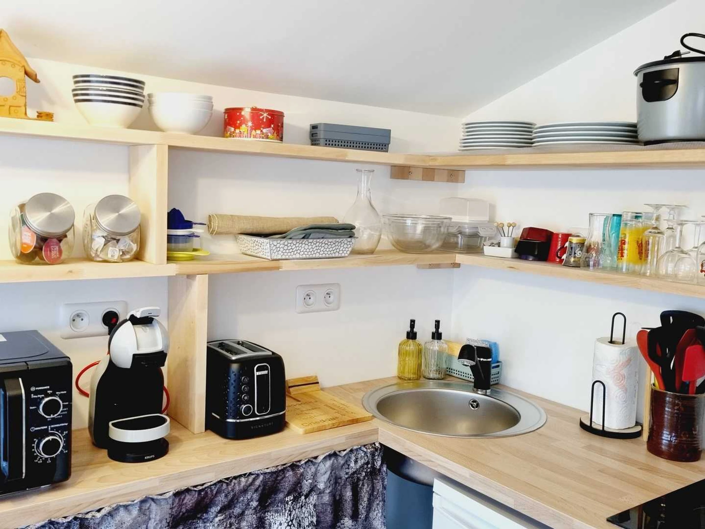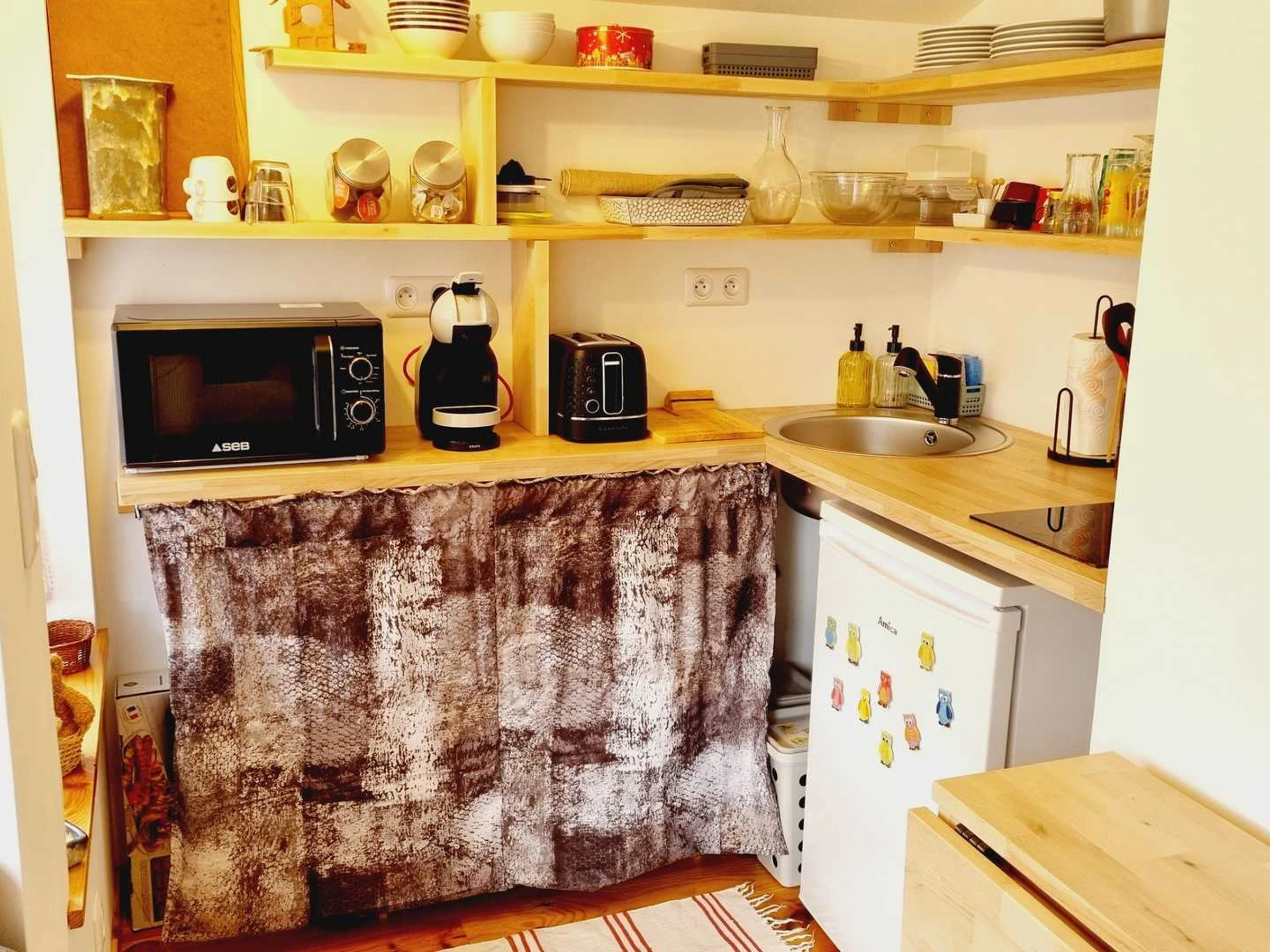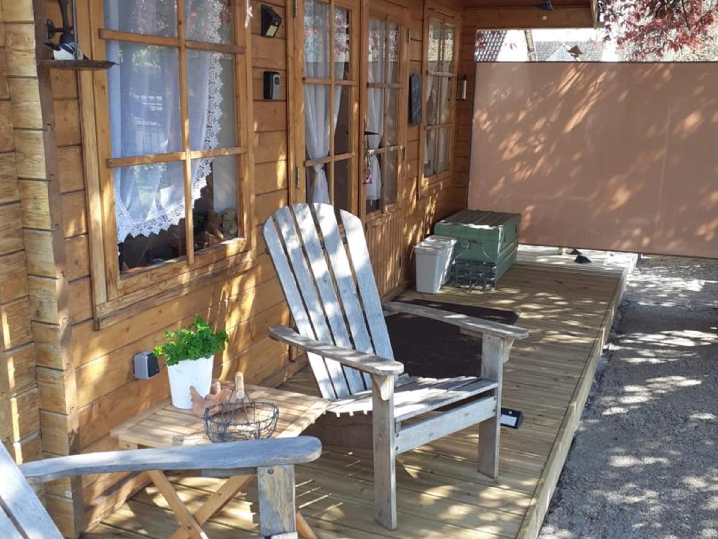 Insolite ! Chalet de 15 m² dans le jardin des propriétaires, côté rue. Extérieurs avec salon de jardin et barbecue électrique, brise-vues extensibles de chaque côté du chalet. Places de parking publiques à 20 mètres du gîte avec surveillance vidéo. Coin cuisine avec plaque 2 feux vitrocéramiques, combiné four micro-ondes, frigo top, cafetière à filtre, cafetière à capsules, grille-pain, bouilloire.