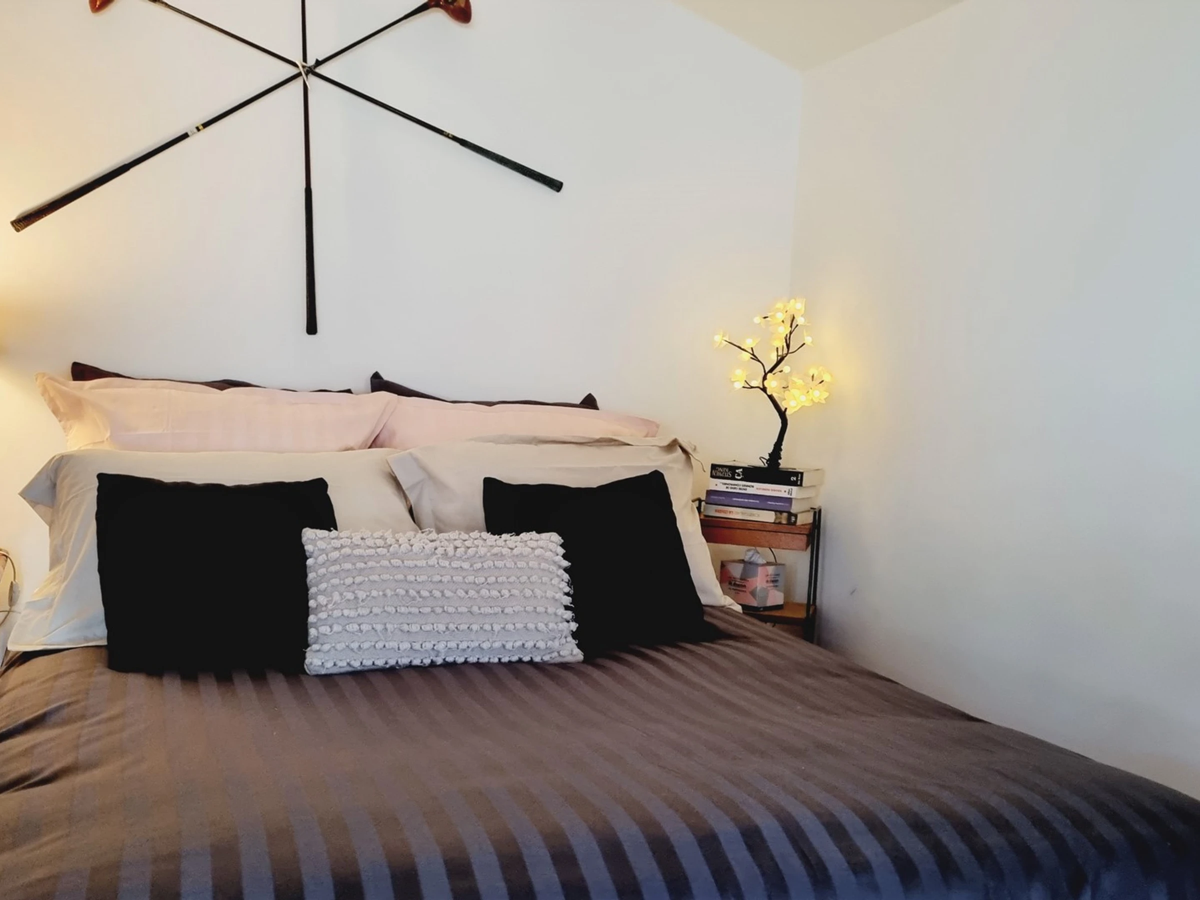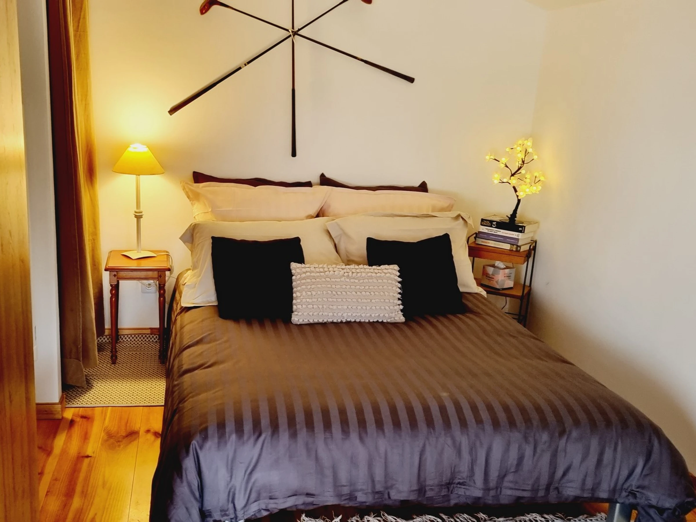Pièce de vie avec un canapé-lit (matelas en 140x190), table pliante avec 2 chaises, TV connectée 80cm.