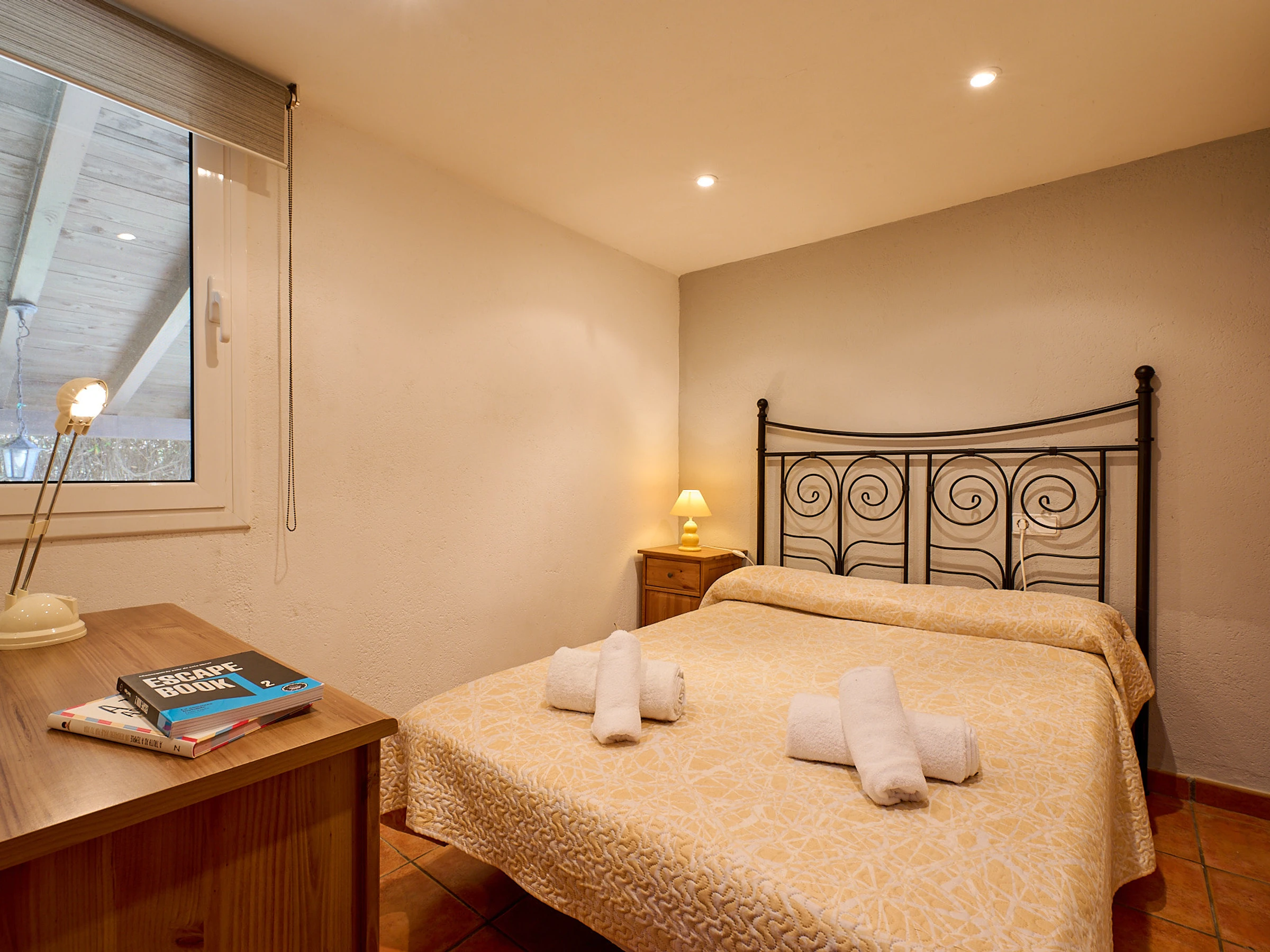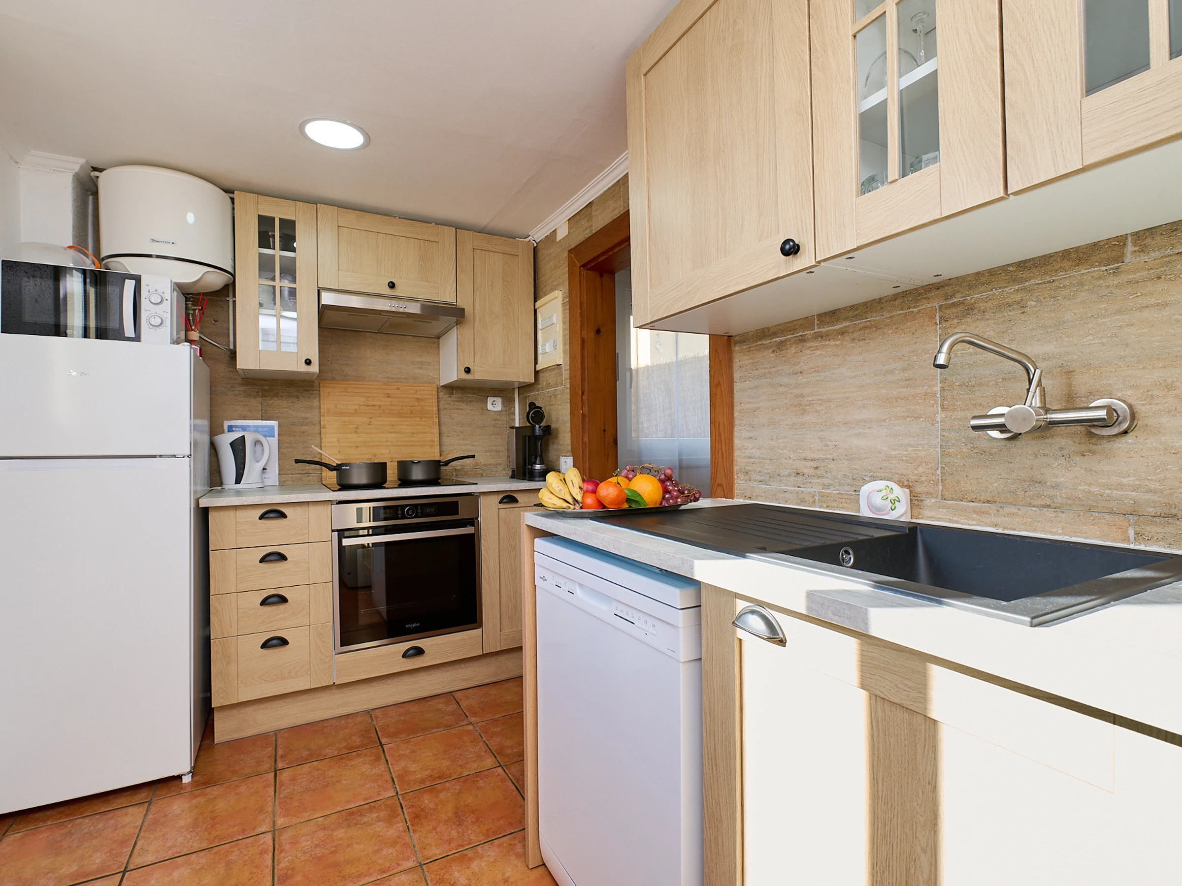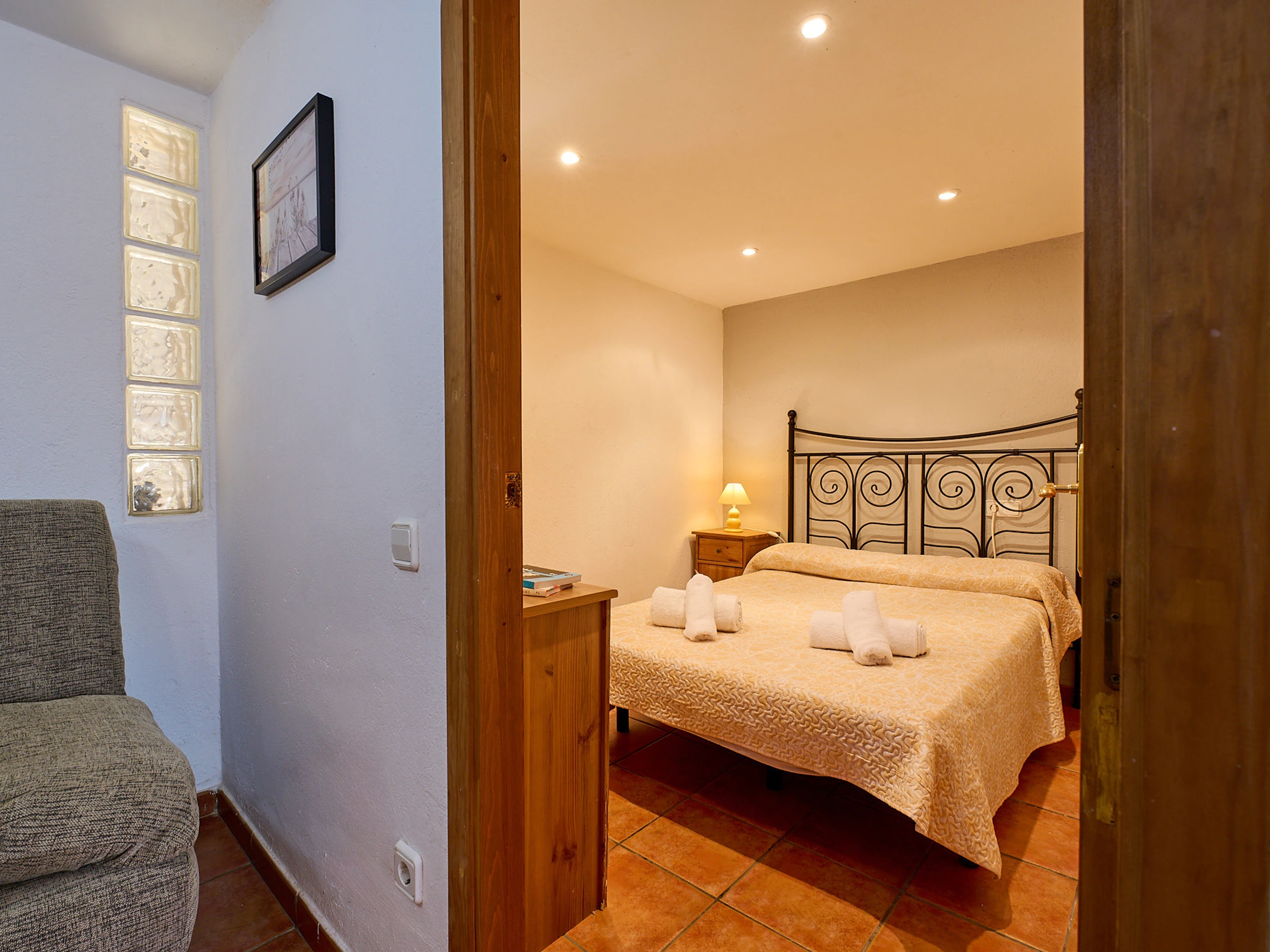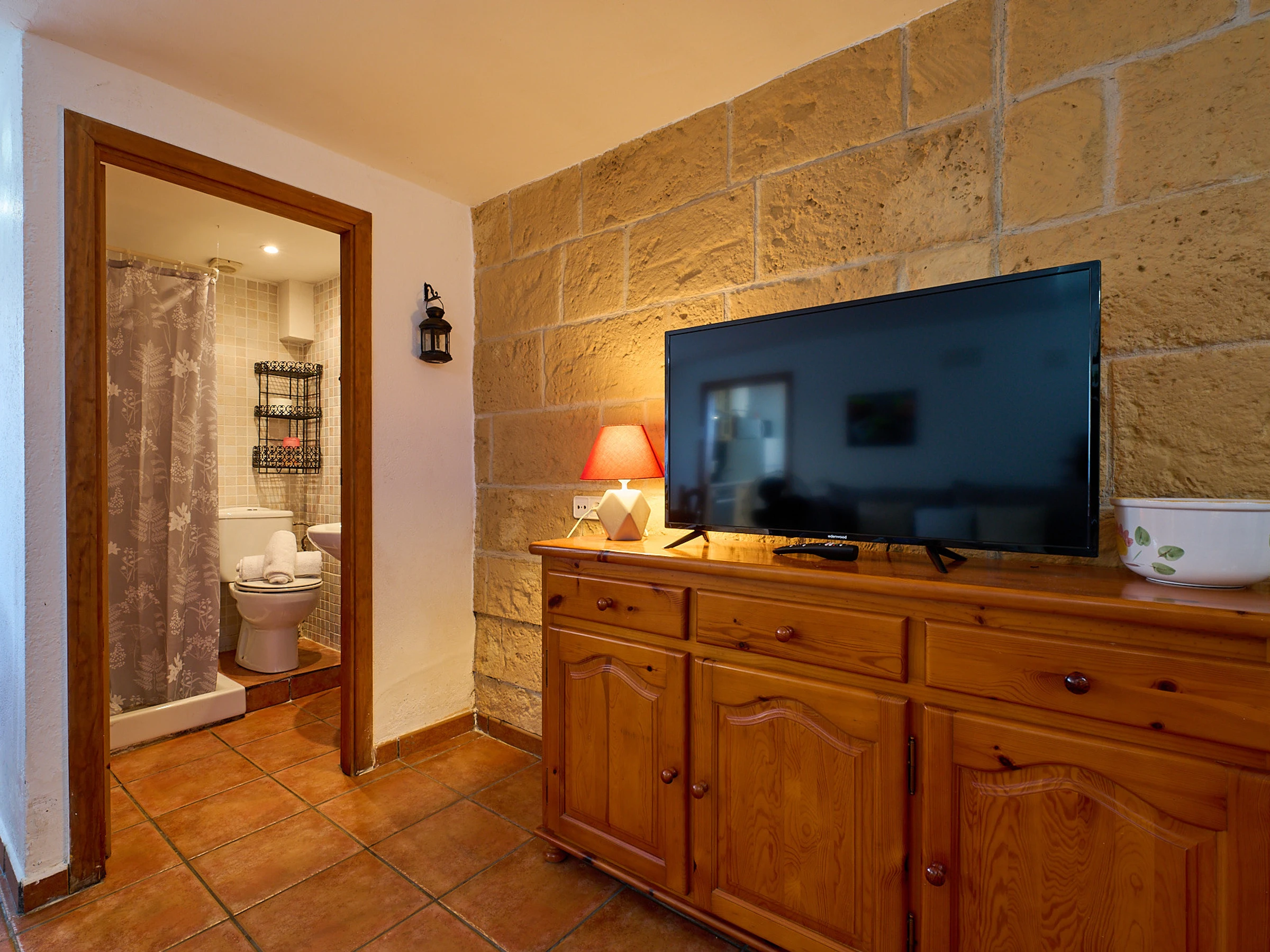 Espace intérieur de 130 m2 réparti sur 2 étages : au rez-de-chaussée, on trouve le salon-salle à manger (tv, cheminée) avec accès à la terrasse offrant de magnifiques vues, cuisine (plaques de gaz, four, micro-ondes, cafetière), lave-linge, 2 chambres avec lit double (140x190cm), 1 chambre avec deux lits (80x180cm et 80x190cm), 1 salle de bain avec baignoire et un toilette. À l'étage inférieur, il y a un appartement totalement indépendant (accès extérieur) avec salon-salle à manger, une petite cuisine (plaque vitrocéramique, four), lave-linge, 1 chambre avec lit double (130x180cm), 1 salle de bain avec douche.