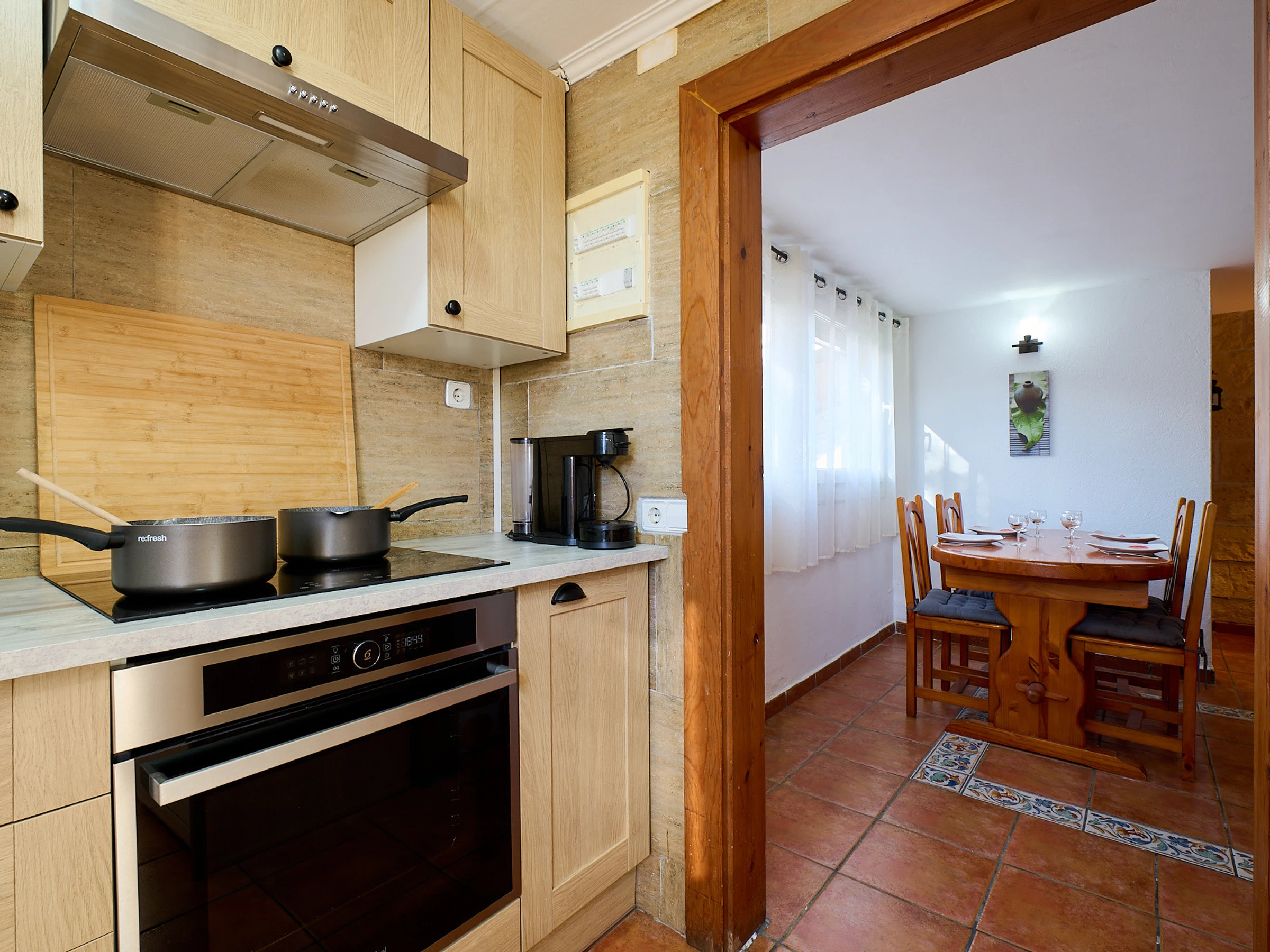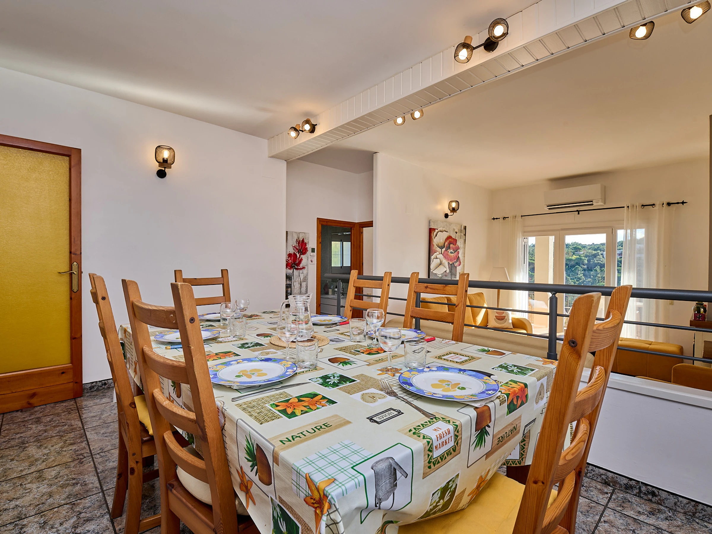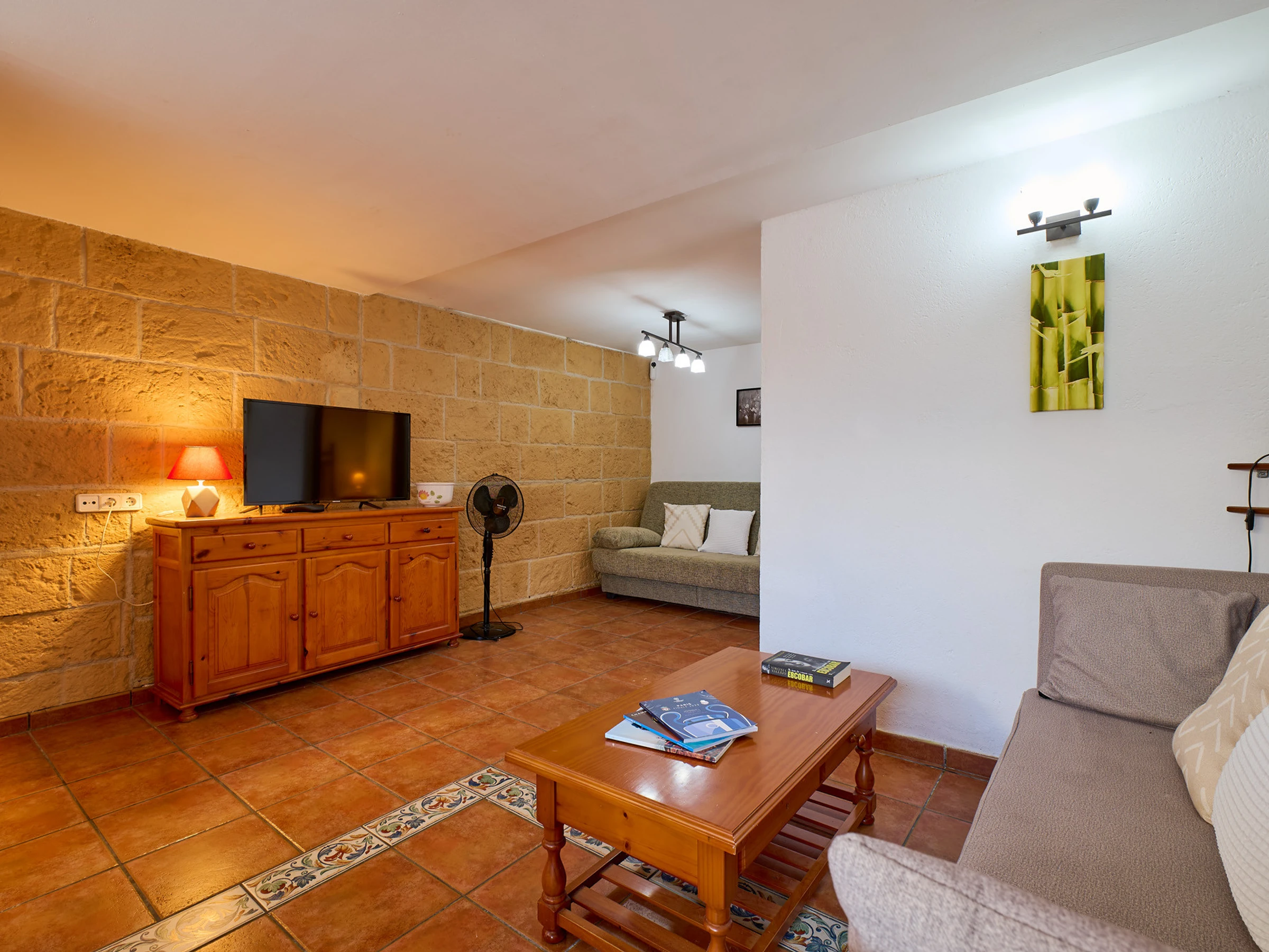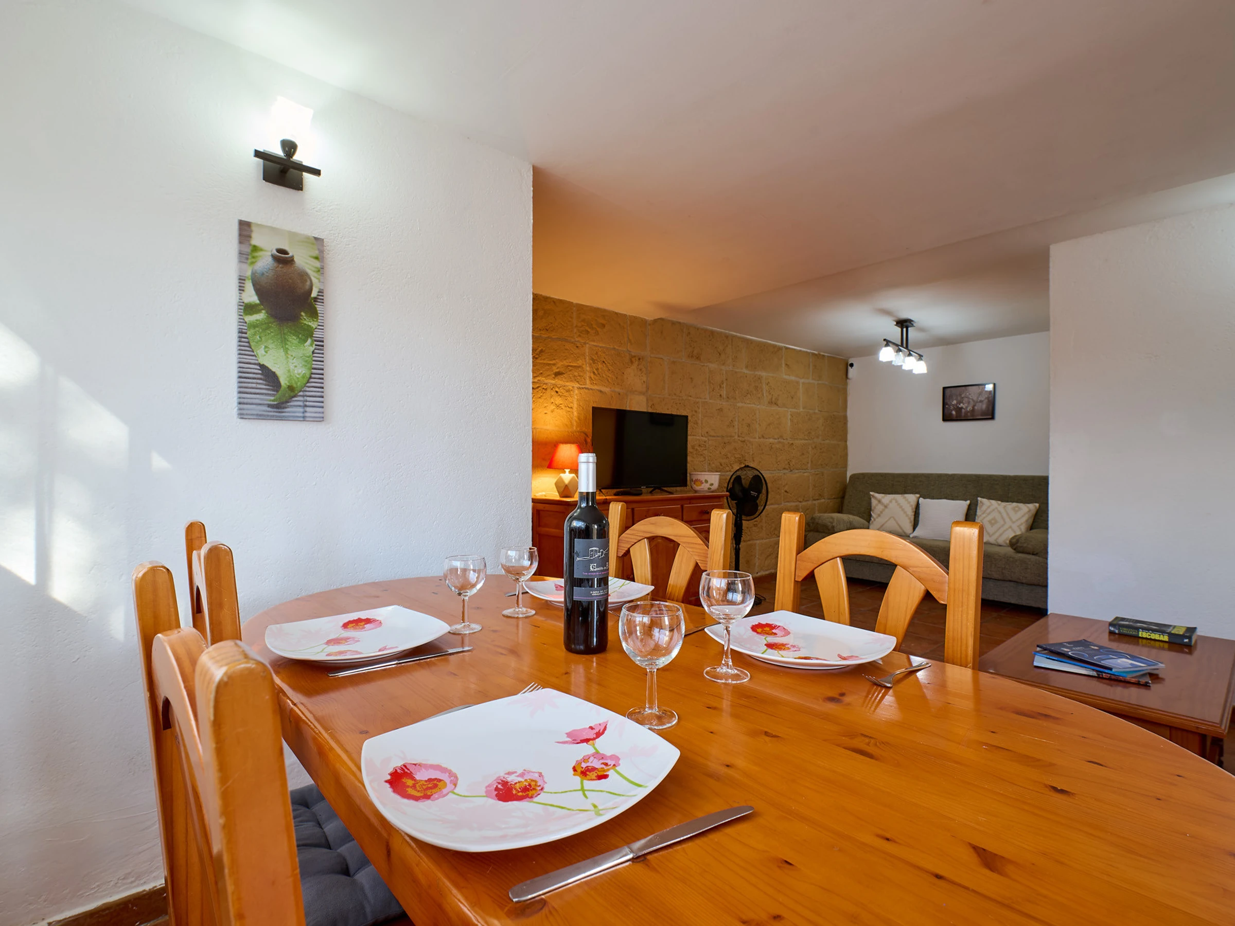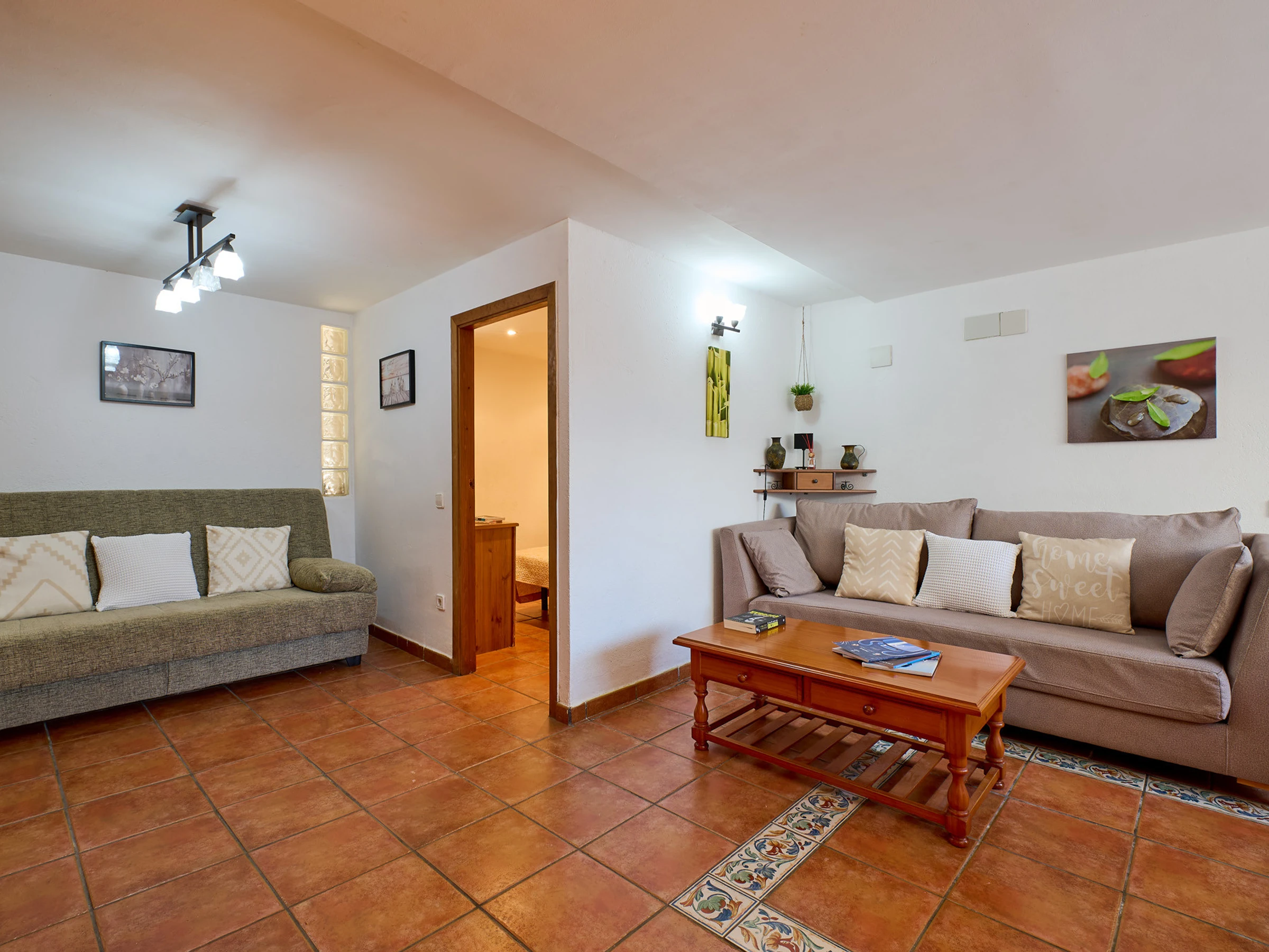 Espace intérieur de 130 m2 réparti sur 2 étages : au rez-de-chaussée, on trouve le salon-salle à manger (tv, cheminée) avec accès à la terrasse offrant de magnifiques vues, cuisine (plaques de gaz, four, micro-ondes, cafetière), lave-linge, 2 chambres avec lit double (140x190cm), 1 chambre avec deux lits (80x180cm et 80x190cm), 1 salle de bain avec baignoire et un toilette. À l'étage inférieur, il y a un appartement totalement indépendant (accès extérieur) avec salon-salle à manger, une petite cuisine (plaque vitrocéramique, four), lave-linge, 1 chambre avec lit double (130x180cm), 1 salle de bain avec douche.