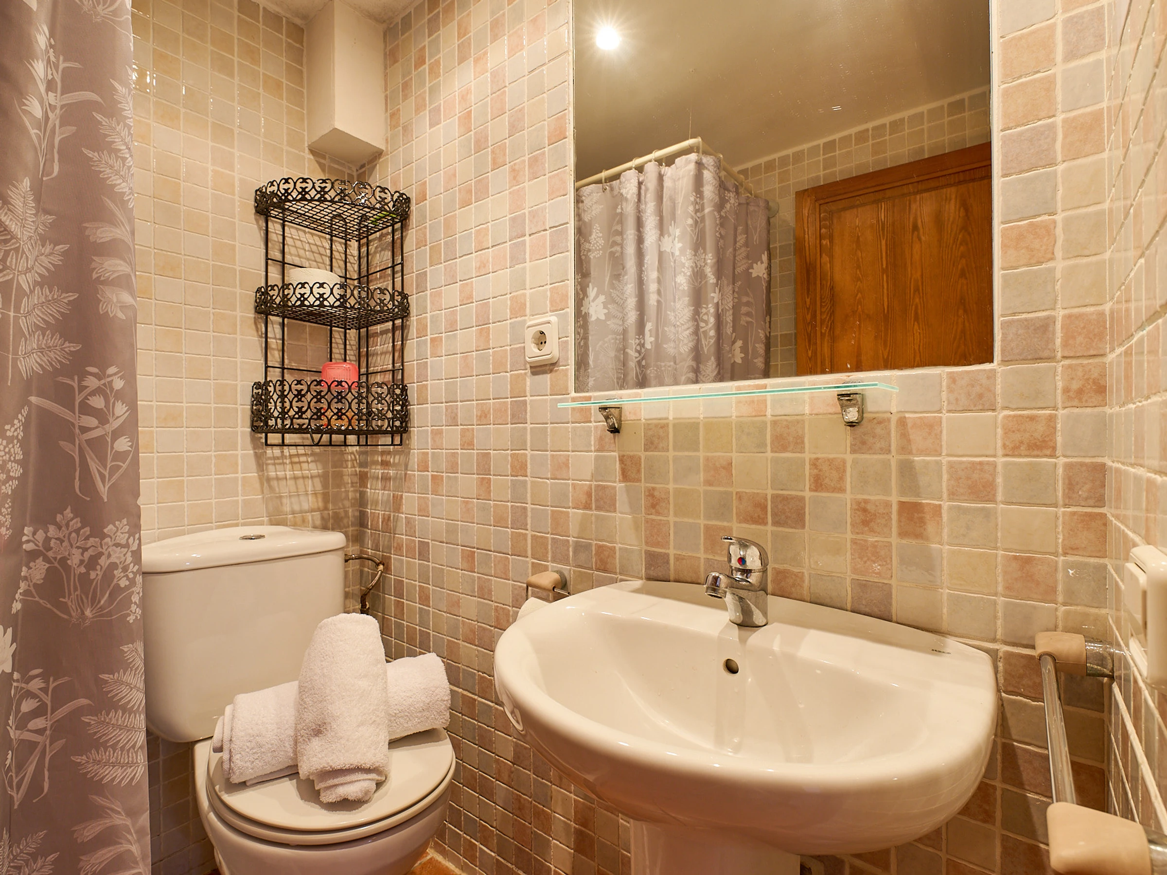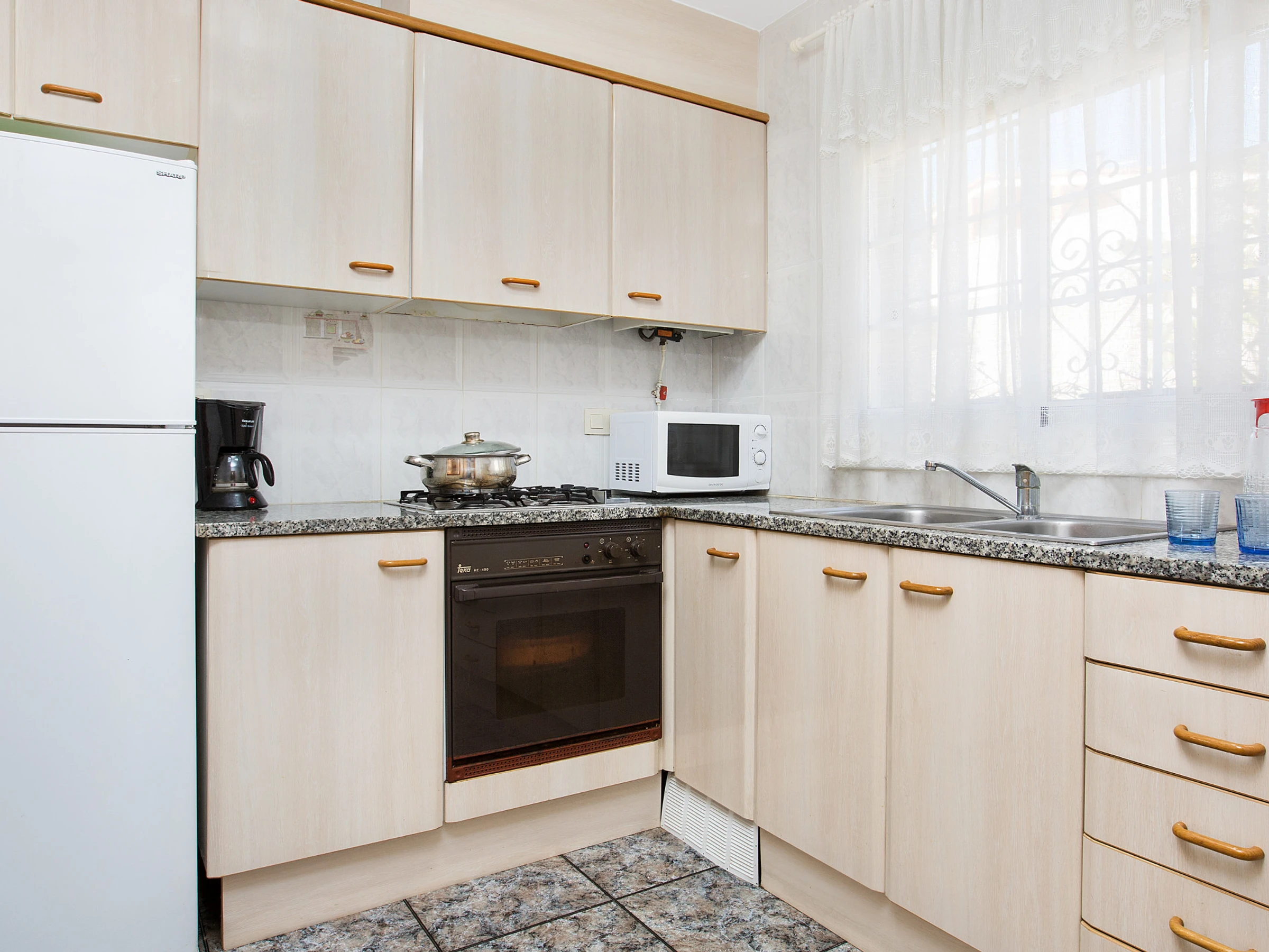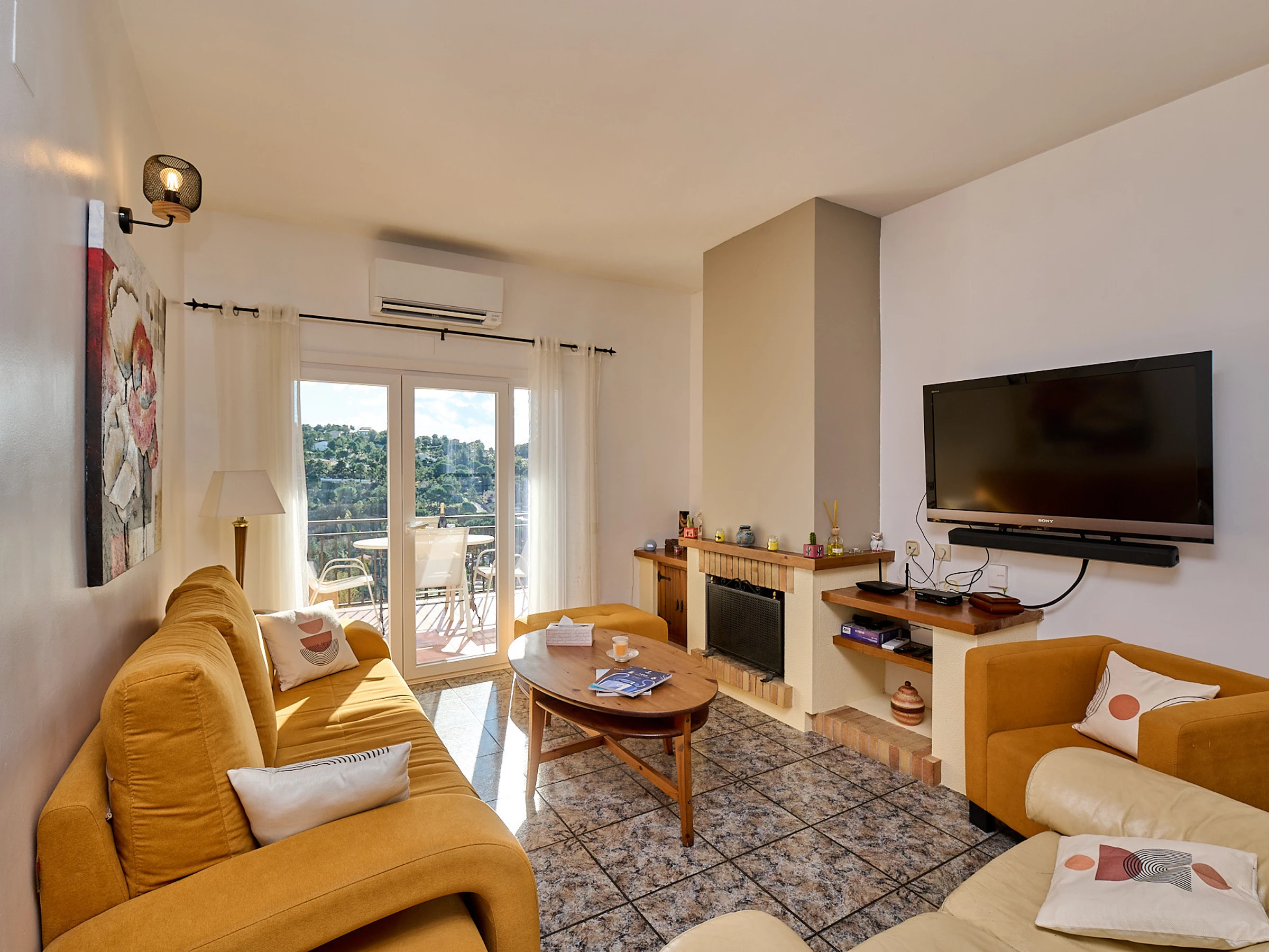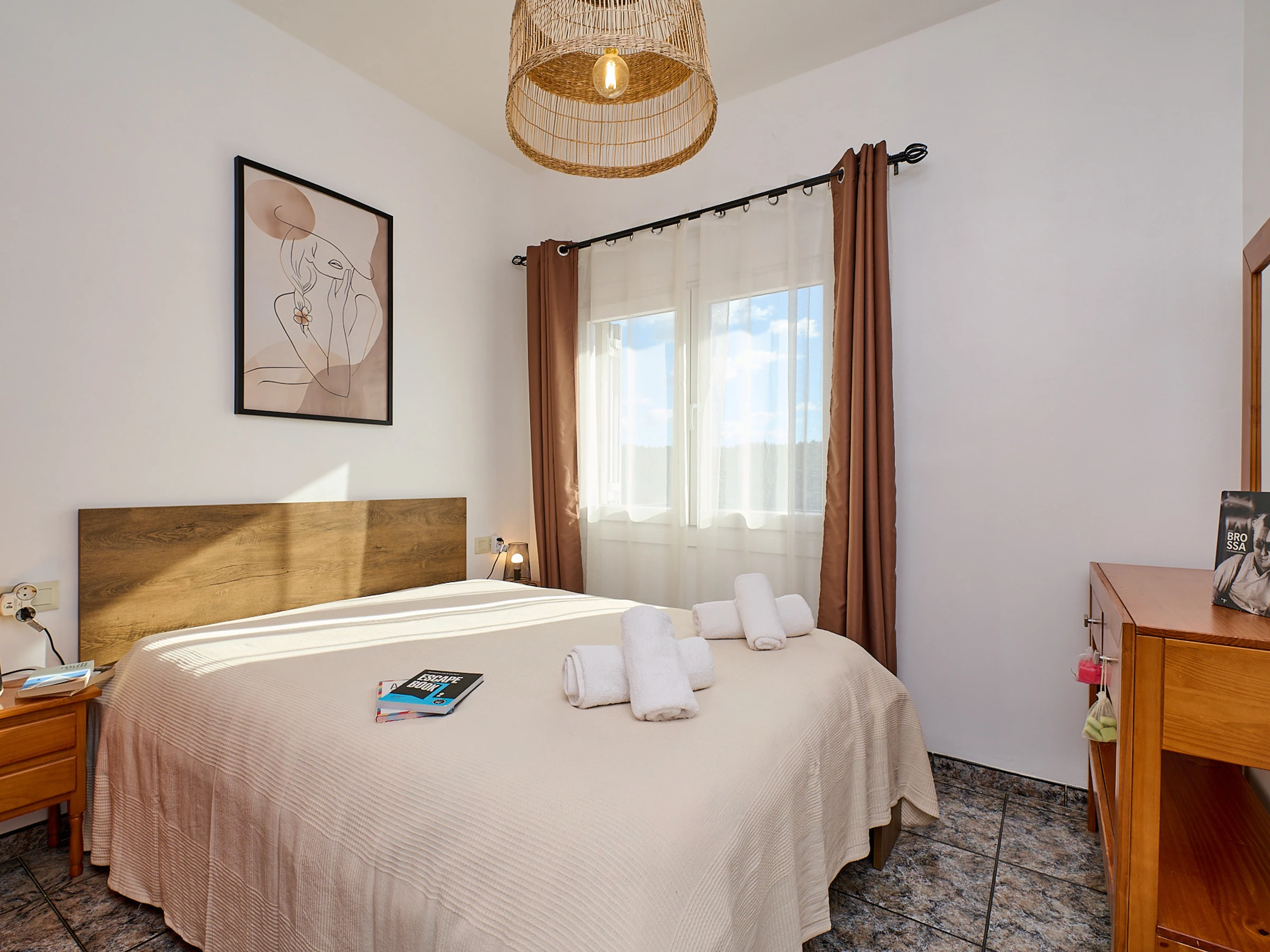 Espace intérieur de 130 m2 réparti sur 2 étages : au rez-de-chaussée, on trouve le salon-salle à manger (tv, cheminée) avec accès à la terrasse offrant de magnifiques vues, cuisine (plaques de gaz, four, micro-ondes, cafetière), lave-linge, 2 chambres avec lit double (140x190cm), 1 chambre avec deux lits (80x180cm et 80x190cm), 1 salle de bain avec baignoire et un toilette. À l'étage inférieur, il y a un appartement totalement indépendant (accès extérieur) avec salon-salle à manger, une petite cuisine (plaque vitrocéramique, four), lave-linge, 1 chambre avec lit double (130x180cm), 1 salle de bain avec douche.