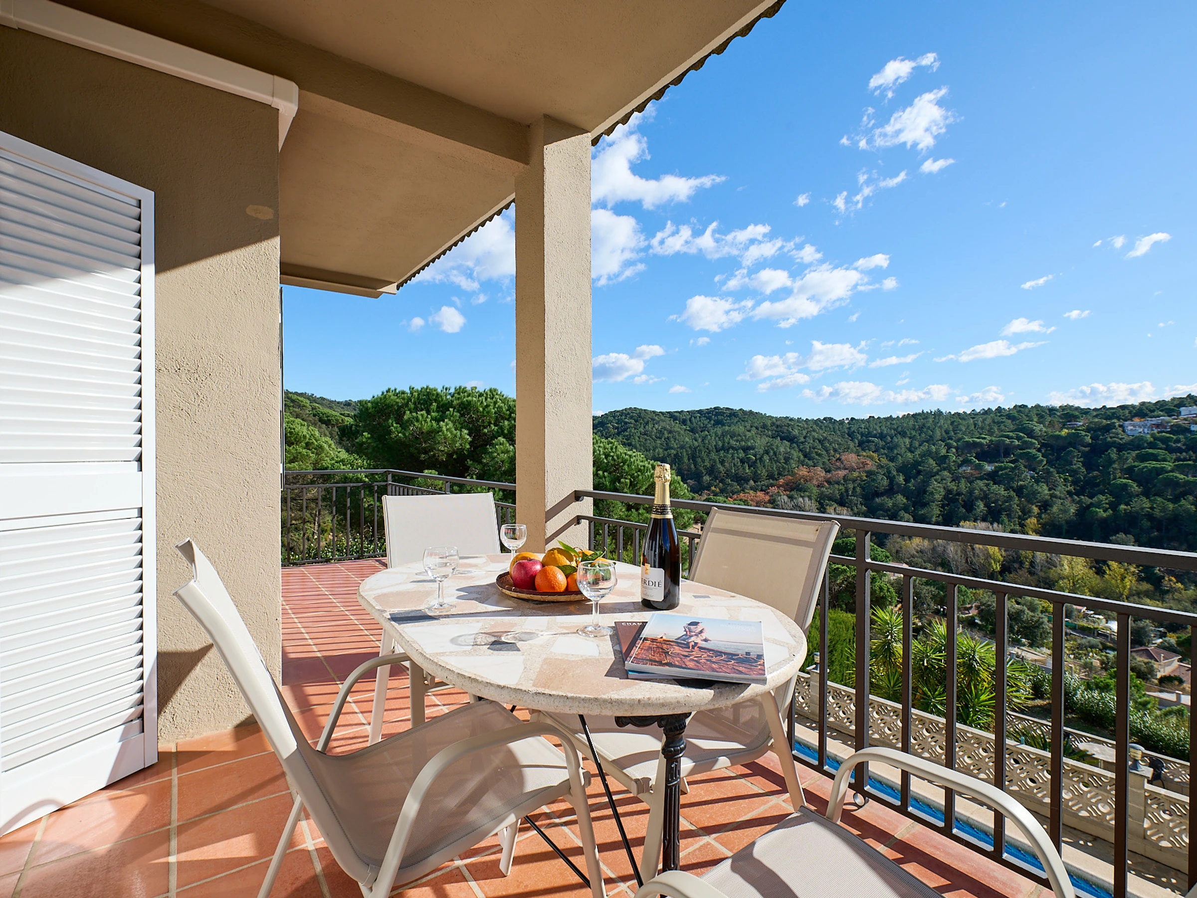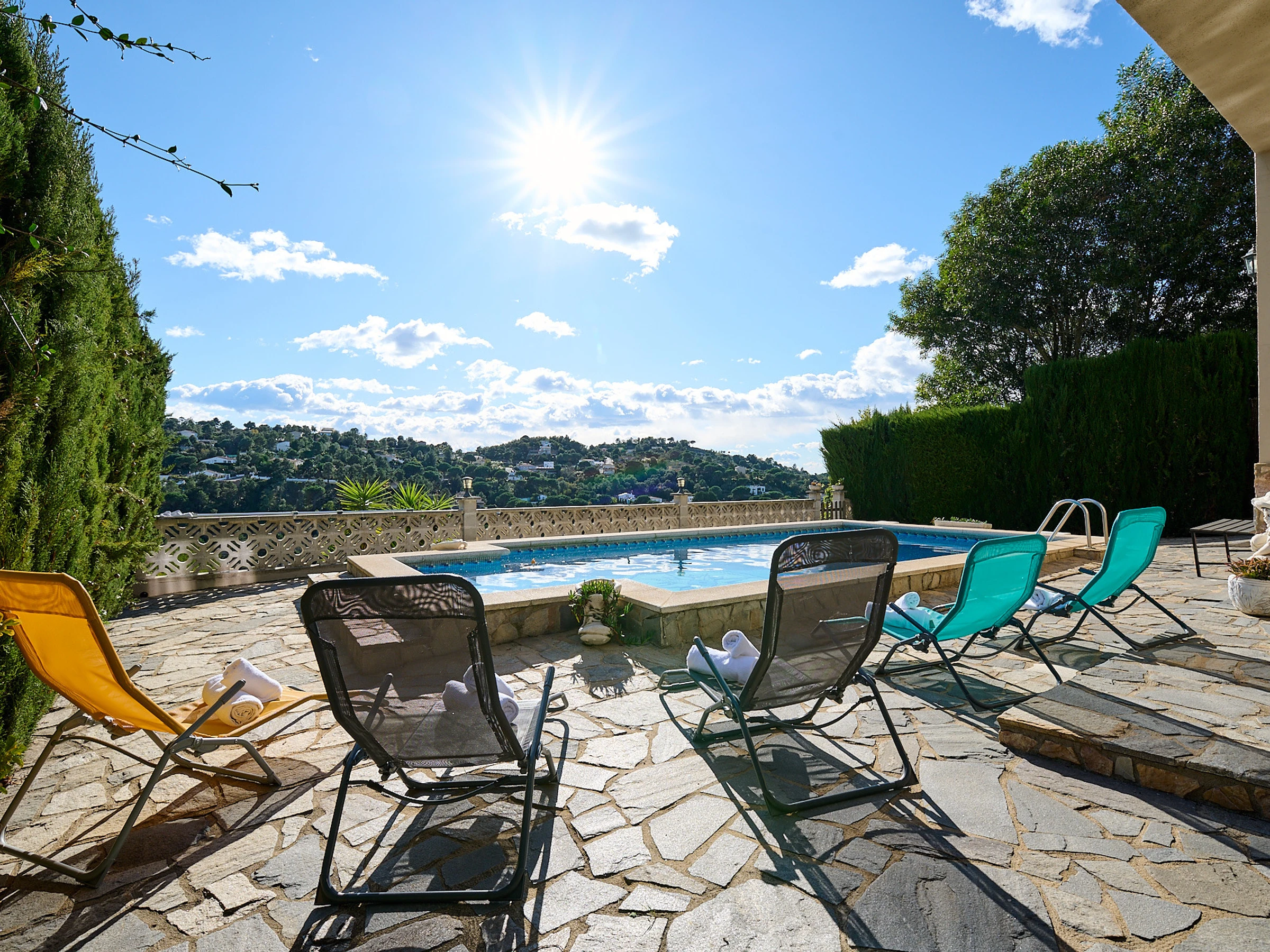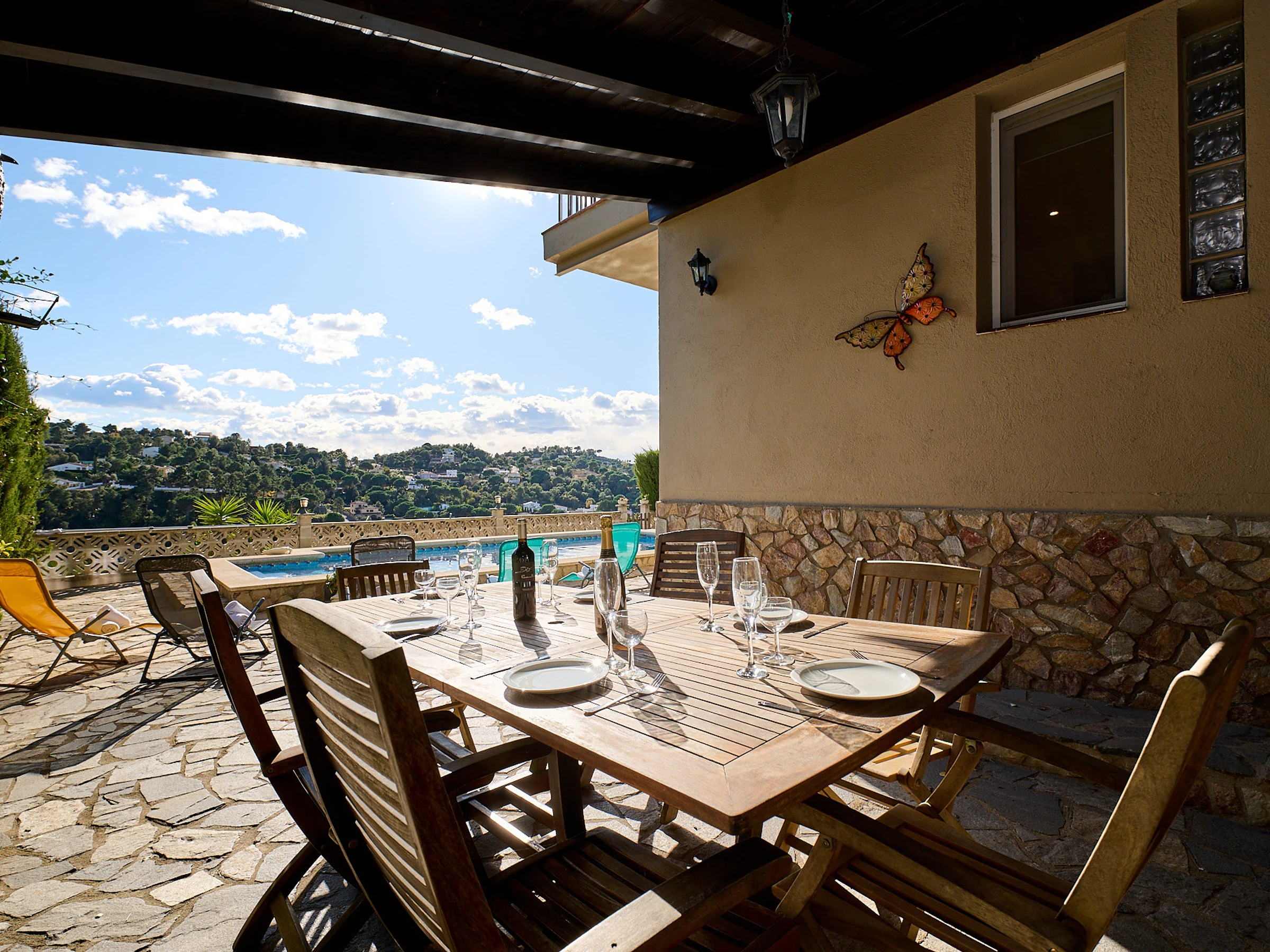 Espace extérieur avec piscine privée offrant de belles vues sur la montagne, zone de barbecue entièrement couverte où vous pourrez profiter des petits-déjeuners et des repas face à la piscine. Il y a aussi un jardin et la possibilité de garer 2 voitures, l'une derrière l'autre.