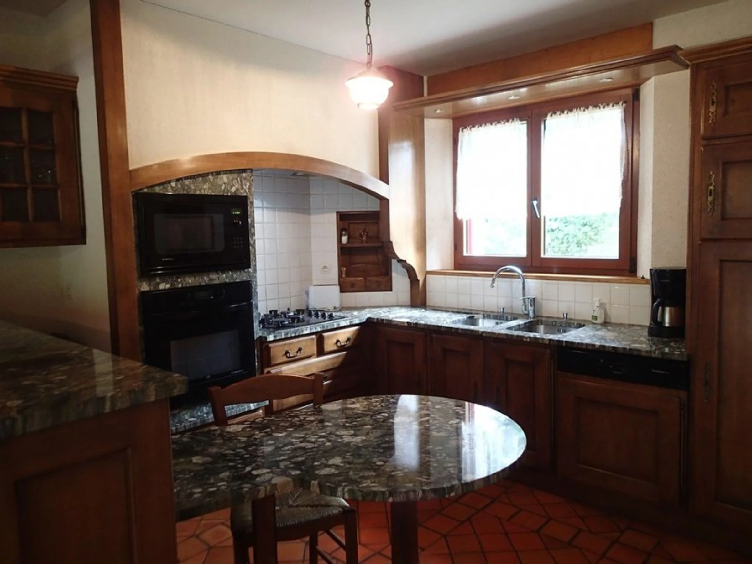 Cuisine aménagée et équipée (lave-vaisselle, réfrigérateur, congélateur, feux gaz, micro-ondes, cafetière, grille-pain)