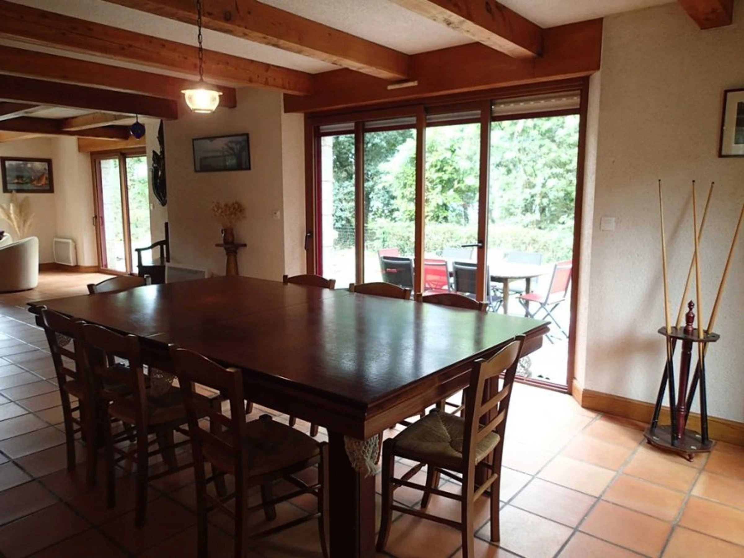 Salon-séjour (télévision) avec cheminée (décorative), billard et baies coulissantes ouvrant sur la terrasse (mobilier de jardin, barbecue) et la piscine