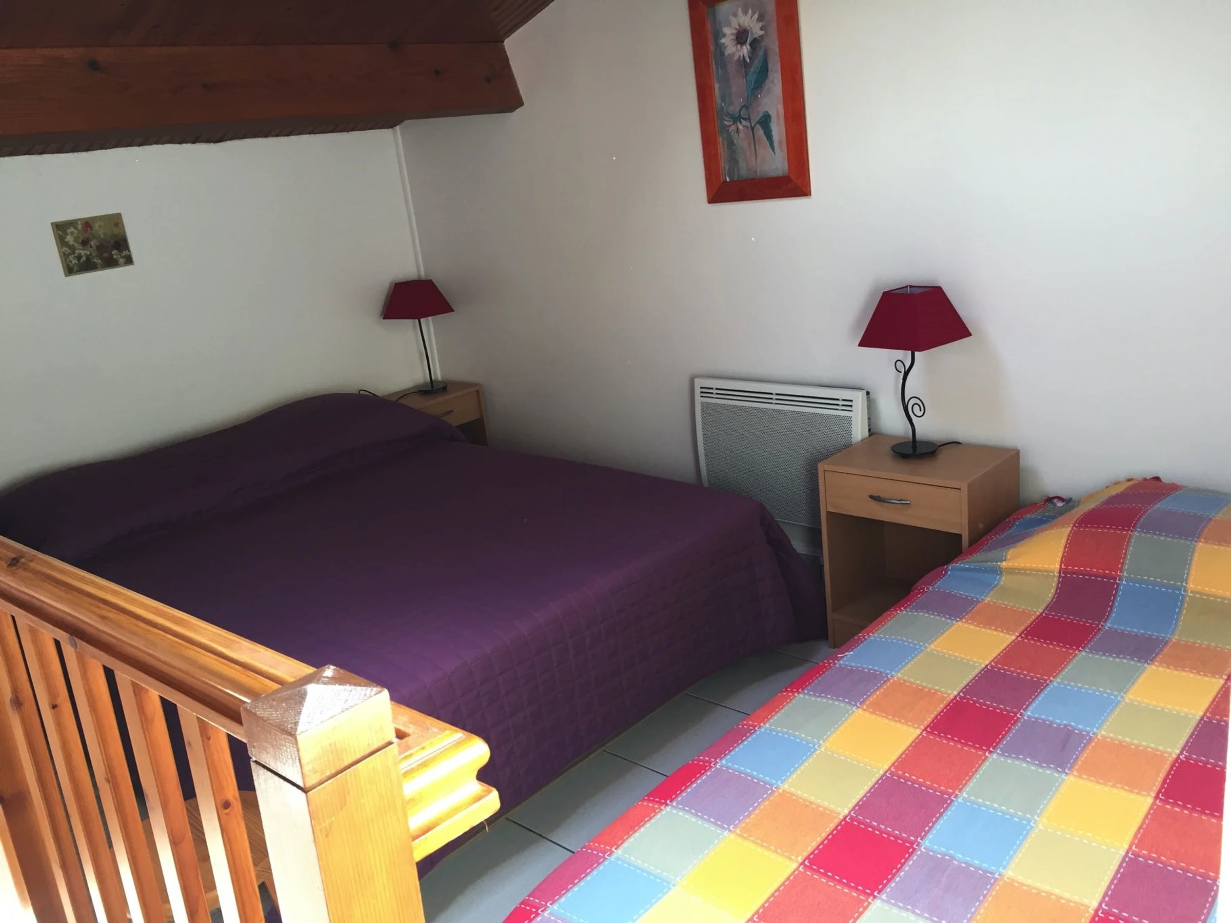 À l’étage supérieur, une chambre cabine offre un lit double (140 cm) et un lit simple (90 cm), tandis qu’une seconde chambre dispose de deux lits simples (90 cm).