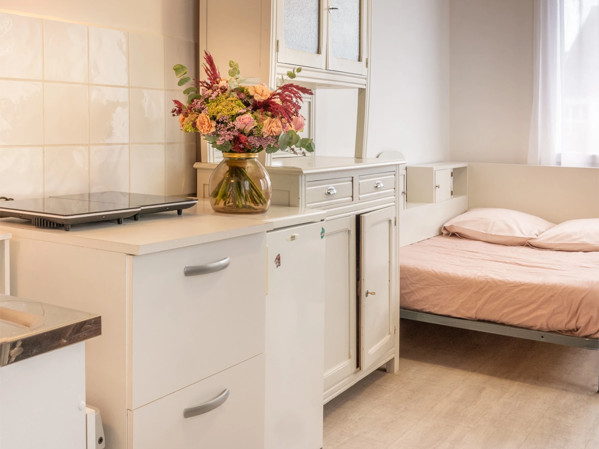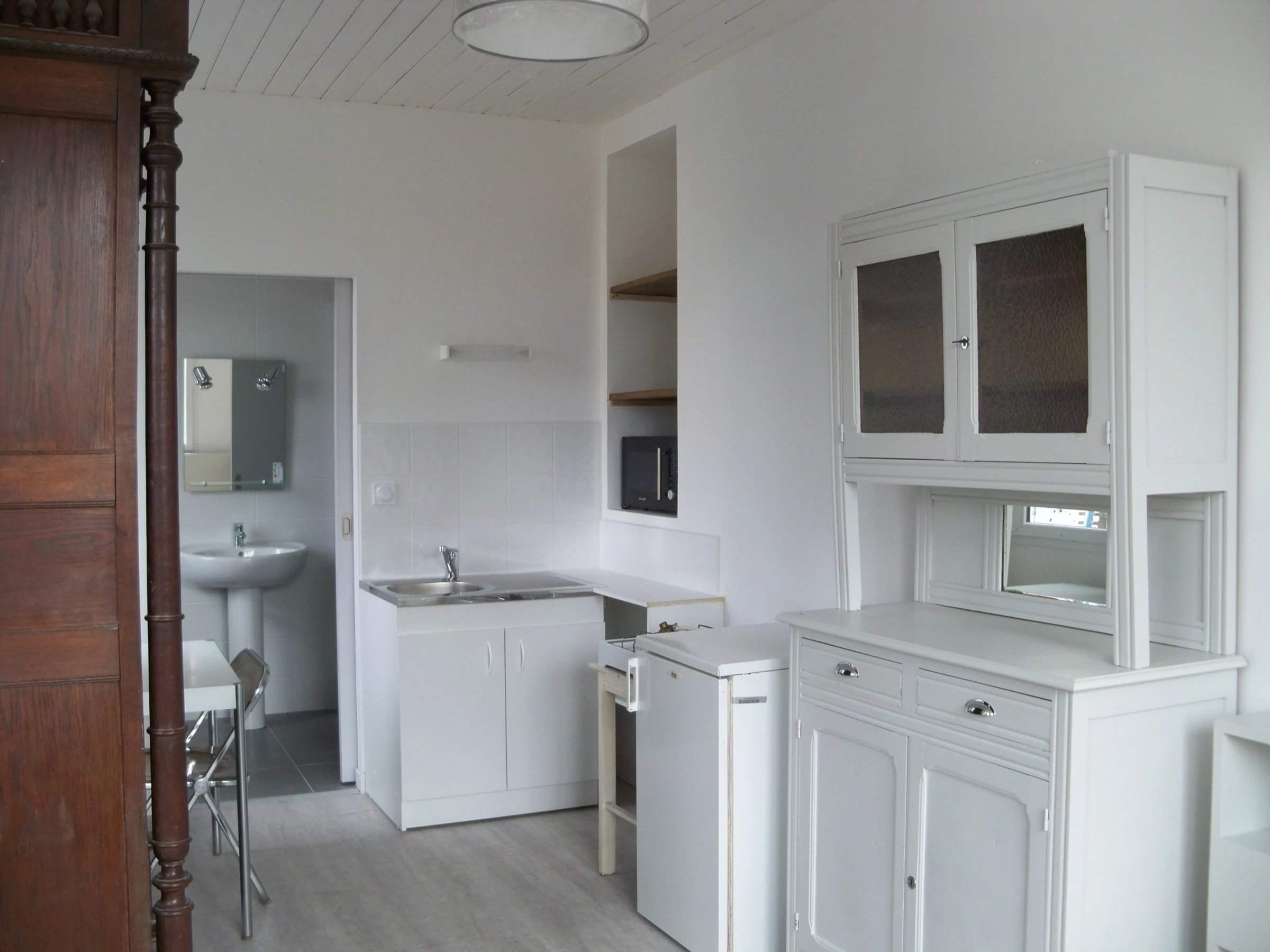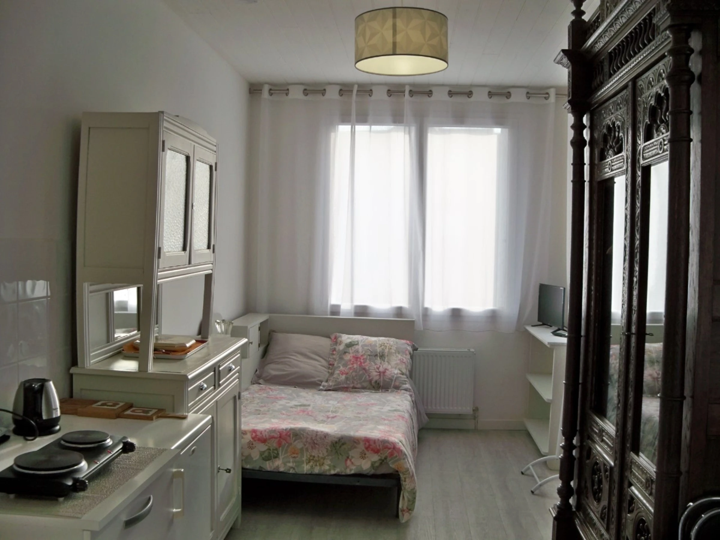 Limite Merville, dans maison d'habitation où loge le propriétaire, studio indépendant lumineux qui se compose d'un coin cuisine (plaque portative vitrocéramique 2 feux, four combiné micro-ondes), un coin nuit avec un lit 120, une salle d'eau avec WC. Logement équipé de WIFI partagée.