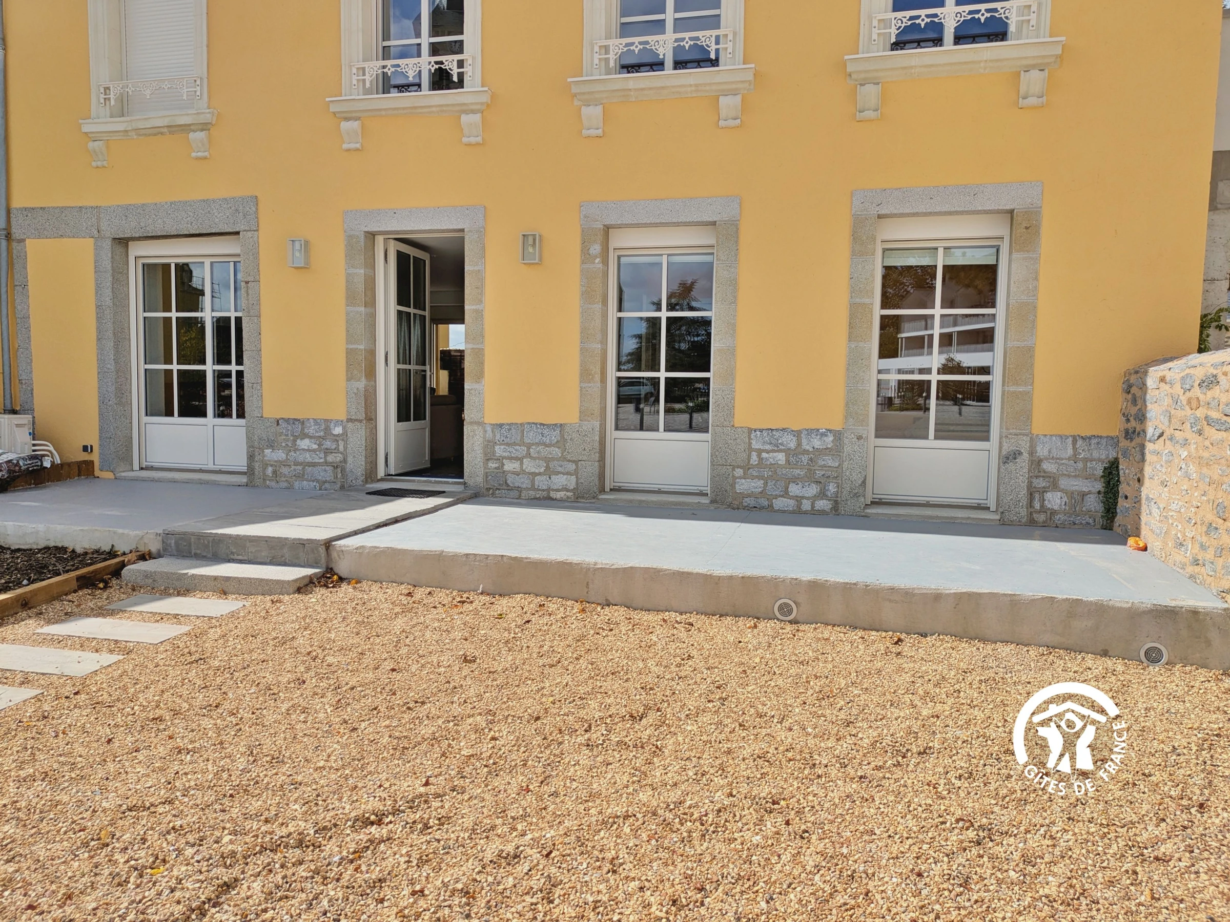 Autre gîte à l'étage : H53G031423, pour 8 personnes Hébergement de plain-pied, sur un seul niveau : Pièce de vie (27,8 m²) : cuisine aménagée et équipée (évier, four, plaque vitrocéramique 3 feux, hotte, micro-ondes, grille-pain, bouilloire, cafetière à filtre, lave-vaisselle, réfrigérateur, congélateur, mixeur), séjour avec table à manger, coin salon avec canapé, fauteuil (convertible en lit 1 place) et télévision. Ouverture sur une terrasse (6,5 m²) avec petit salon - Dégagement : machine lavante séchante - Chambre (13 m²) : 1 lit 140×190 et 1 lit 90×190, placard avec étagères et penderie, deux portes-fenêtres donnant sur l’extérieur - Salle d’eau (6 m²) : douche, lavabo, sèche serviettes, sèche-cheveux, WC.