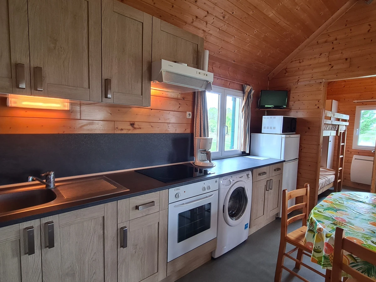 De plain-pied (3 marches pour accèder au chalet): cuisine équipée, coin repas et coin salon - 2 chambres (1 lit 2 personnes, 2 lits 80 cm superposés) - salle d'eau - wc. Un canapé-lit pour 2 personnes dans la pièce de vie.
