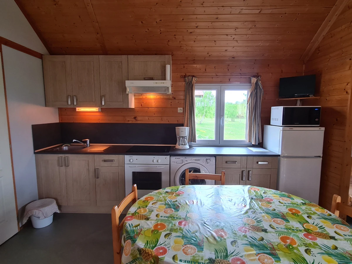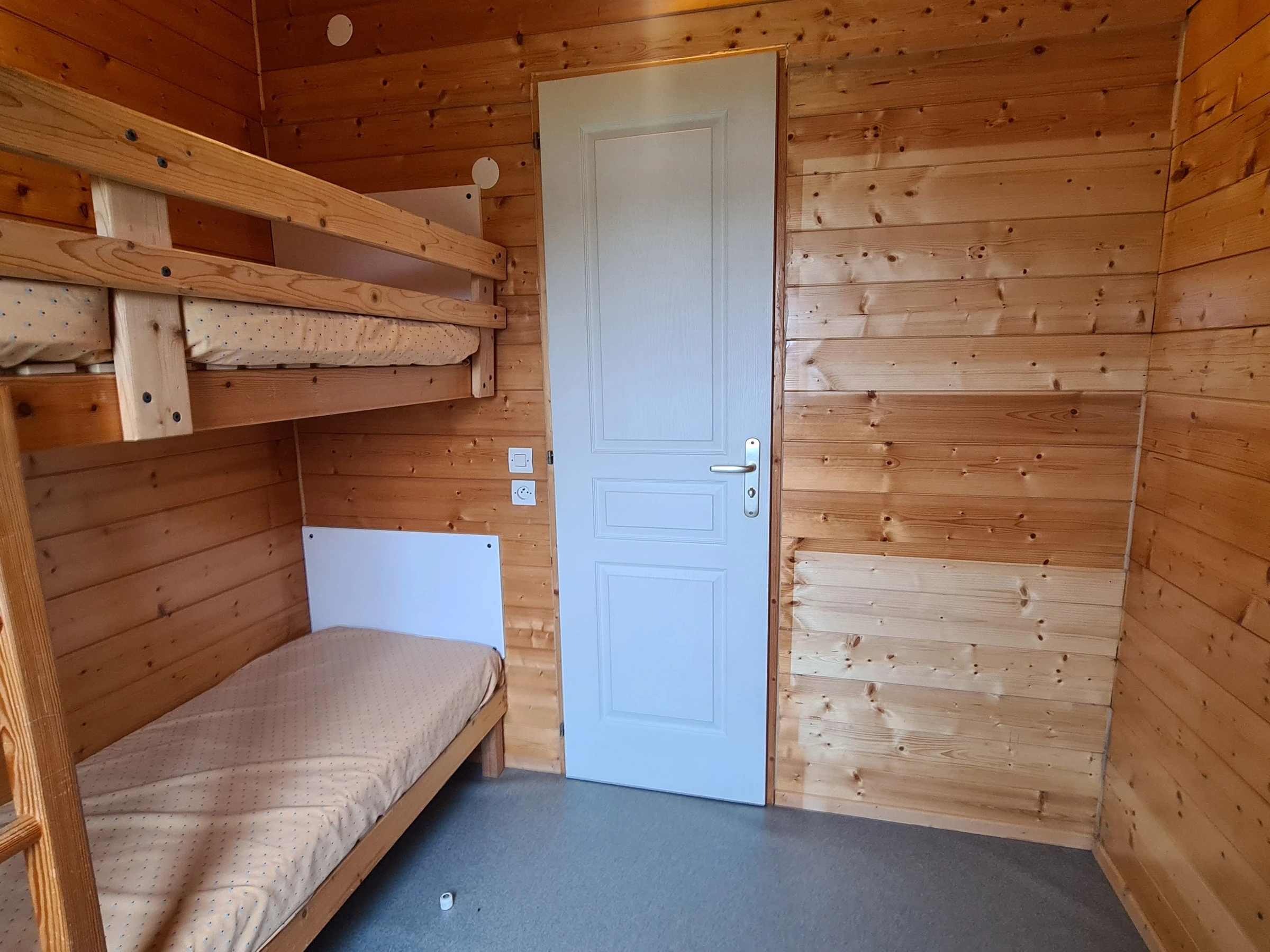 De plain-pied (3 marches pour accèder au chalet): cuisine équipée, coin repas et coin salon - 2 chambres (1 lit 2 personnes, 2 lits 80 cm superposés) - salle d'eau - wc. Un canapé-lit pour 2 personnes dans la pièce de vie.
