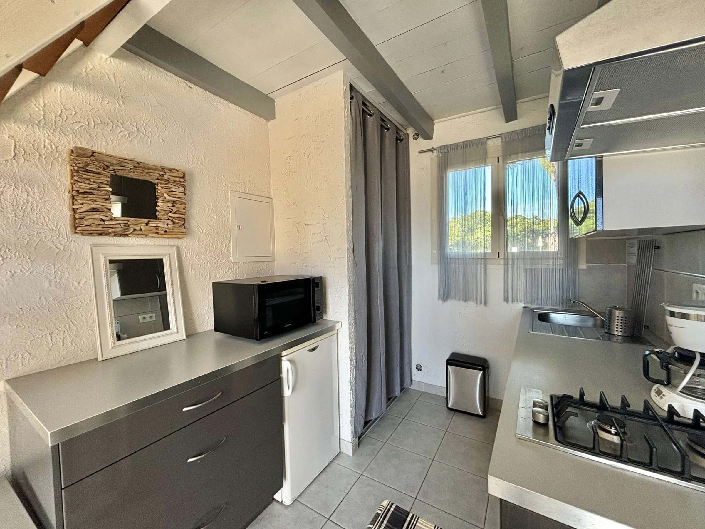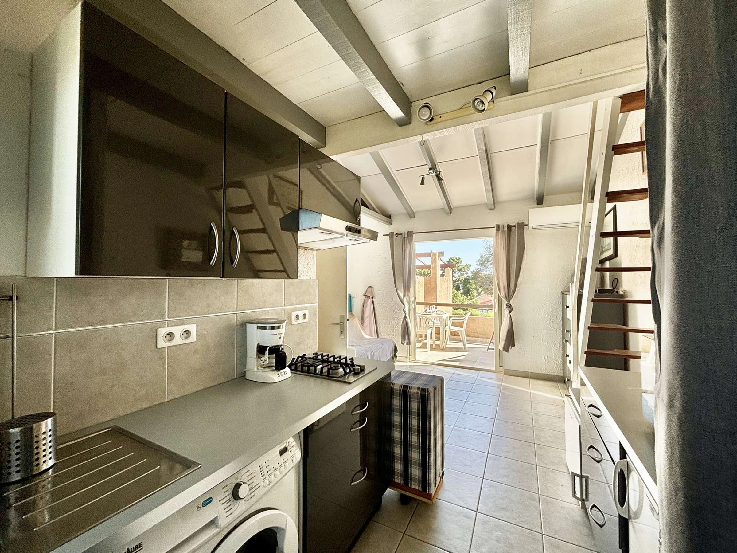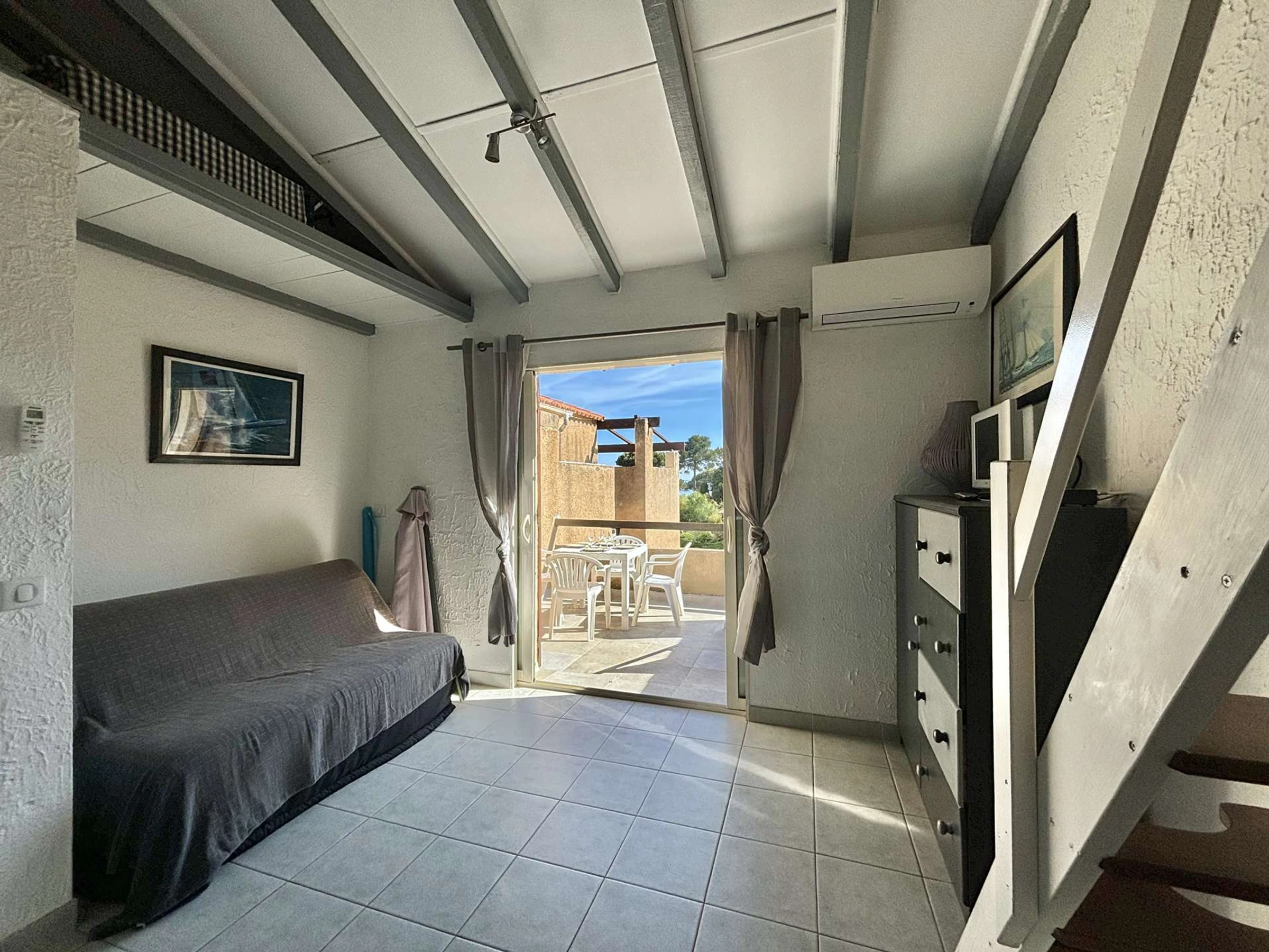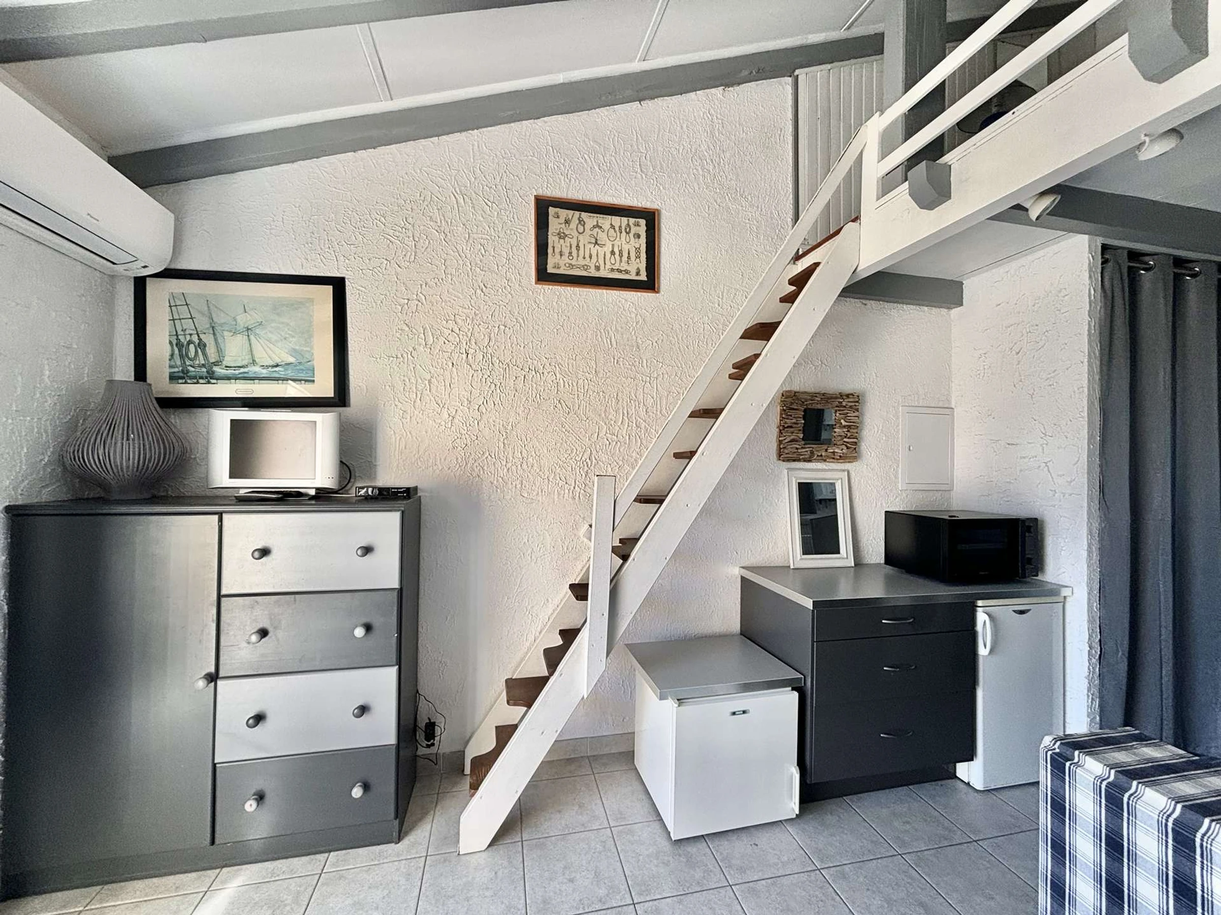 L'appartement, au premier étage est composé d'une cuisine aménagée ouverte sur un salon climatisé avec un canapé convertible, d'une salle d'eau, d'une mezzanine avec deux lits simples