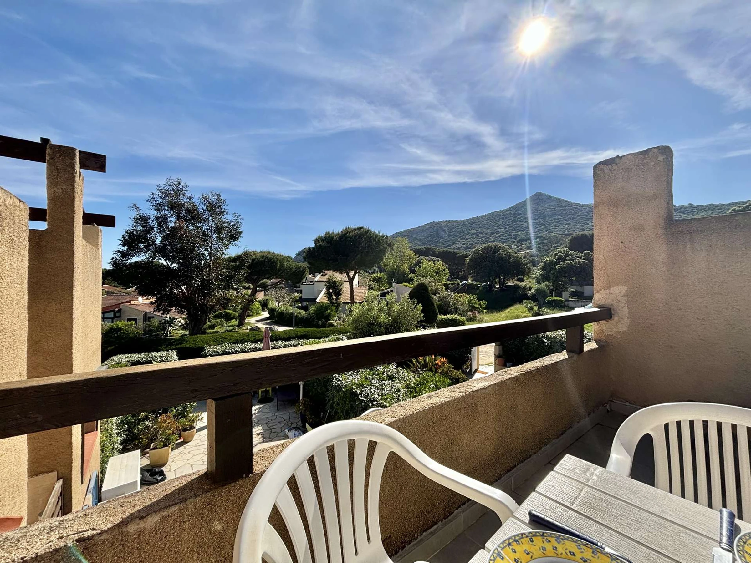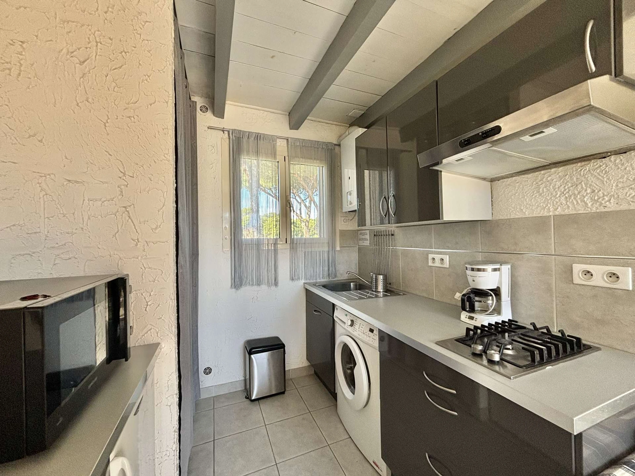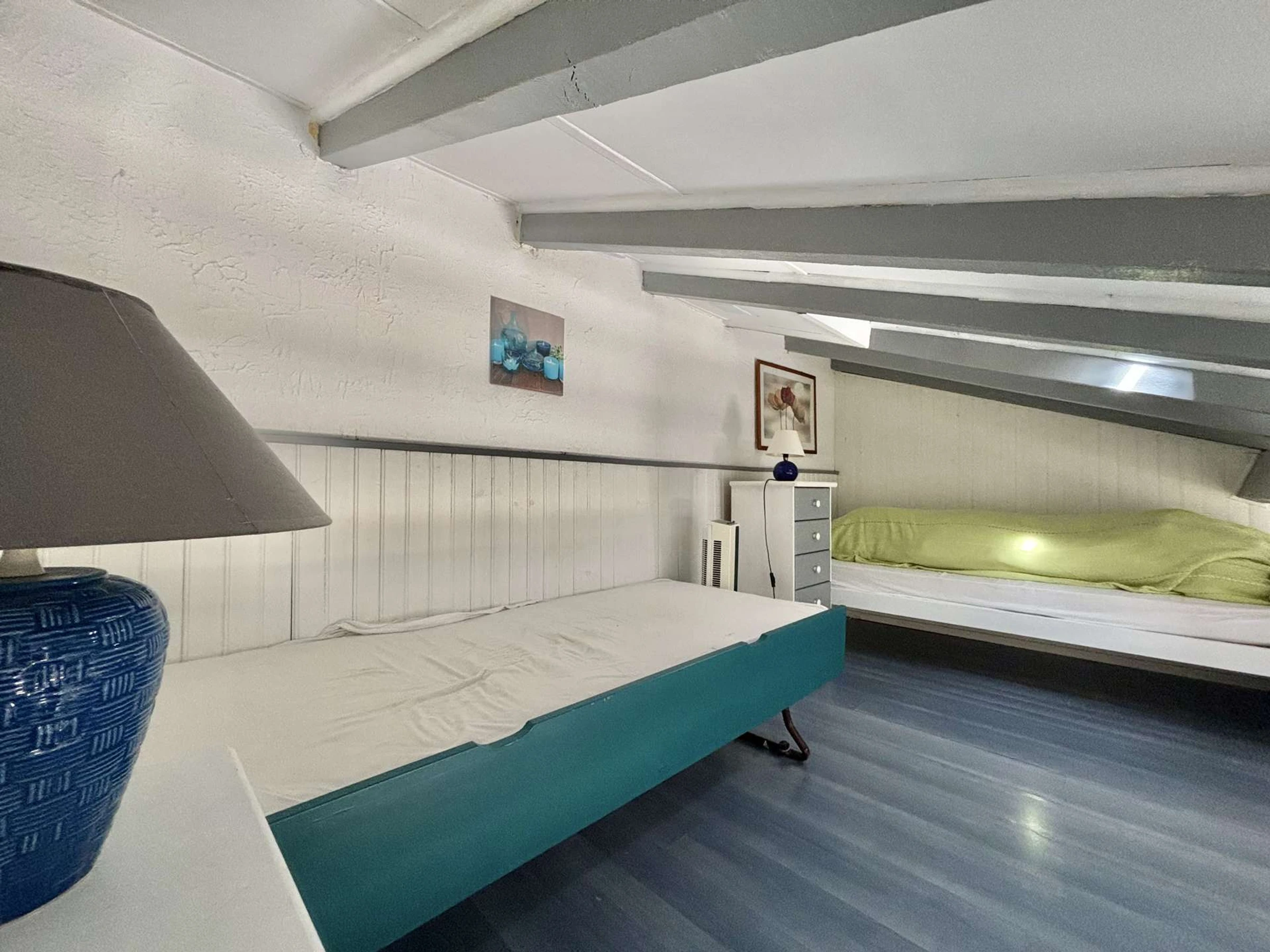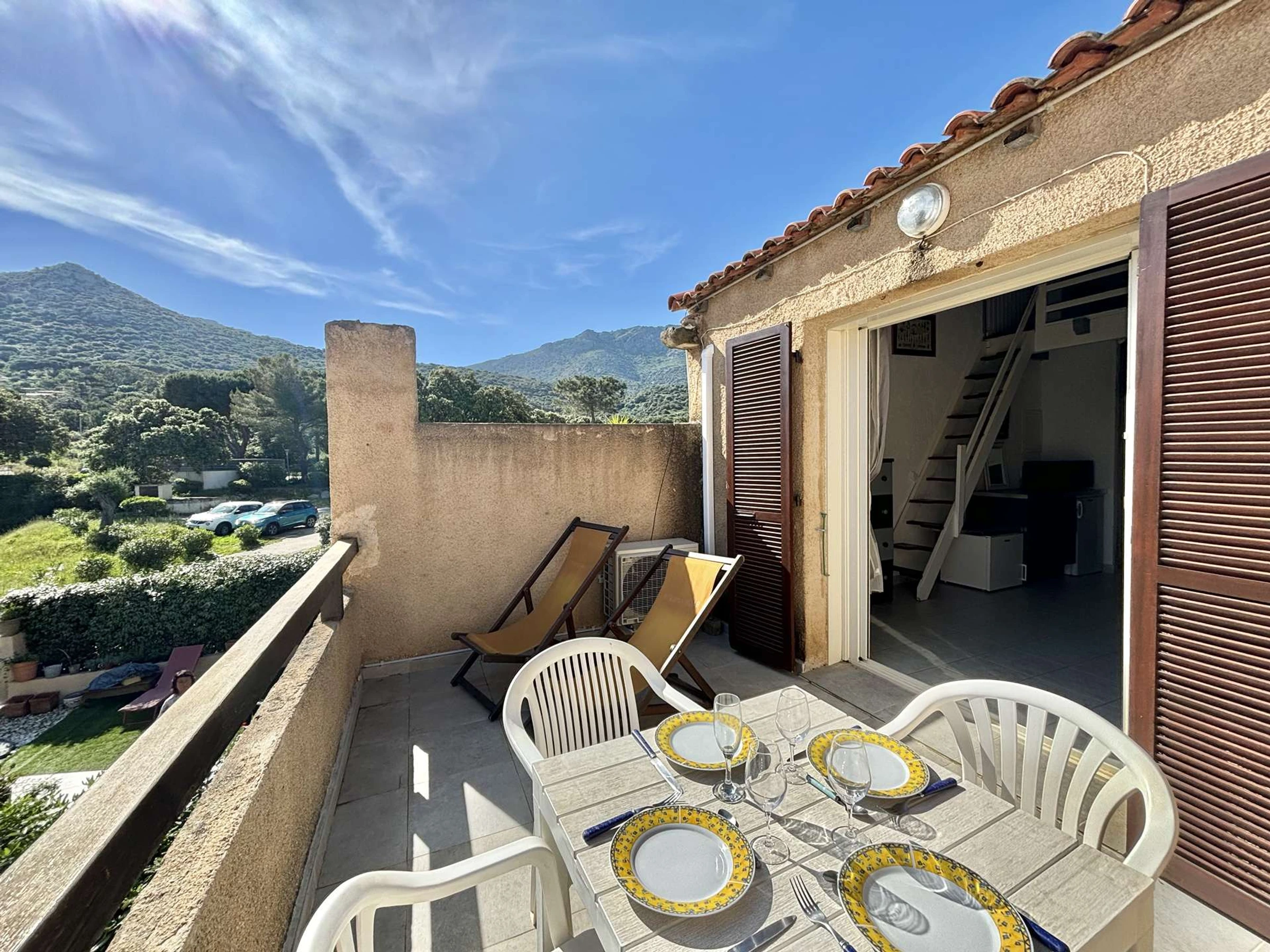 L'appartement, au premier étage est composé d'une cuisine aménagée ouverte sur un salon climatisé avec un canapé convertible, d'une salle d'eau, d'une mezzanine avec deux lits simples