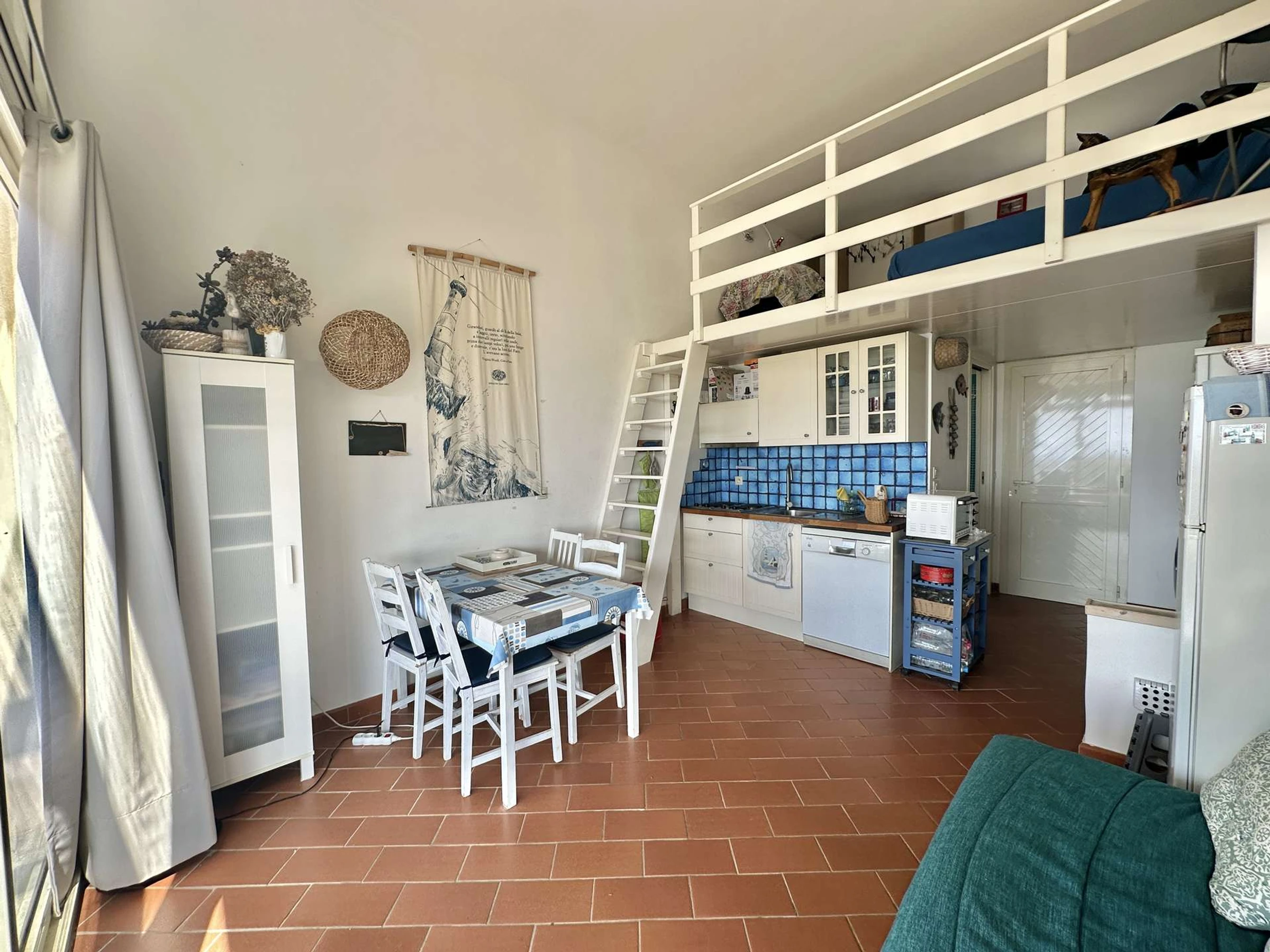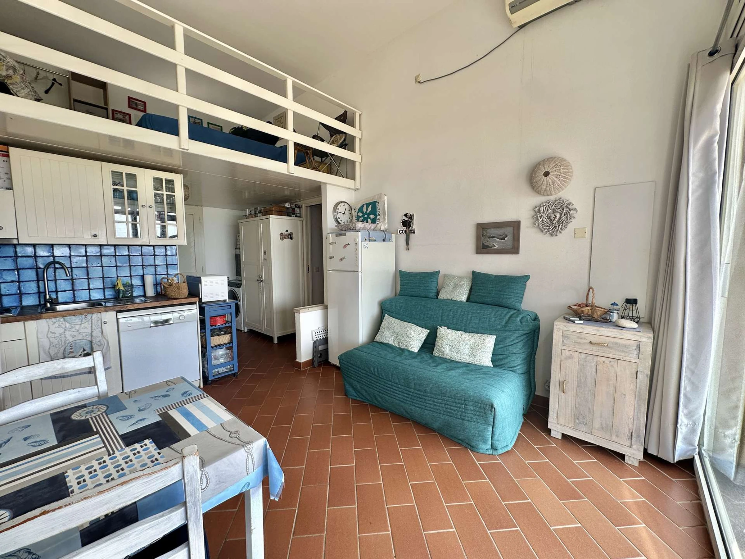 L' appartement, au rez-de-chaussée est composé d'une cuisine équipée, d'un salon avec un canapé lit, d'une salle d'eau avec WC, d'une chambre avec un lit double, d'une mezzanine avec un lit double.