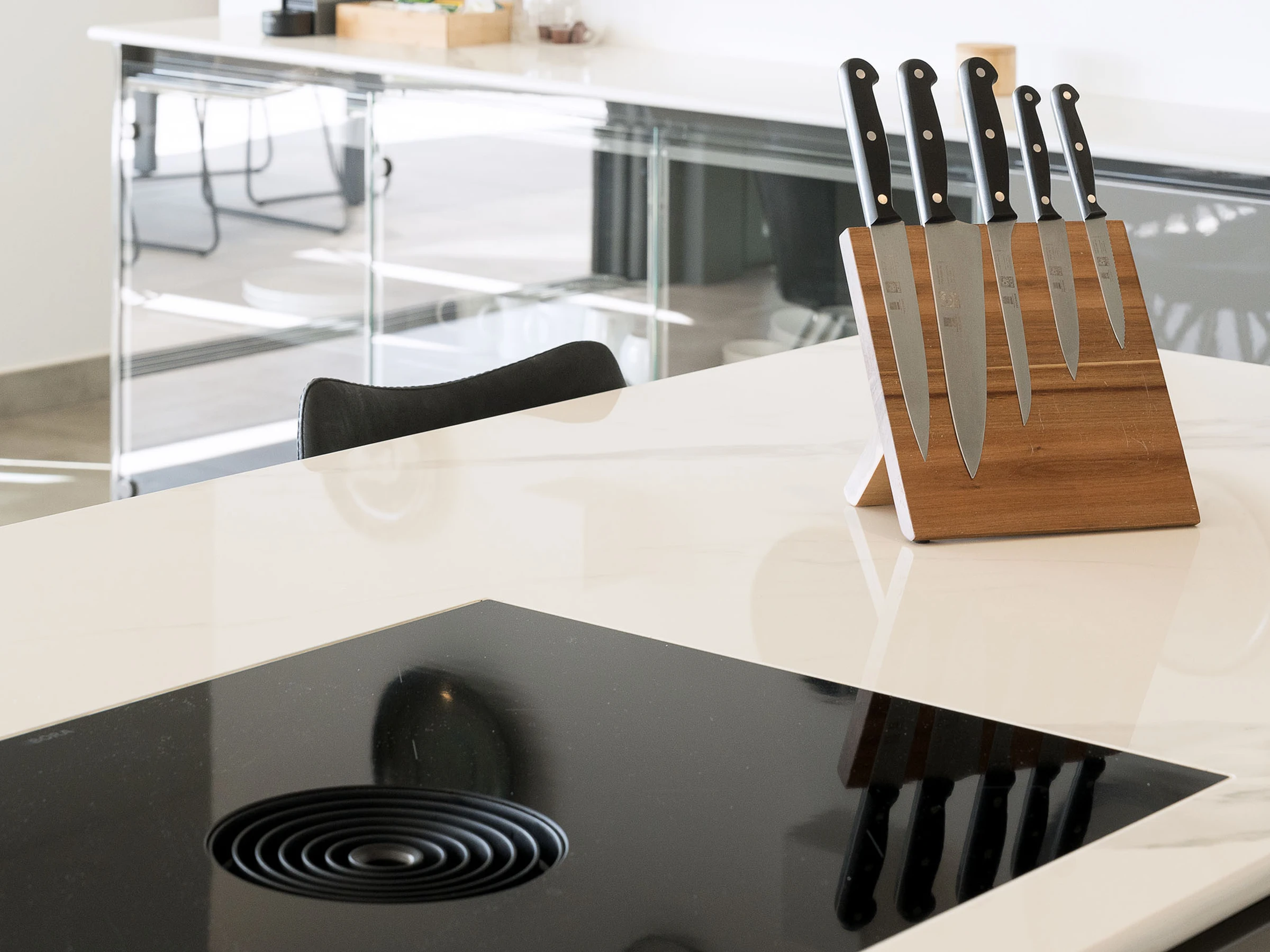 La cuisine américaine, à induction, est équipée avec réfrigérateur, micro-ondes, four, congélateur, lave-vaisselle, vaisselle/couverts, ustensiles/cuisine, cafetière, grille pain, bouilloire et equipement de cuisine.