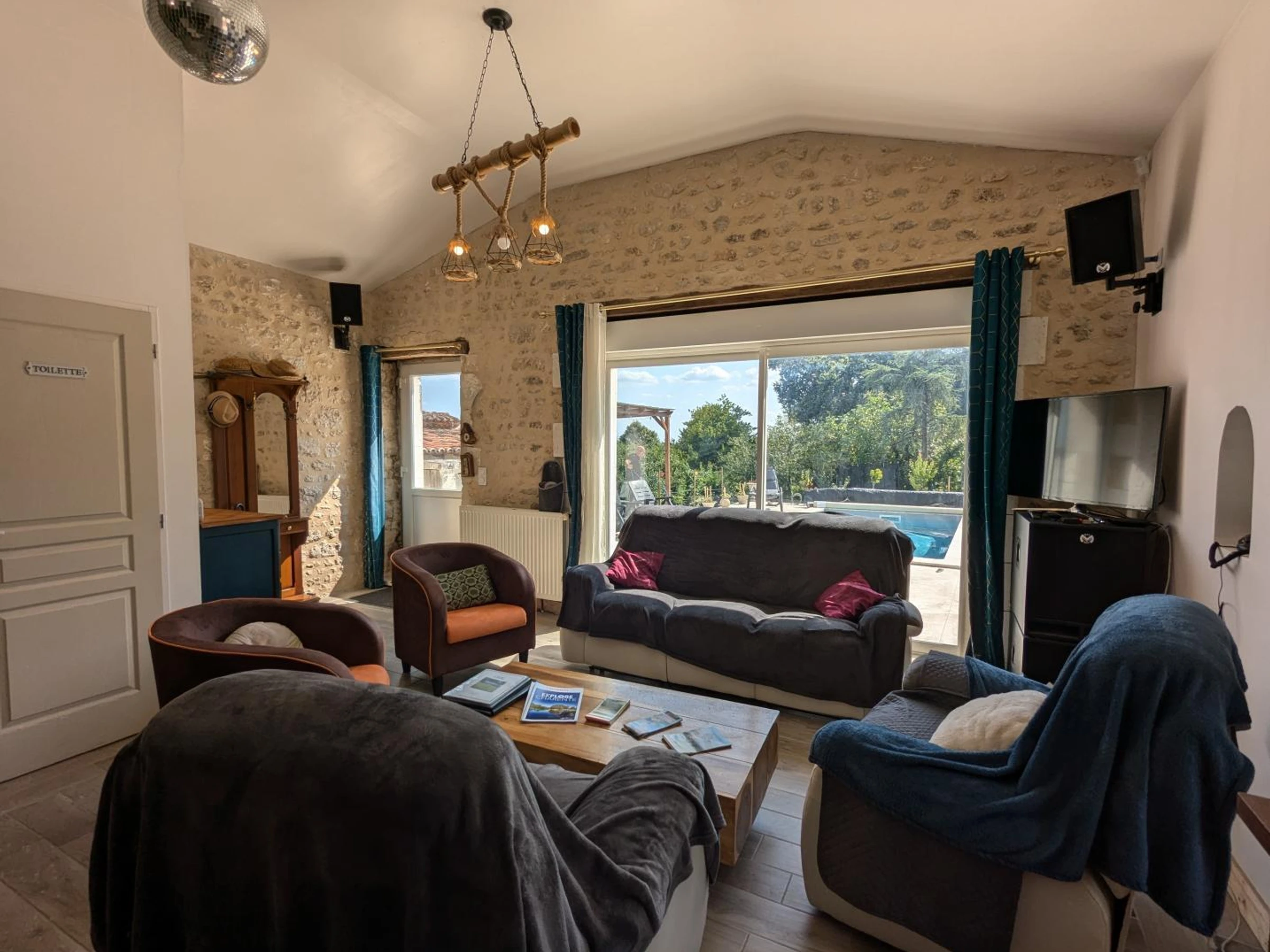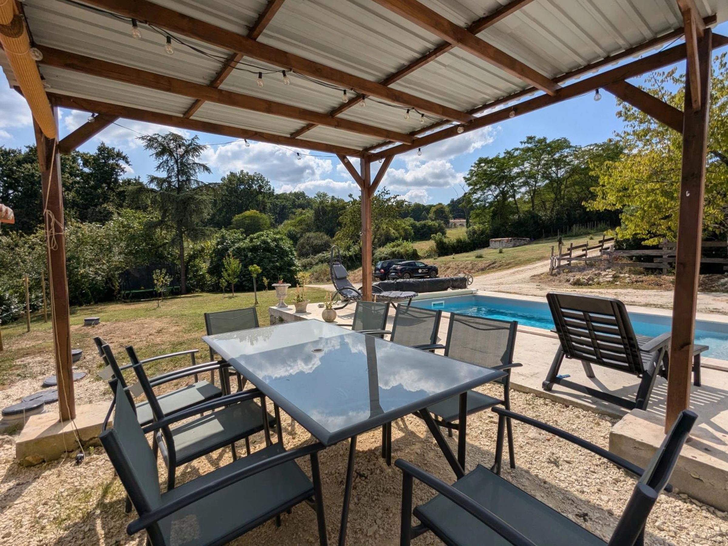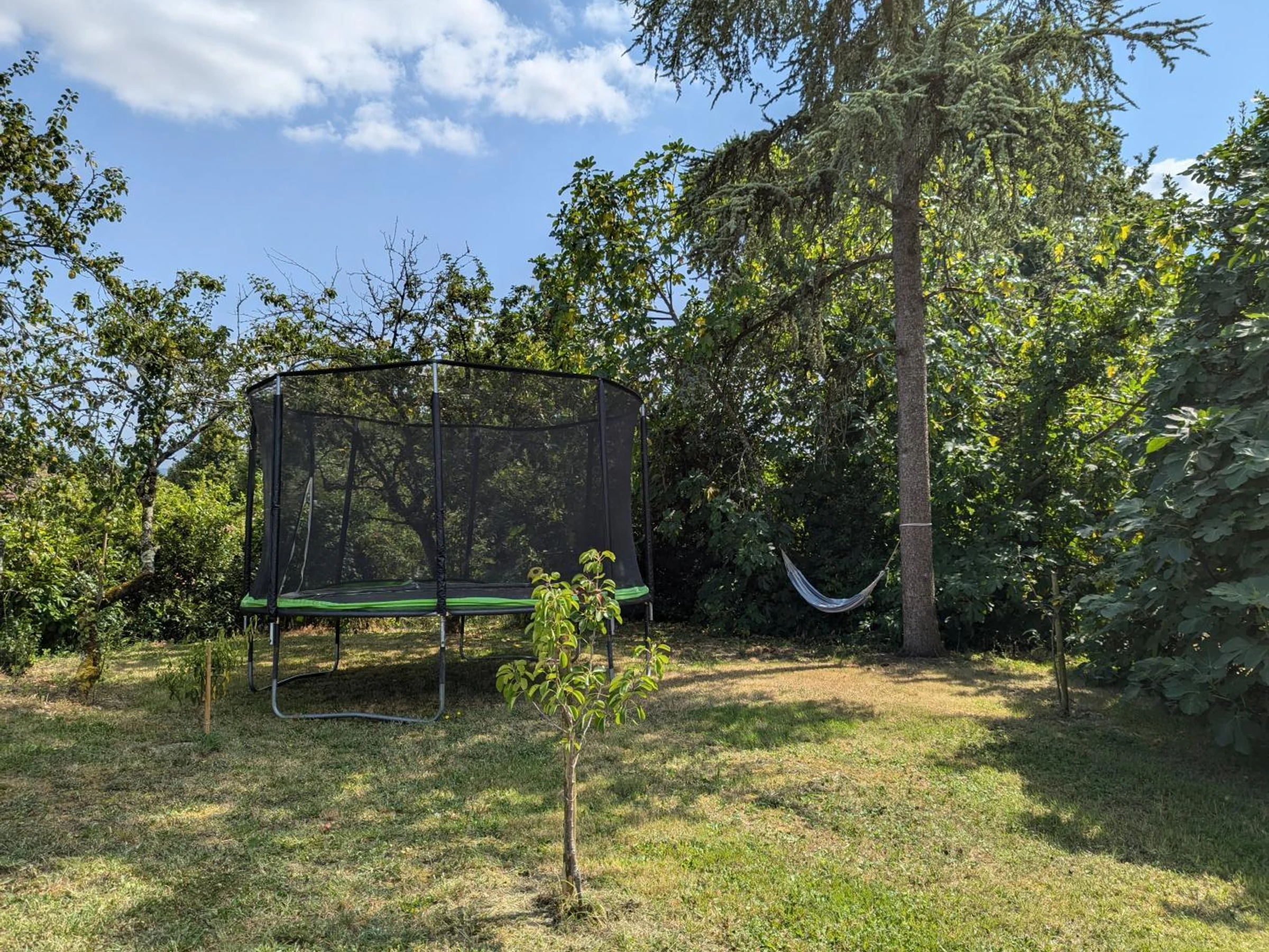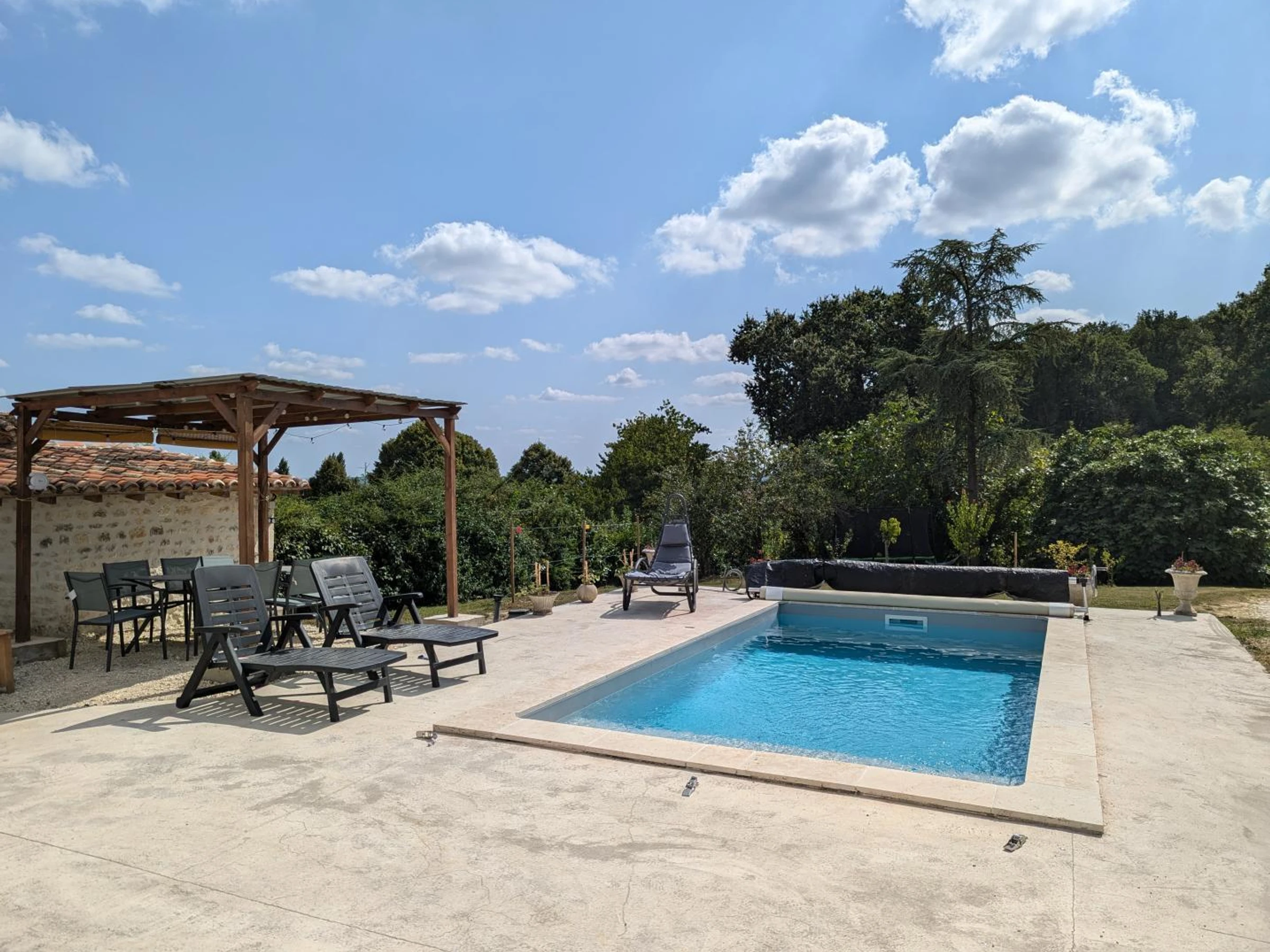 En extérieur : terrasse privative de 70 m² avec piscine privative de 3 x 6 mètres, protégée par une bâche à barres, profondeur 1,35 m, ouverte du 1er mai au 30 septembre, une mare avec carpes koï non sécurisée, un vaste jardin arboré de 3000 m² avec hamac et trampoline, BBQ et salon de jardin.