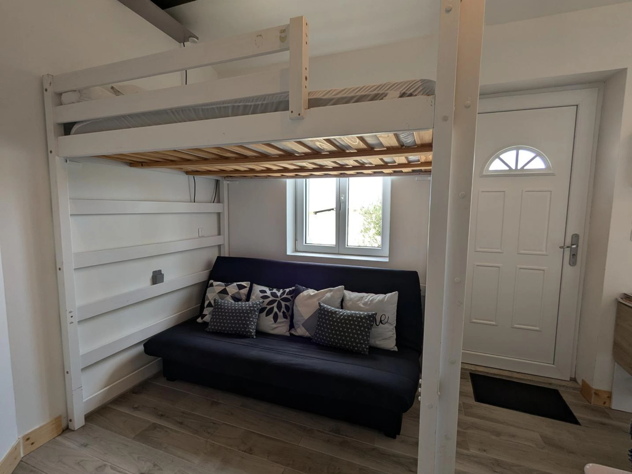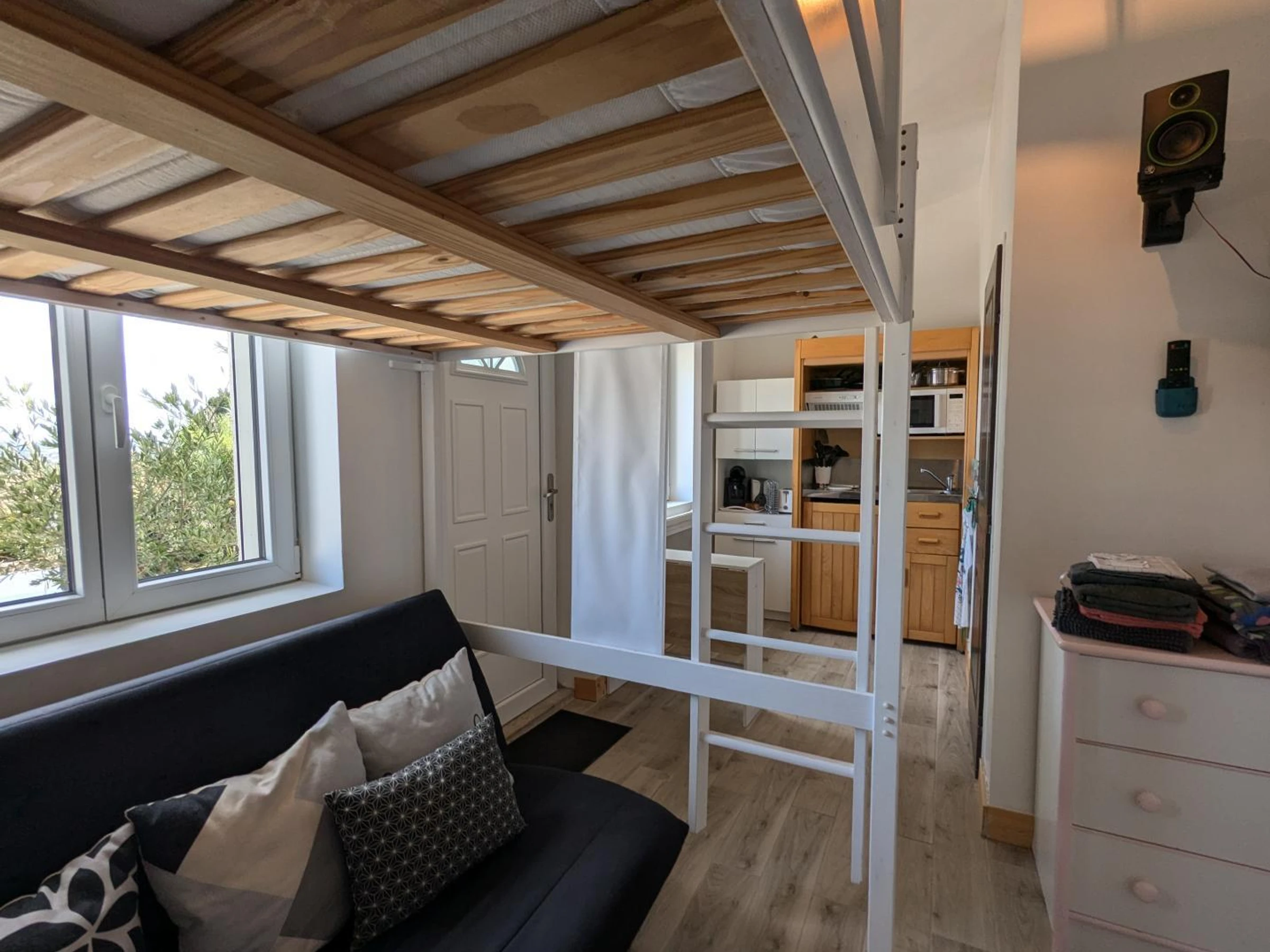 Studio à 50m équipé d'un coin nuit avec canapé 140x190 et d'un lit superposé, une kitchenette et une salle d'eau avec WC.