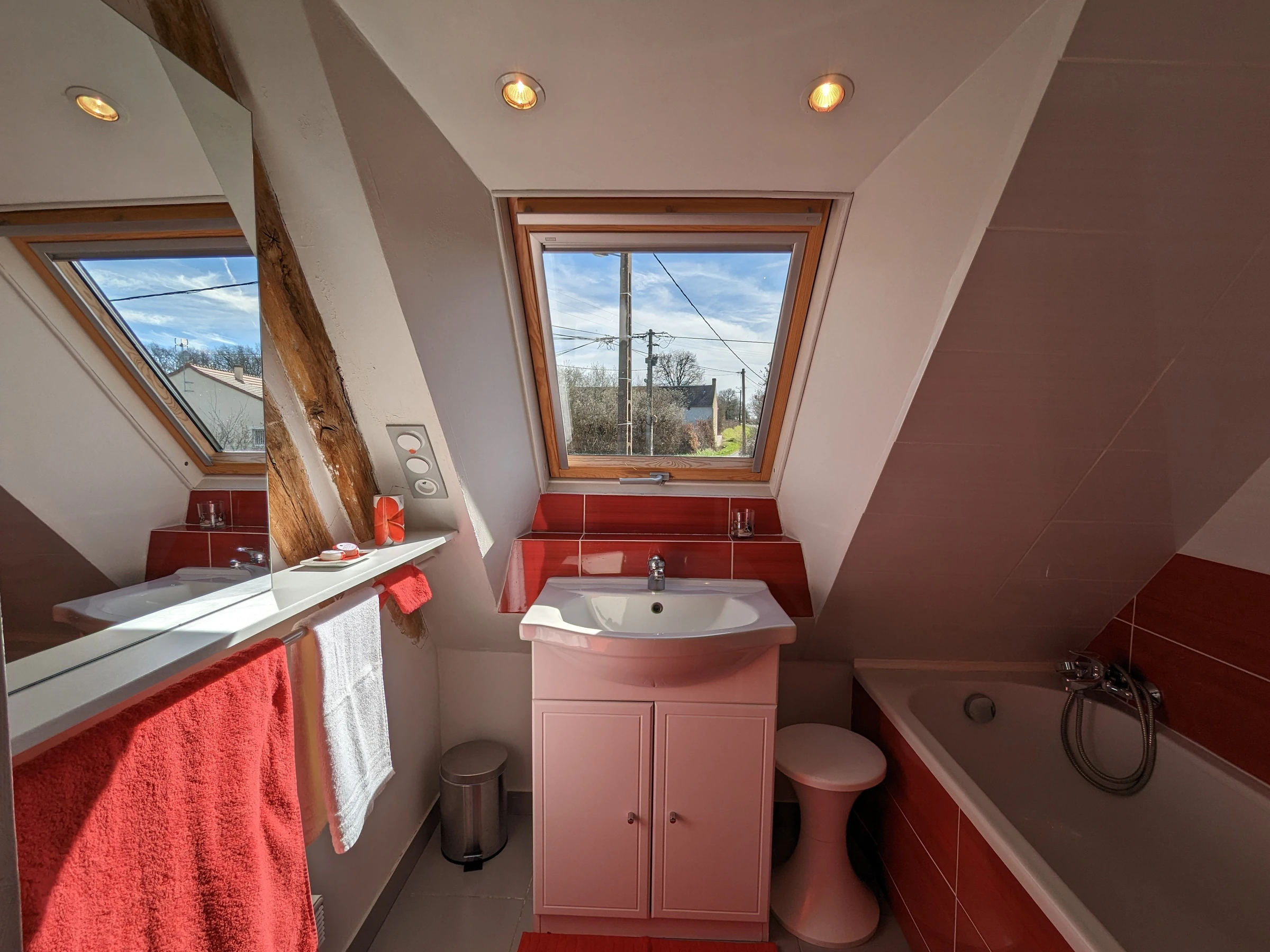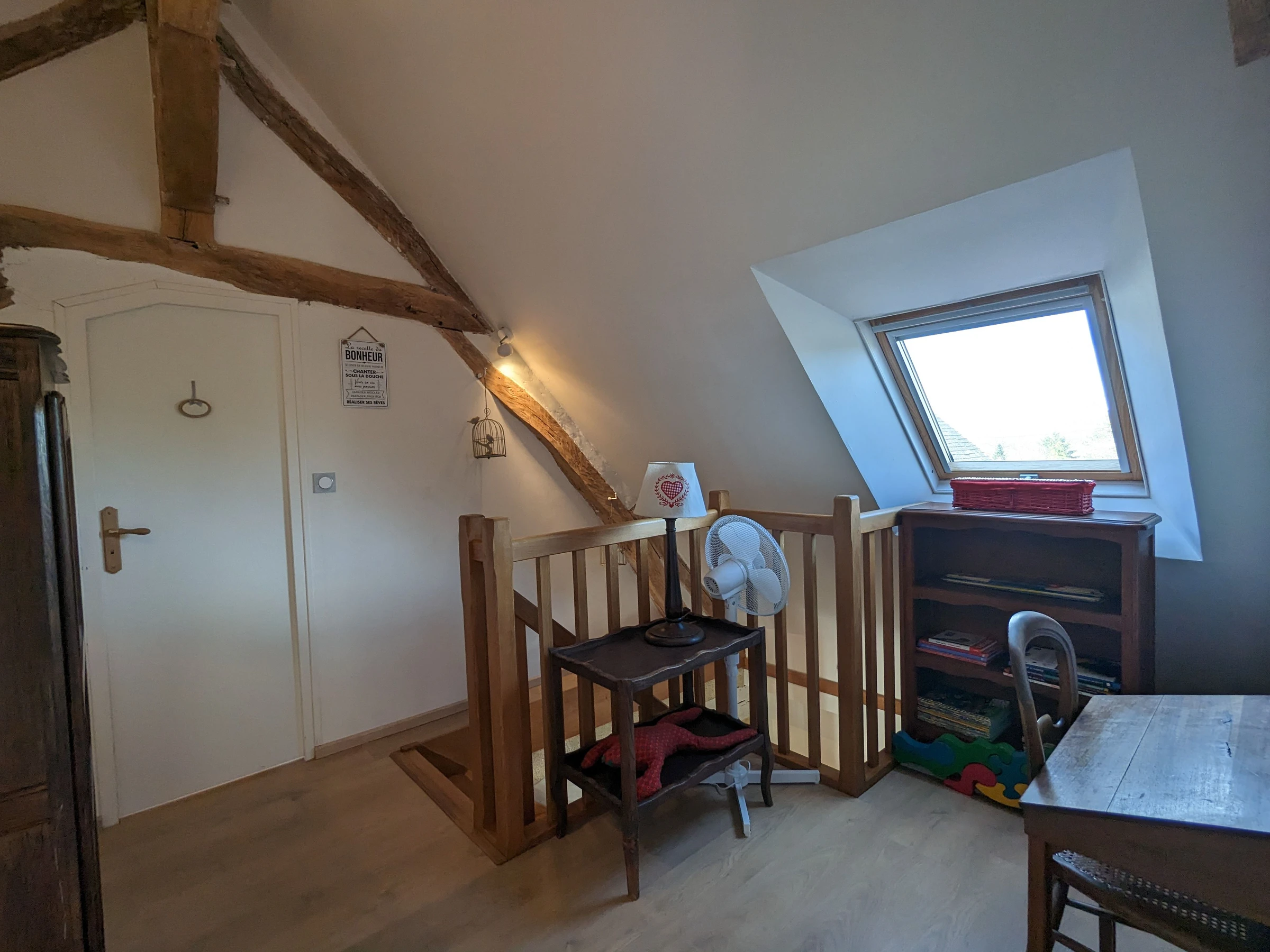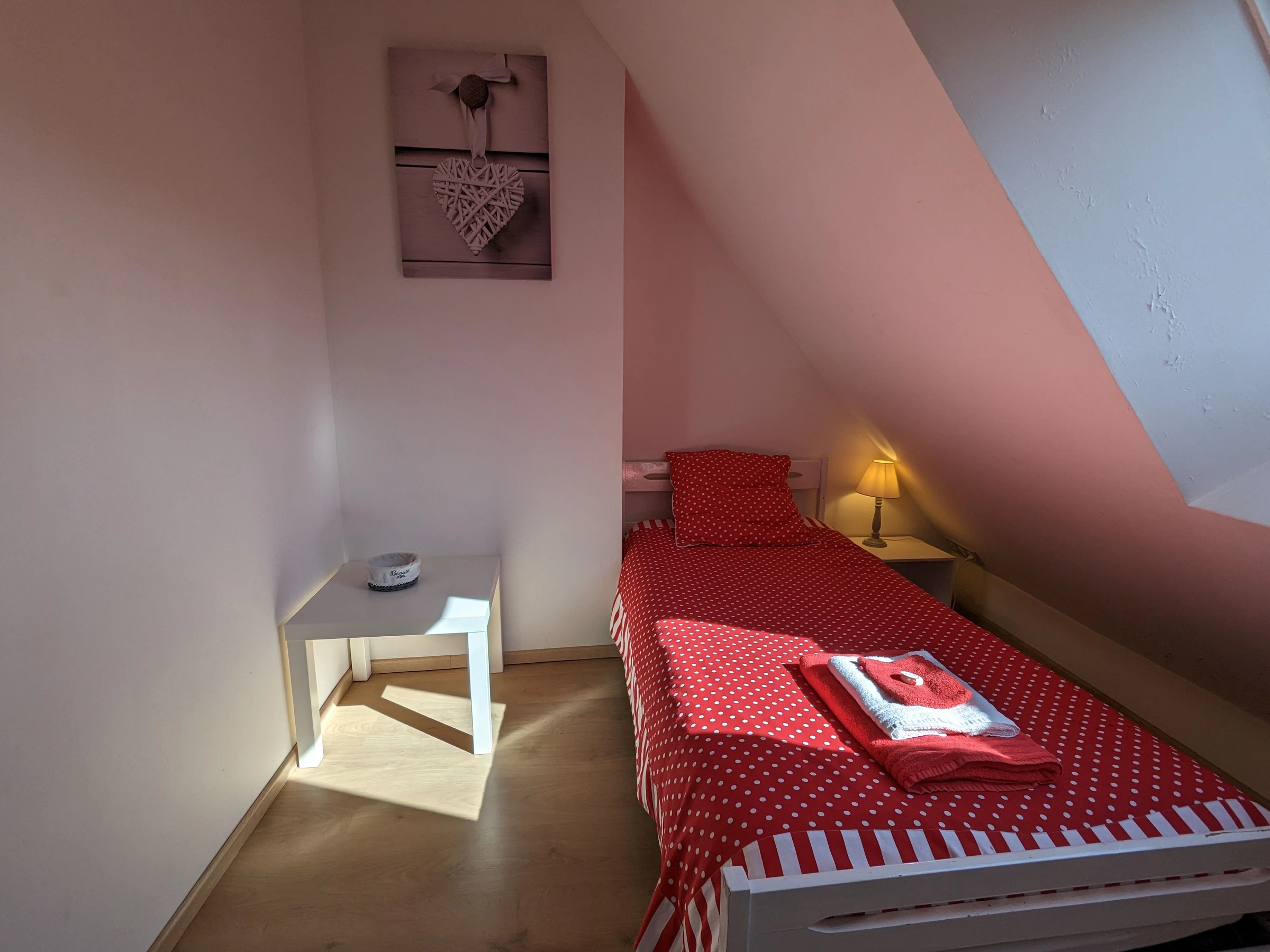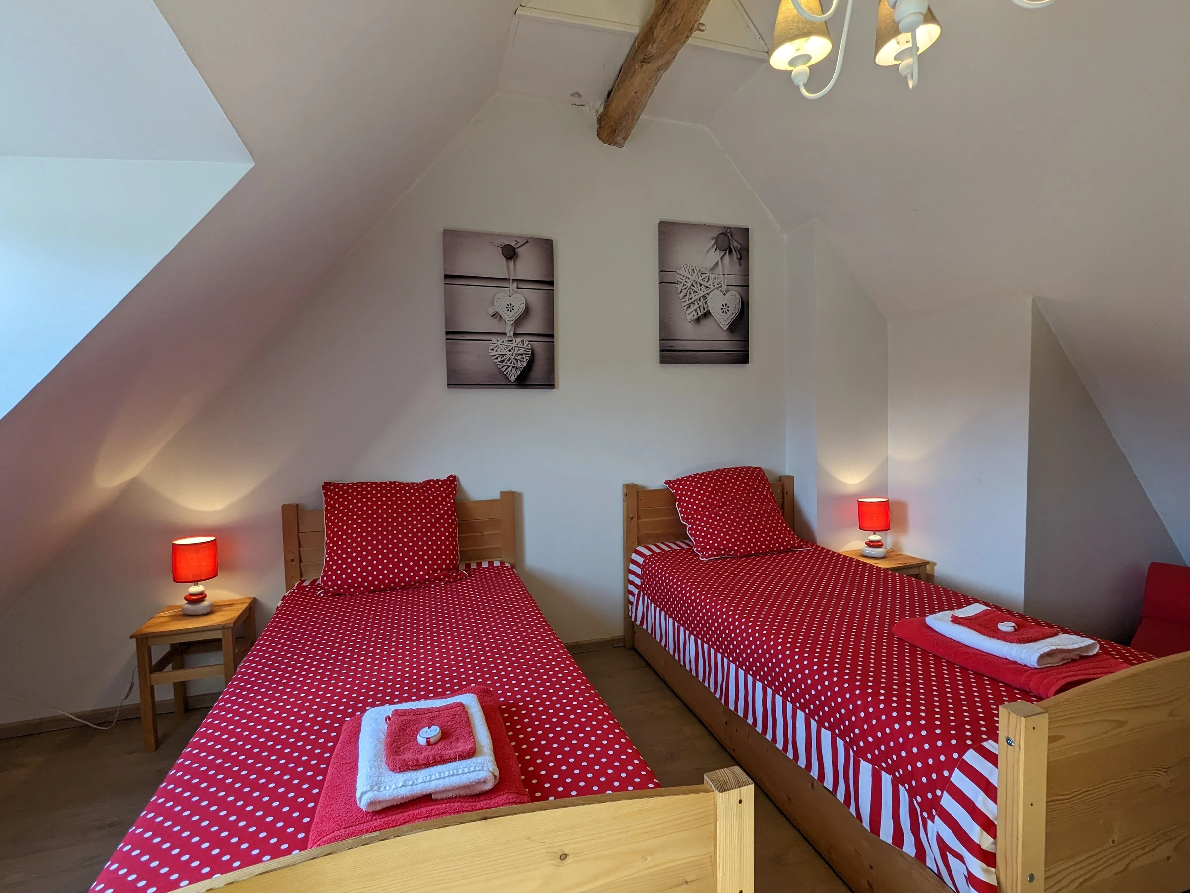 Au 1er étage : 1 chambre (2 lits de 90cm pouvant être rapprochés pour faire un lit 2 personnes), 1 chambre (1 lit de 90cm), 1 chambre (1 lit de 90cm + 1 lit bébé à barreaux), salle de bain et wc indépendants.